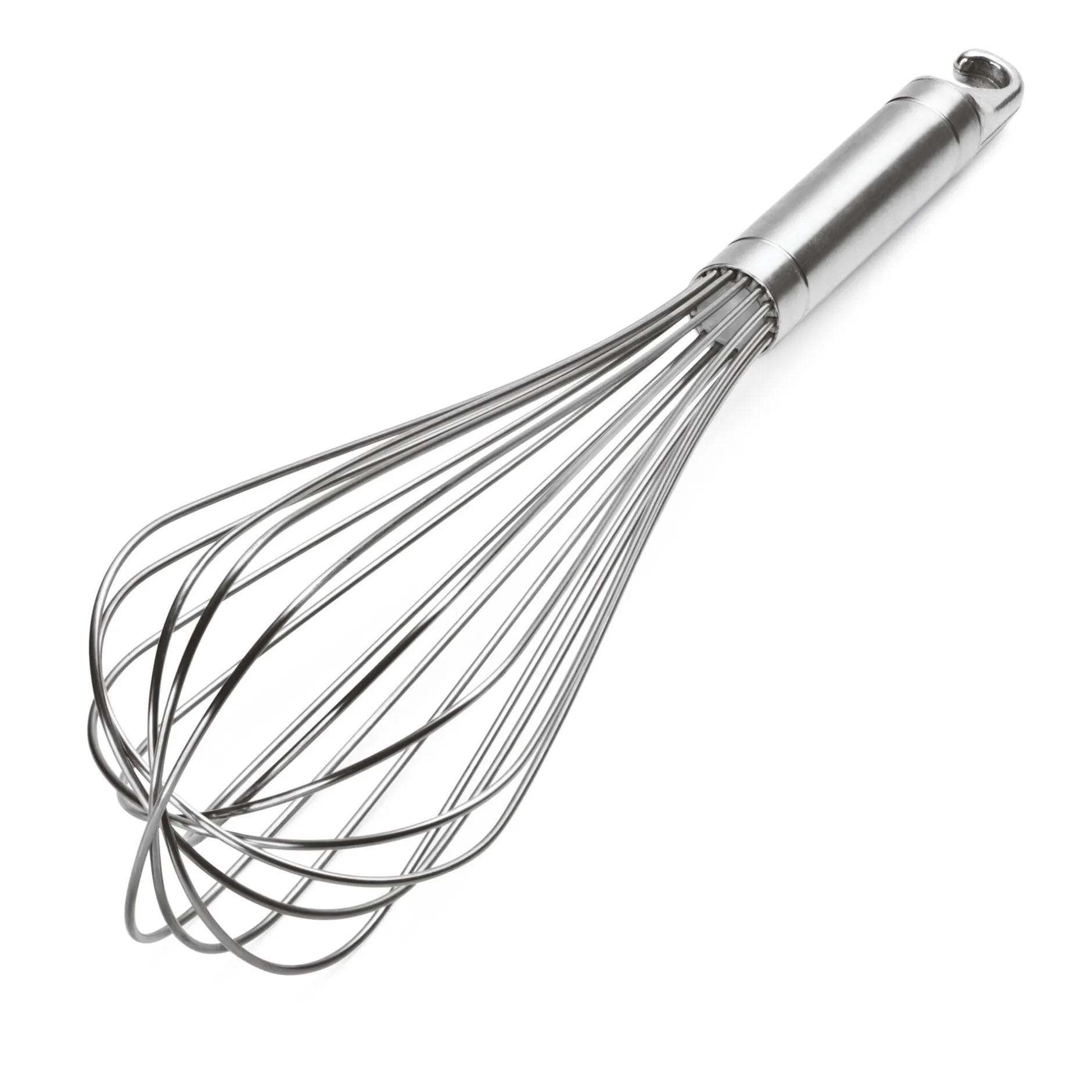 Aus dem gewerblichen Bedarf. Die Drähte aus Edelstahl sind fest in Kunststoff eingelassen. Aus Aluminiumguss sind die Haken, die das sichere „Ablegen“ der Schneebesen an Schüssel- oder Topfrand und an der Hakenleiste ermöglichen.