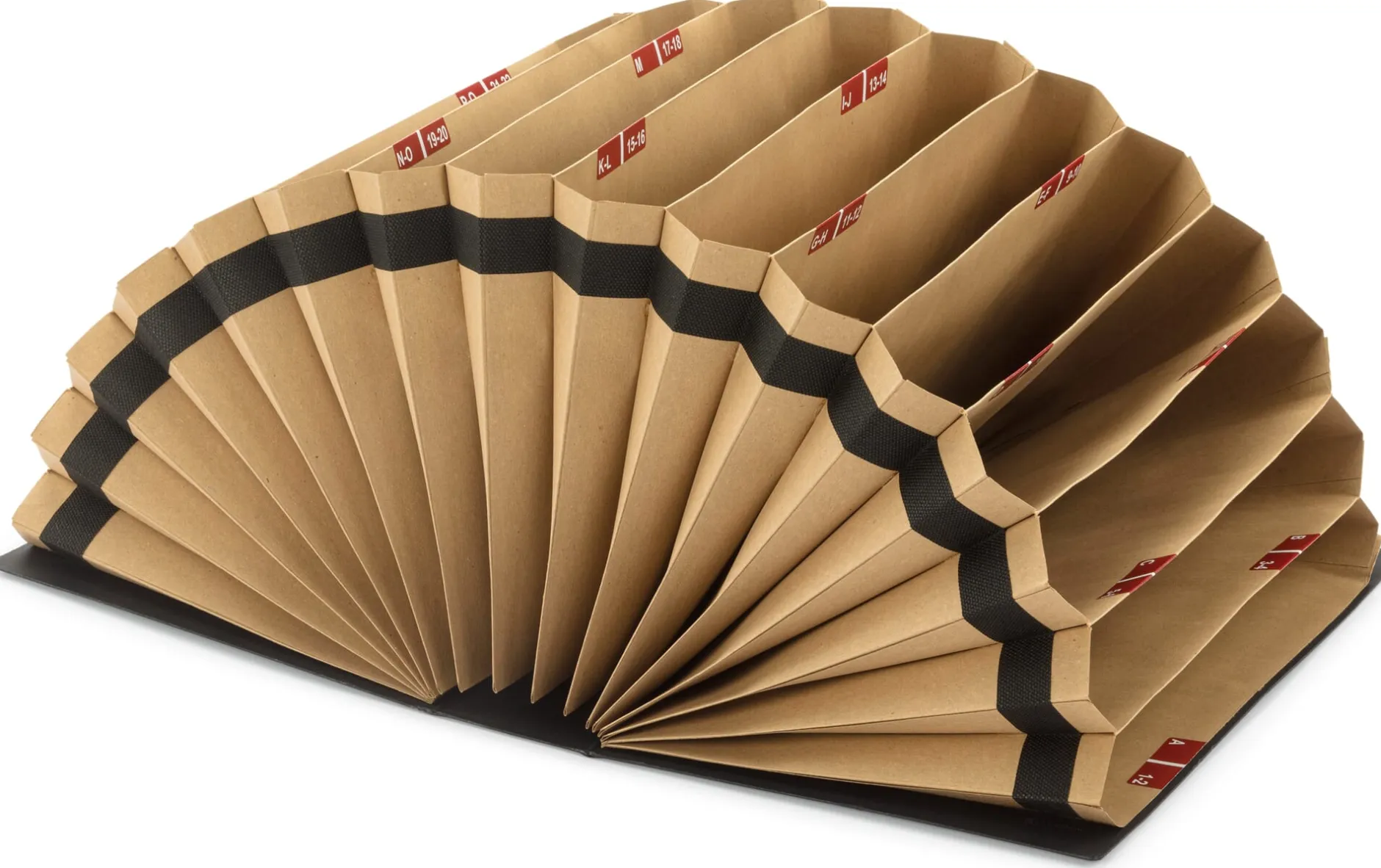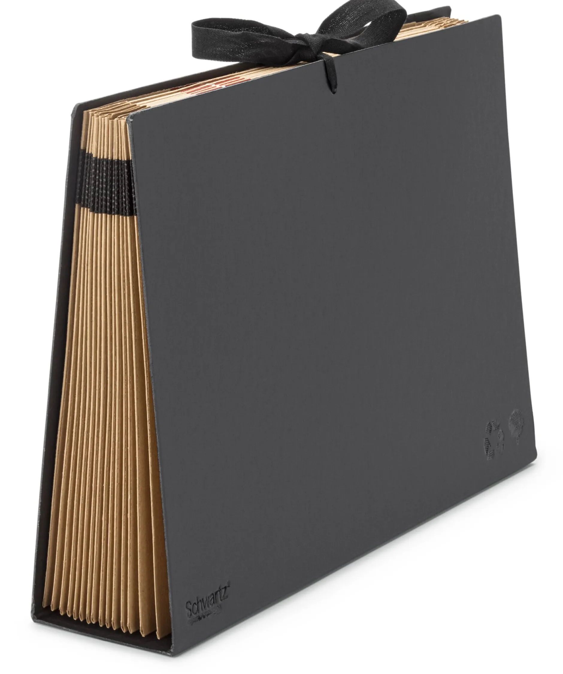Aus 1,6 mm starkem Karton. 16 Fächer aus Natronkraftpapier mit Registerbeschriftung (A–Z und 1–31). Mit Verschlussband. Für Papiere bis A4. Höhe 24,5 cm, Rückenlänge 36 cm, Rückenbreite 8 cm. Gewicht 910 g.