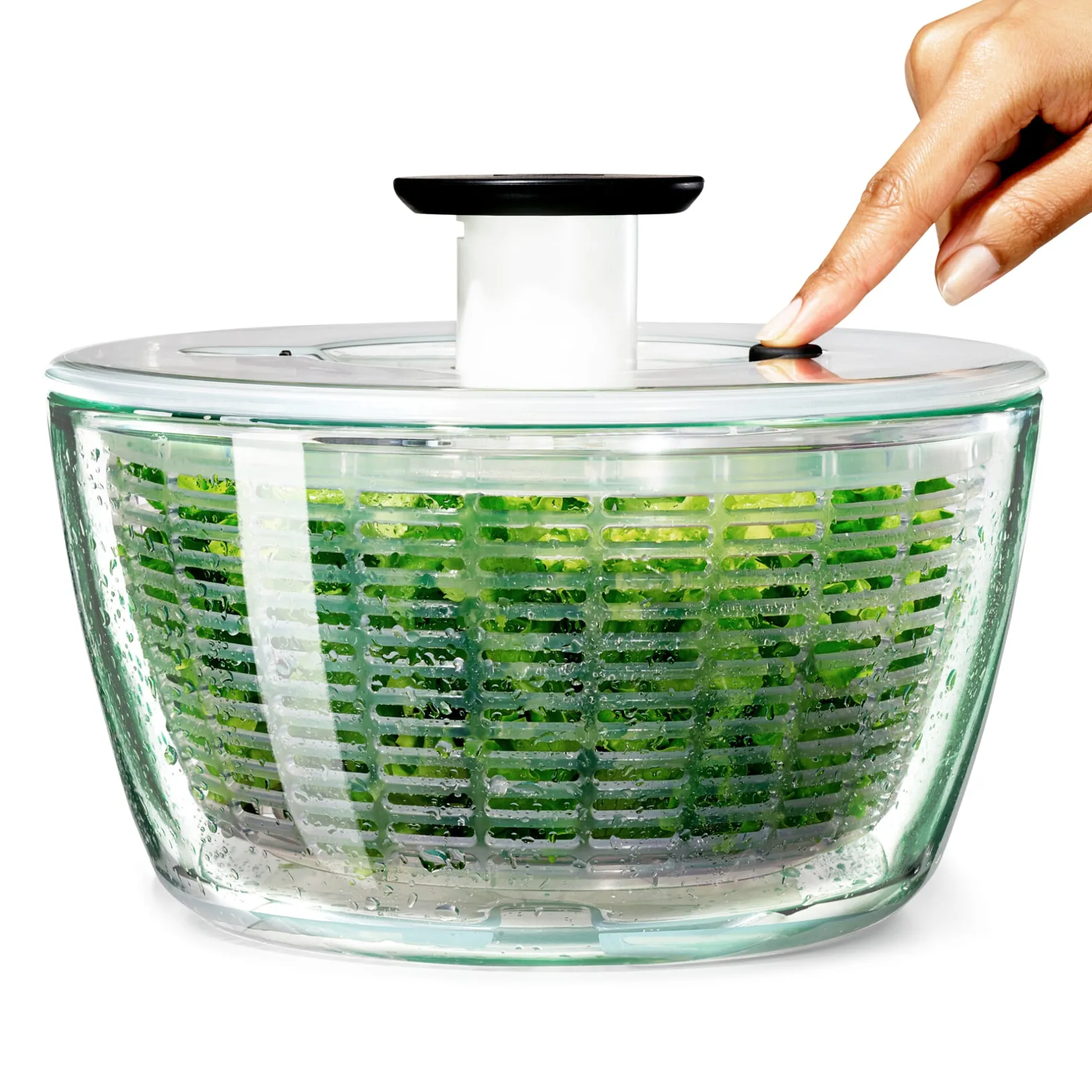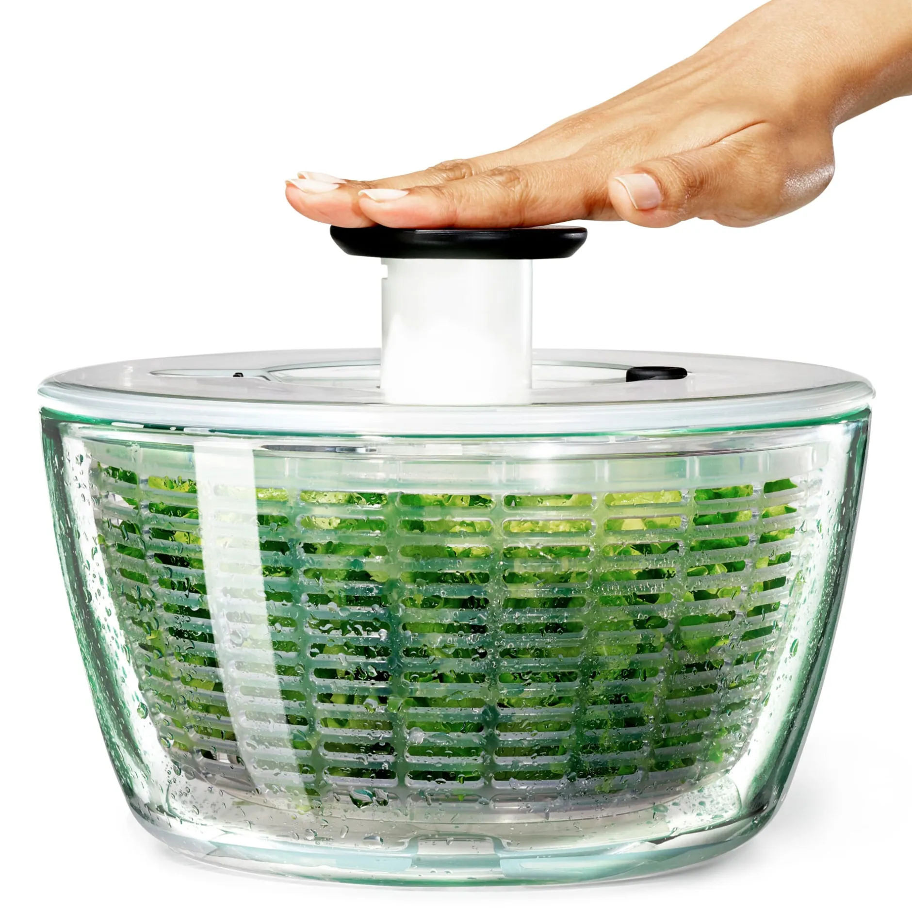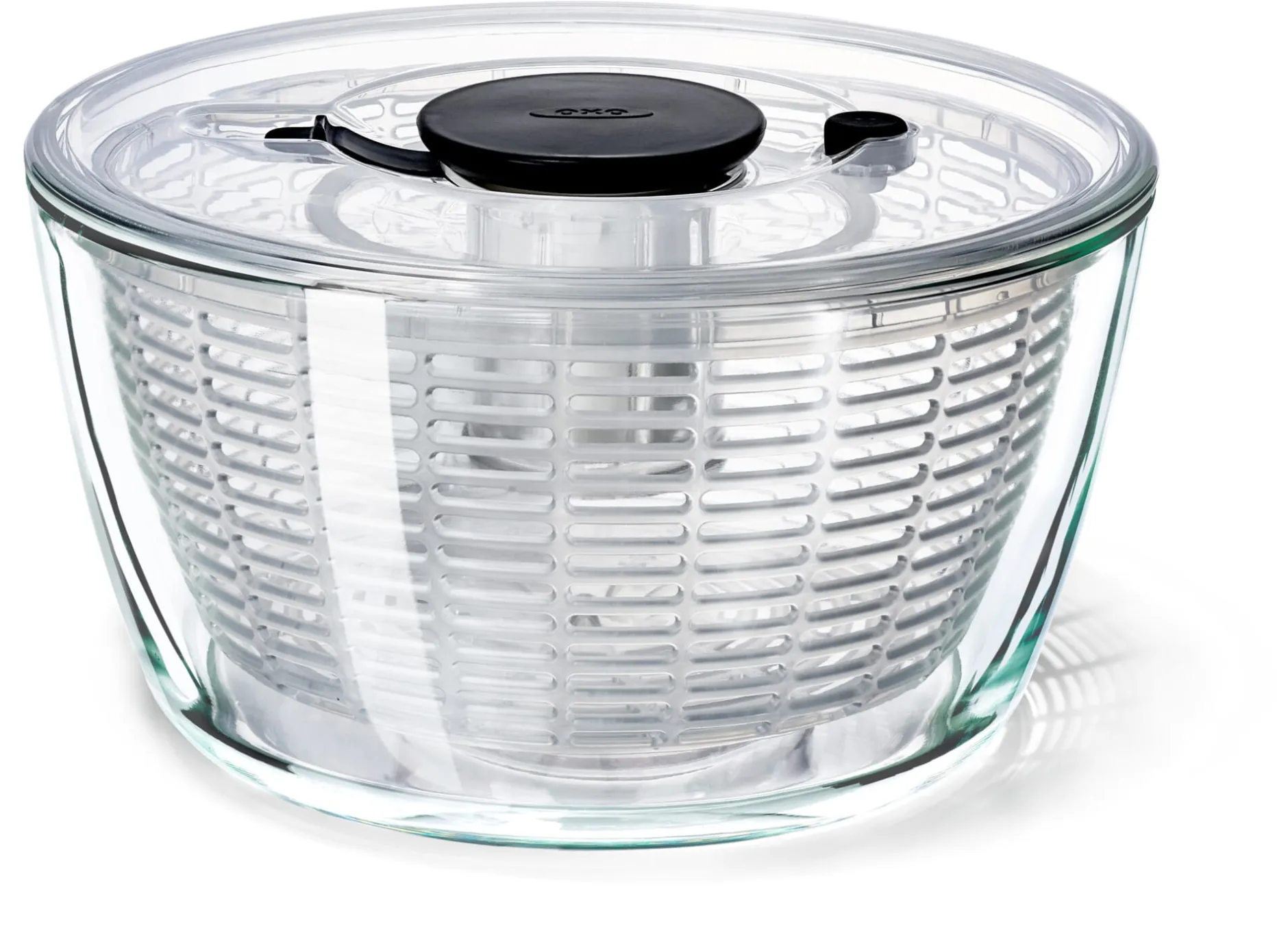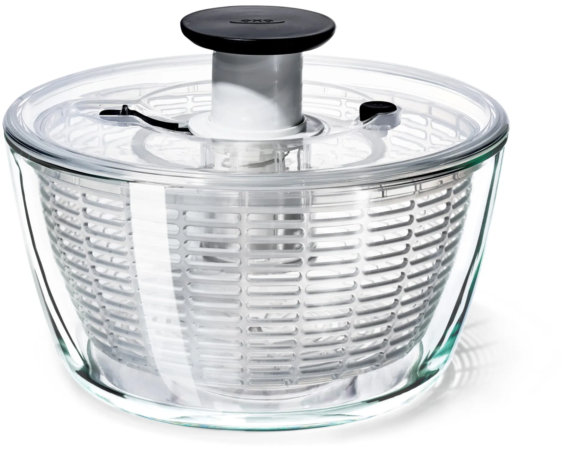 Große Salatschleuder mit Glas- oder Edelstahlschüssel: ROTOR 2.0 ist ausgestattet mit einem patentierten Pumpmechanismus – der Innenbehälter wird durch Drücken des Softgrip-Knopfs in Rotation versetzt. Die patentierte Bremse stoppt den Korb sofort mit einem einfachen Druck. Mühelos mit einer Hand zu bedienen und als Arbeitsgerät wie als Servierschüssel gleichermaßen nutzbar. Der zentral sitzende Knopf der Mechanik wird in der unteren Position zum platzsparenden Verstauen verriegelt. Der transparente Deckel lässt sich zum einfachen Reinigen demontieren. Für die Spülmaschine geeignet.