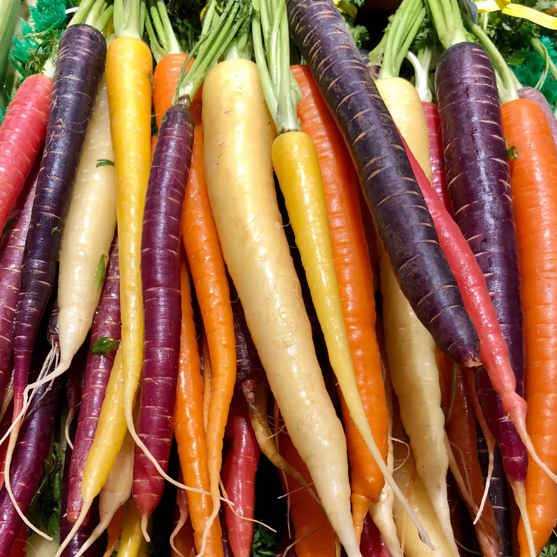 Eine Mischung aus seltenen historischen Möhren: weiße, gelbe und rote sowie die bekannten orangefarbenen.