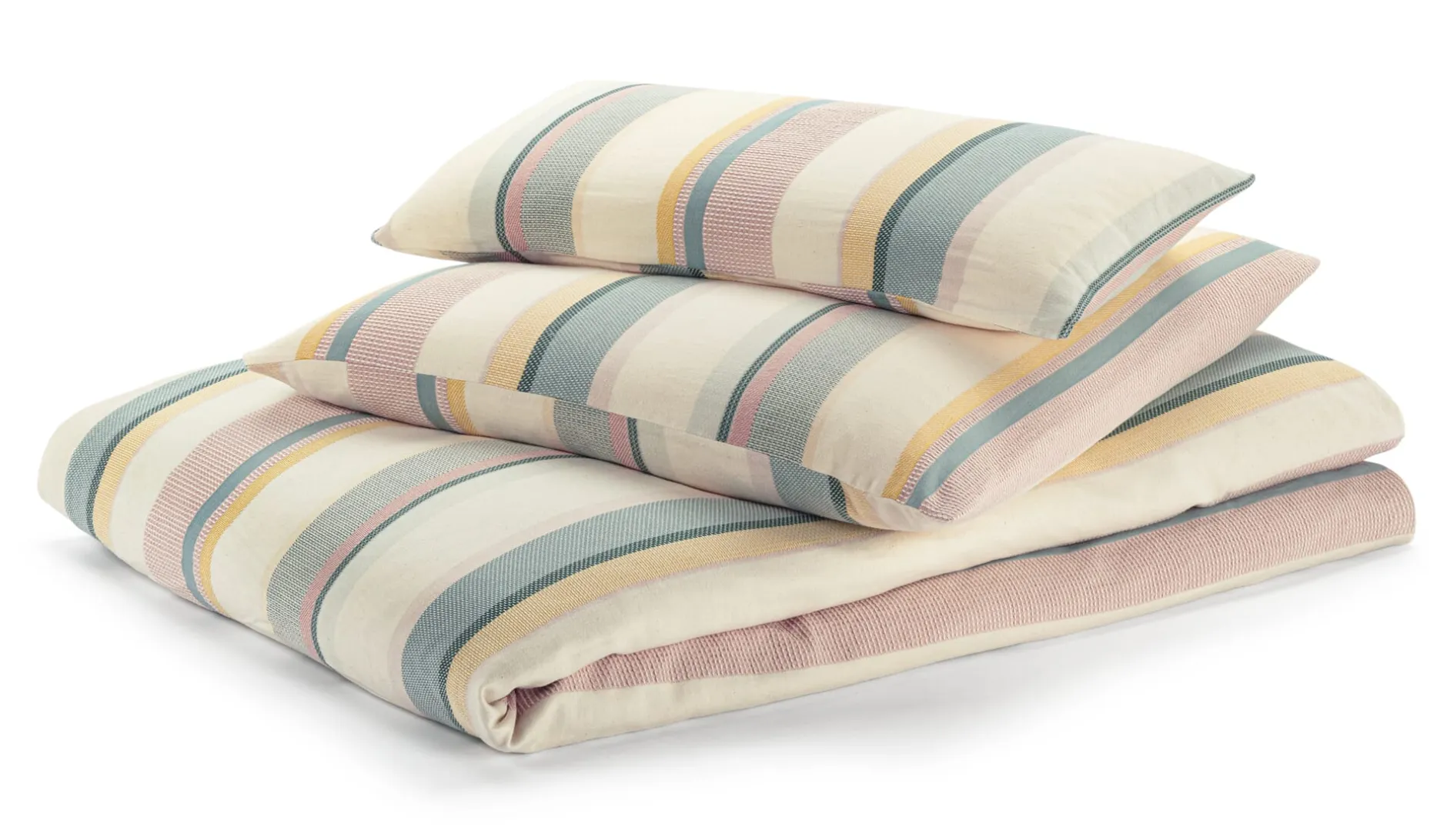 Diese Bettwäsche hat uns doppelt beeindruckt: Zum einen wird hier gewaschene Baumwolle verwendet, wodurch die Wäsche unglaublich weich und hautfreundlich ist. Sie besitzt mit 250 g/qm ein für Bettwäschen recht hohes Materialgewicht und ist deswegen besonders im Winter angenehm und wärmt zusätzlich. Zum anderen überraschen die Streifen nicht nur mit der gelungenen Farbkombination, sondern auch durch ihre Webart. Denn im Unterschied zum köperbindigen Fond mit seinem diagonalen Webbild sind die Streifen meist in anderen Bindungen, zum Beispiel in Waffel- oder Leinwandbindung, gewebt. Dies verleiht dem Gewebe eine strukturierte Oberfläche, dennoch liegt es dank der verwendeten feinen Baumwollgarne angenehm weich auf der Haut. Für die bunten Streifen werden – nicht selbstverständlich – gefärbte Garne eingesetzt. In der Kette kommt ein fester Zwirn (Garnstärke 51/2 Nm) zum Einsatz, im Schuss ein voluminöseres Einfachgarn der Stärke Nm 27. Letzteres verleiht dem Gewebe eine schmiegsame Oberfläche, dank der Köperbindung ist es strapazierbar und langlebig.