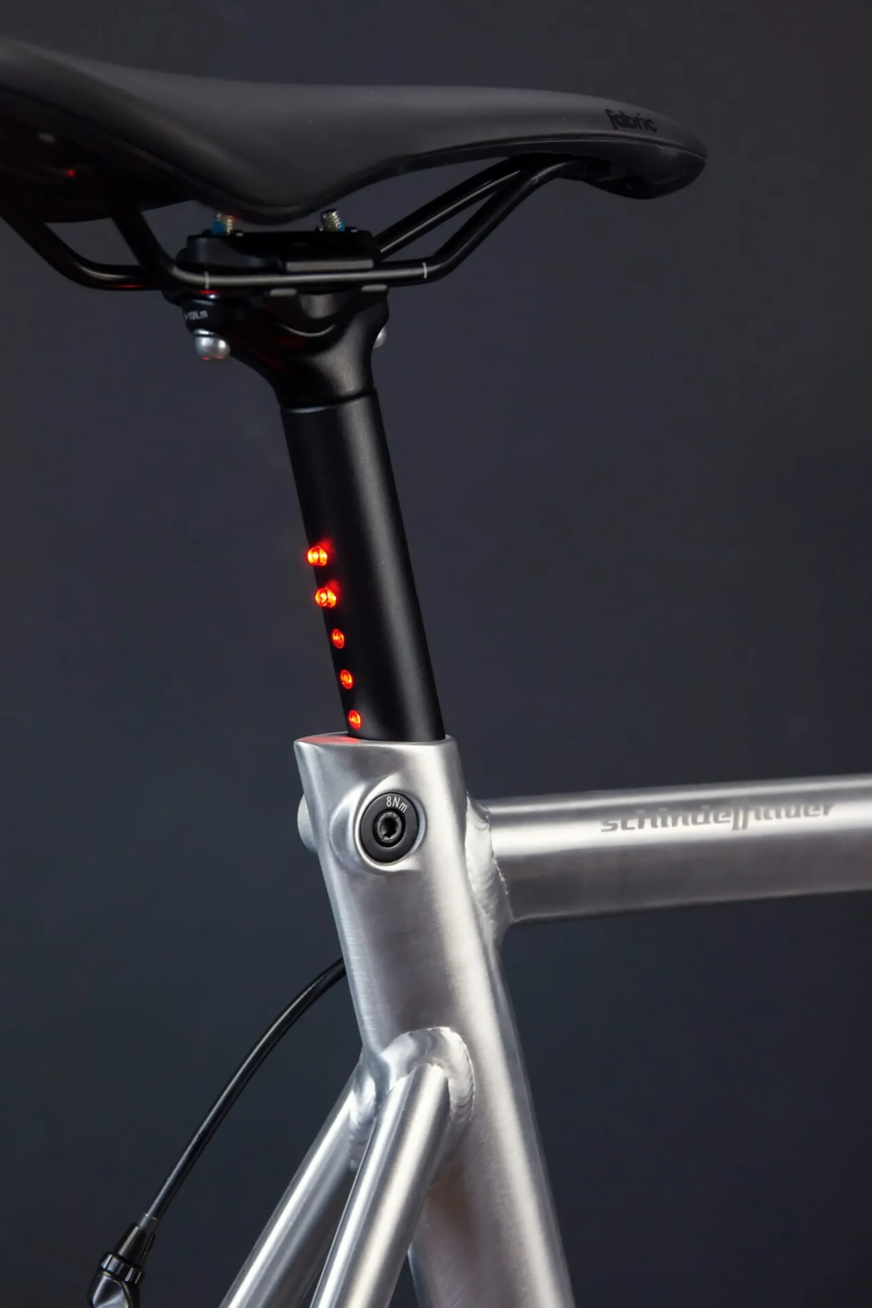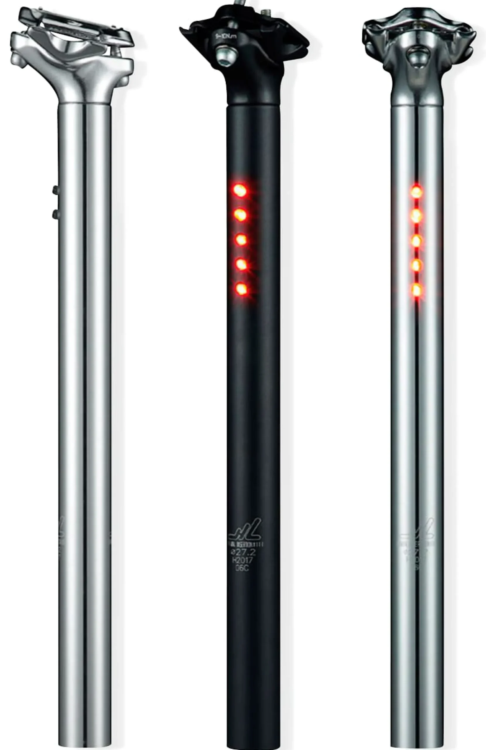 LIGHTSKIN ist Sattelstütze und Fahrradrücklicht in einem – und das neue Modell ist in Deutschland ohne Einschränkungen gemäß der StVZO zugelassen. Der 750 mAh Lithium-Polymer-Akku ist im Inneren der Stütze verbaut und per Micro-USB aufladbar. Eine Demontage der wetterfesten Stütze ist nicht nötig, denn der Micro-USB-Zugang befindet sich an der Sattelklemme. Das mitgeliefert Micro-USB-Kabel kann an Laptop, Smartphone-Ladegerät oder Powerbank angeschlossen werden. LIGHTSKIN verfügt über fünf helle LED-Leuchten, die für blendfreie Sichtbarkeit aus jedem Winkel sorgen. Die unteren beiden LED-Dioden können bei Bedarf (je nach Rahmen- und Körpergröße) im Sattelrohr versenkt und energiesparend ausgeschaltet werden. Die Steuerung der Rückleuchte wird durch den zweiten LED-Knopf angesteuert: Damit lässt sie sich An- und Ausschalten sowie auch zwischen dem 3-LED- oder 5-LED-Modus wechseln. Bei einer Leuchtdauer von 10 (5 Dioden) bis 15 Stunden (3 Dioden) sind viele Fahrten bei Nacht möglich. Die von uns angebotene Sattelstütze besitzt das sehr verbreitete Maß 27,2 mm und lässt sich mit wenigen Handgriffen gegen eine vorhandene Stütze gleichen Durchmessers austauschen.