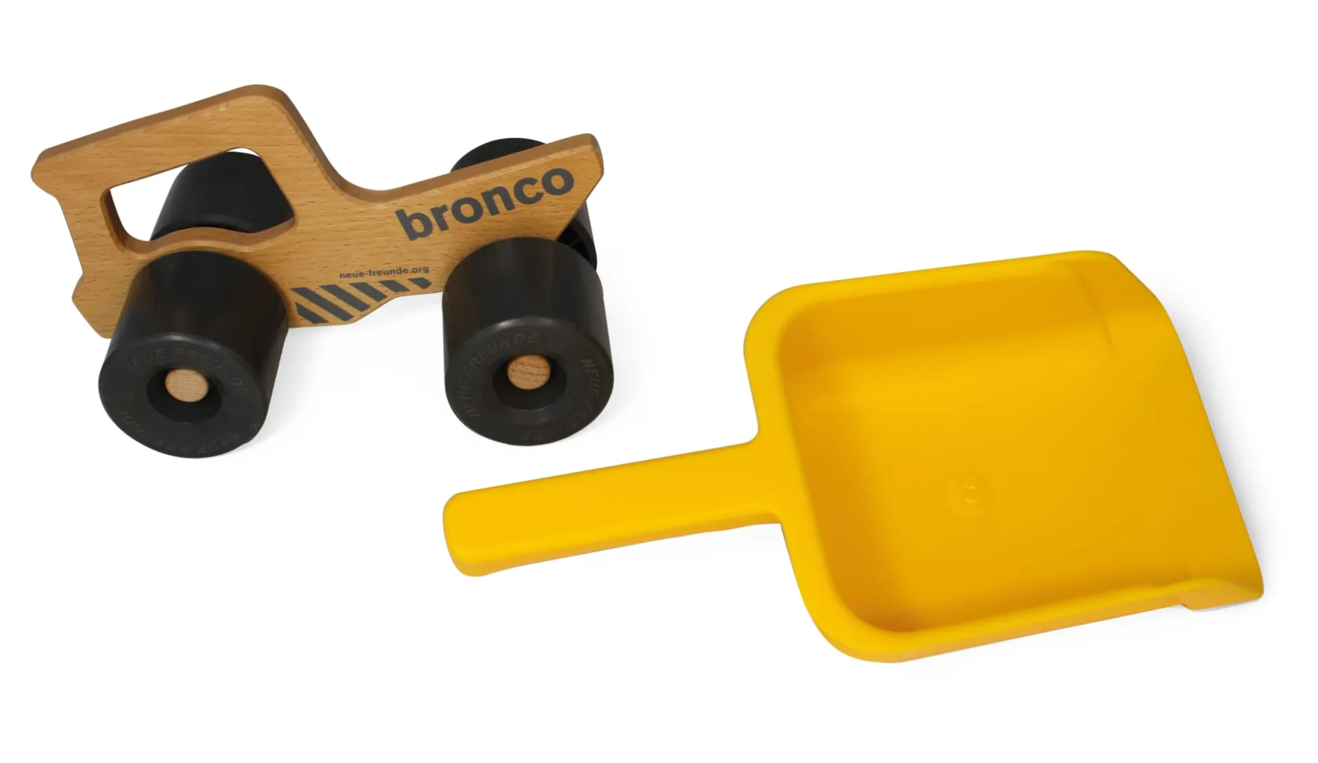 BRONCO besteht aus einem Mittelteil aus Buchenholz und einer abnehmbaren Kunststoffschaufel, die mit ihrem Griff oben auf das Holzteil aufgesteckt wird. Der besondere Clou: Durch eine 180 Grad-Drehung der Schaufel lässt sich Bronco vom Muldenkipper zum Radlader umbauen. Schön für Kinder: gut zu greifen, vielseitig zu bespielen – schön für Eltern: leise Rollen und fein zu säubern.