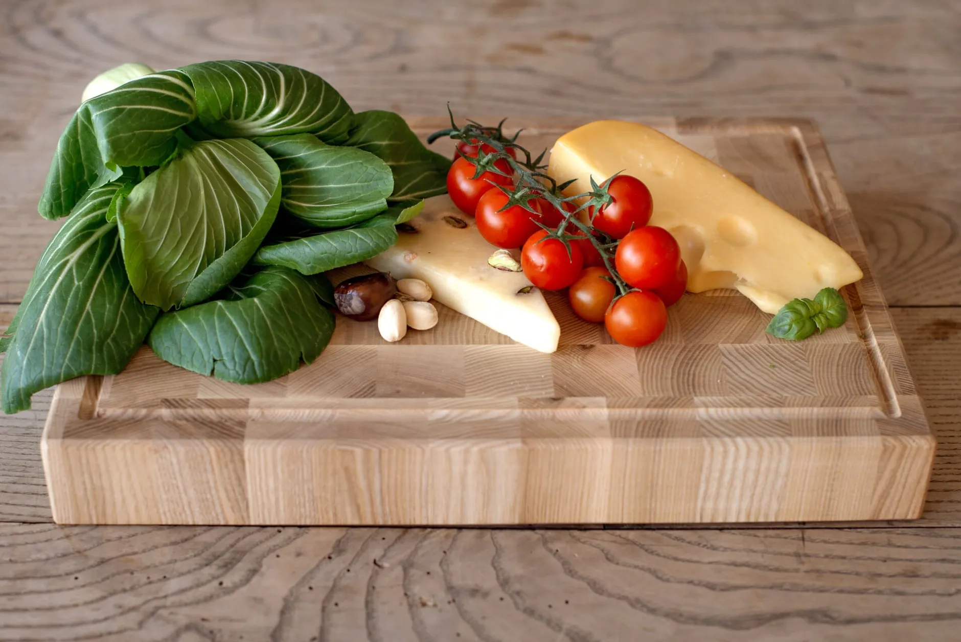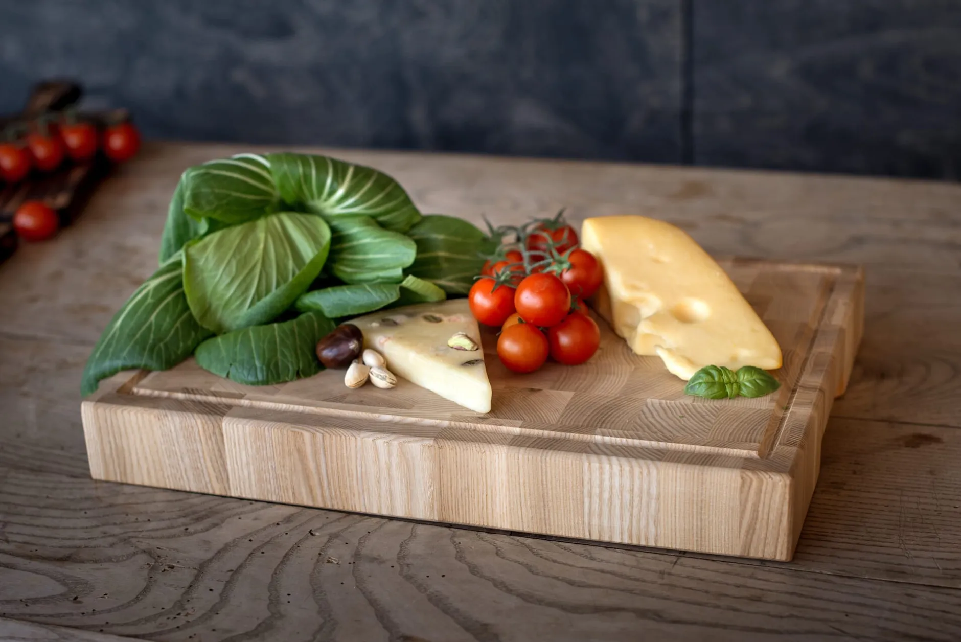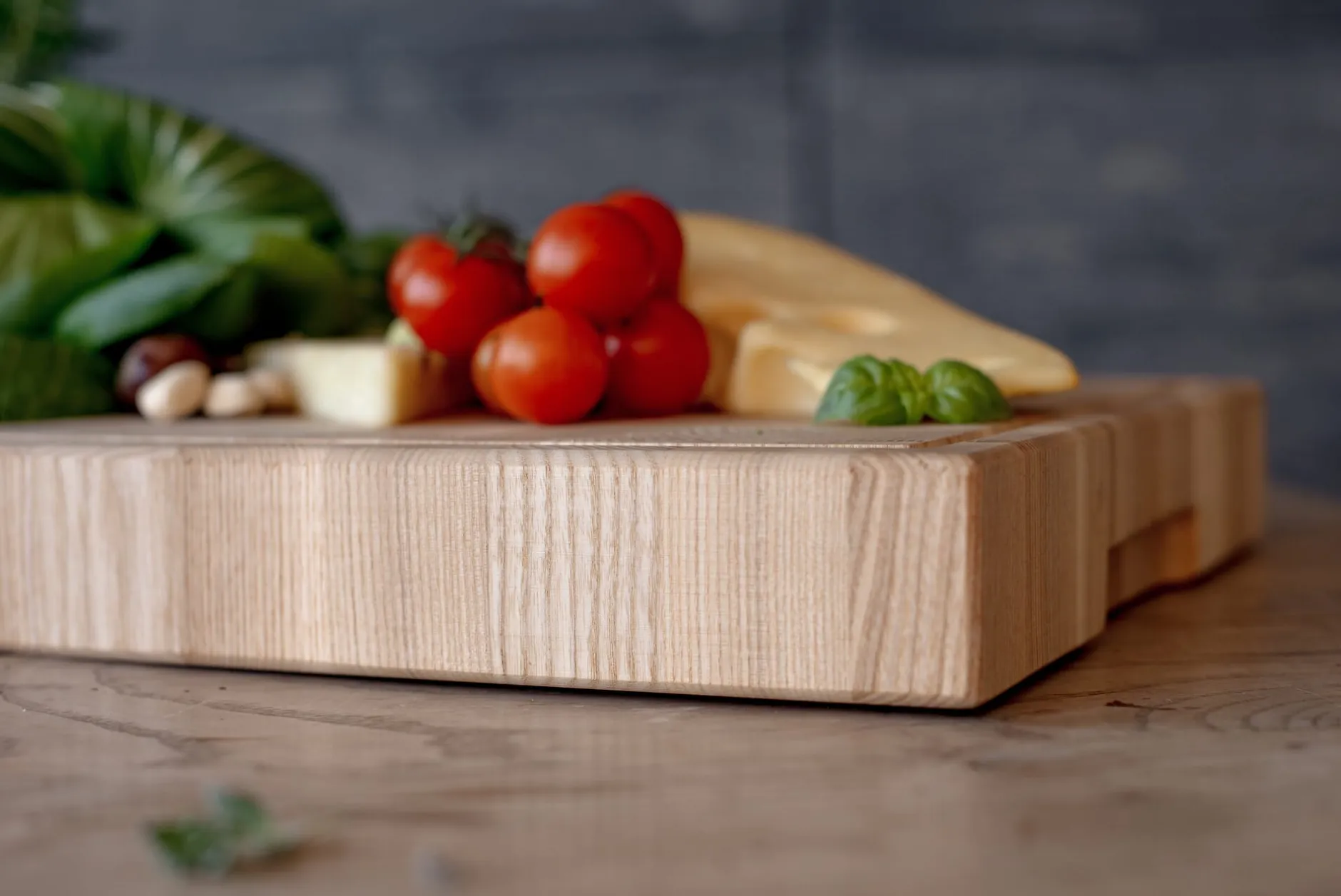 Schneiden, Hacken, Zerkleinern – das in zwei Größen angebotene Schneidbrett könnte robuster nicht sein, denn es besteht aus Eschenholz. Gemüse, Fleisch, Brot – kein Gut, das hier nicht gehandhabt, zubereitet, in Form gebracht werden kann.