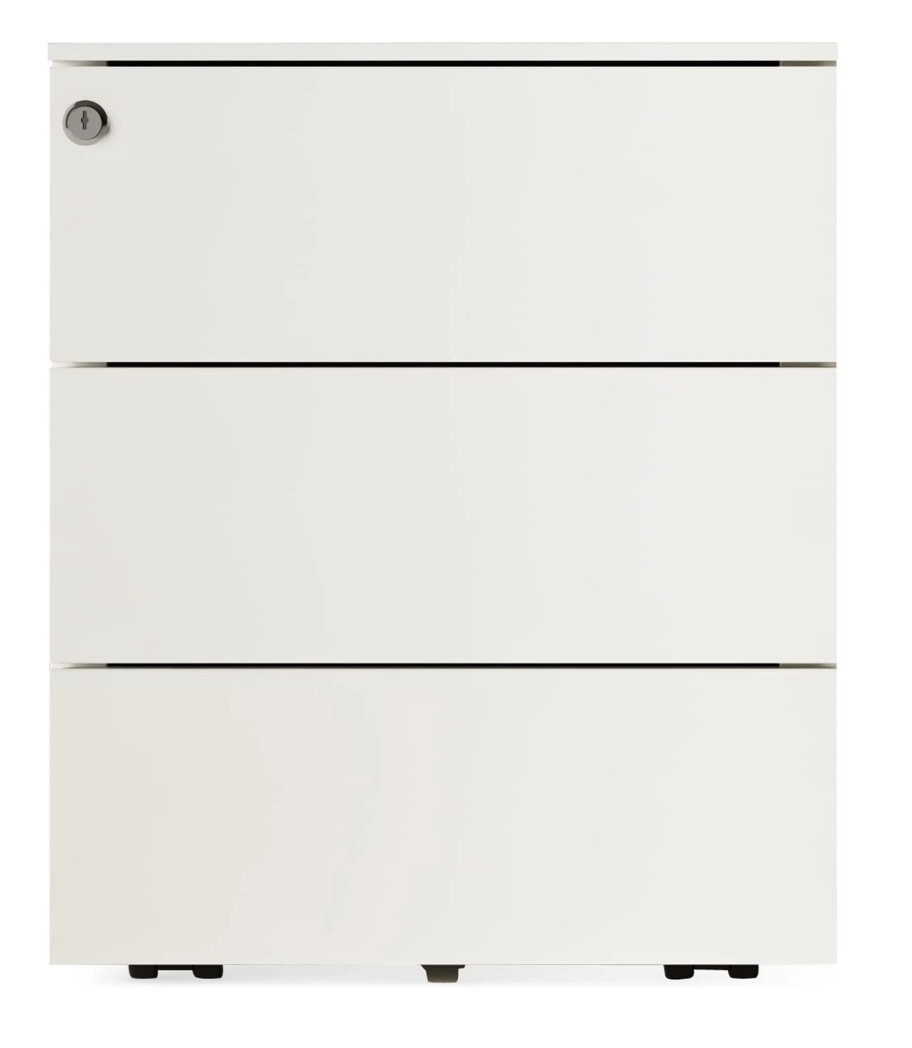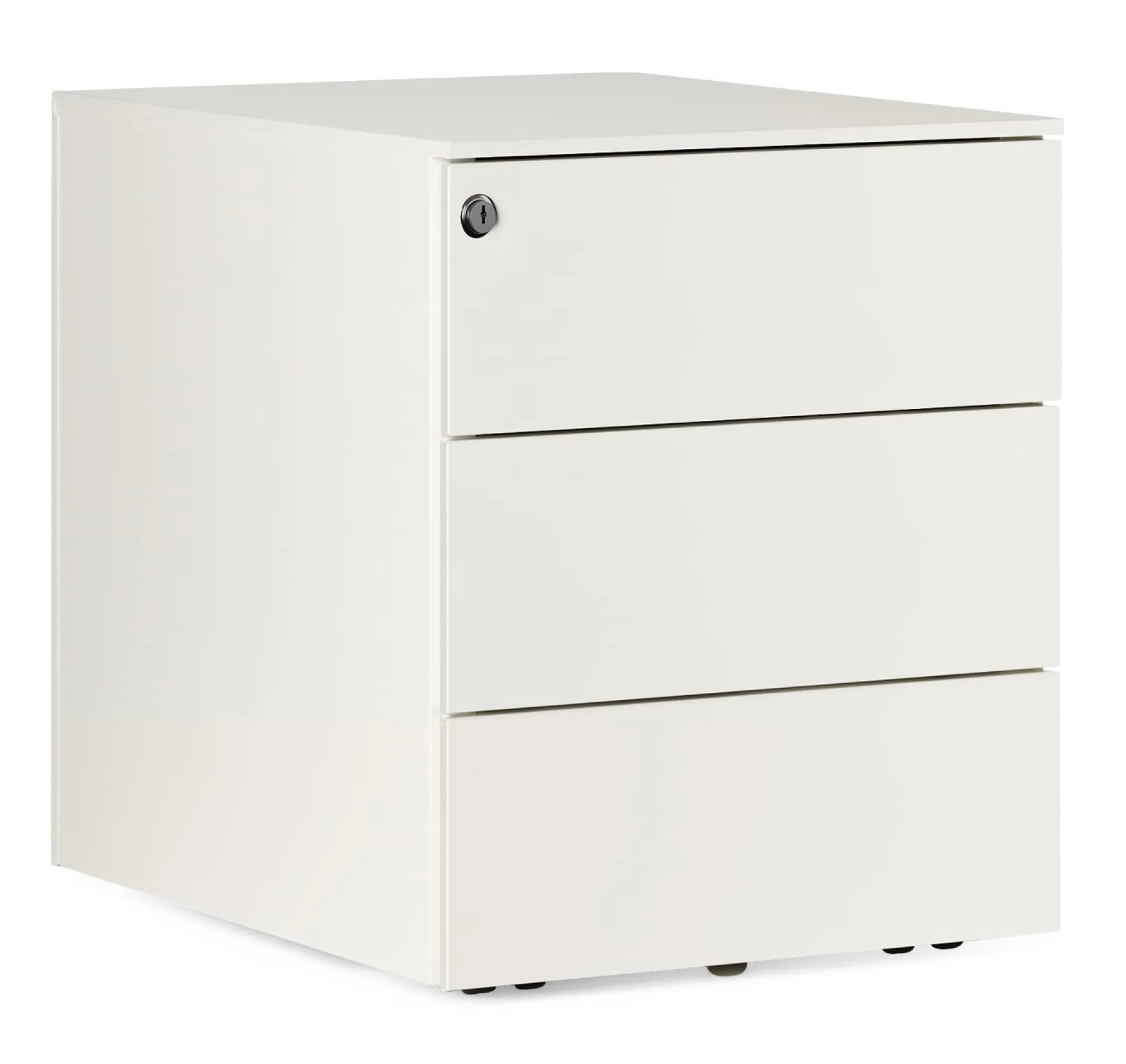 Rollbarer Schreibtischcontainer. KUBO ist aus Stahlblech, wird in Italien gefertigt, ist grundsolide und schön detailliert gearbeitet. Seine Rollen sind unter dem Sockel verborgen montiert. Er besitzt drei gleich große Schubladen sowie eine zusätzliche Innenschublade, die Stifte und Kleinteile aufnimmt. Abschließbar mit integriertem Zylinderschloss.