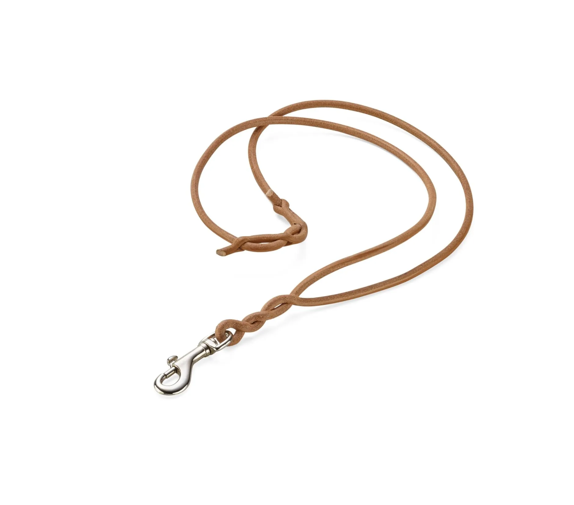 Rindleder (Stärke 5 mm), vegetabil gegerbt. Karabinerhaken (Länge 6 cm) aus vernickelter Zinkdruckgusslegierung. Hergestellt in Dänemark. Gesamtlänge 58 cm. Gewicht 40 g.