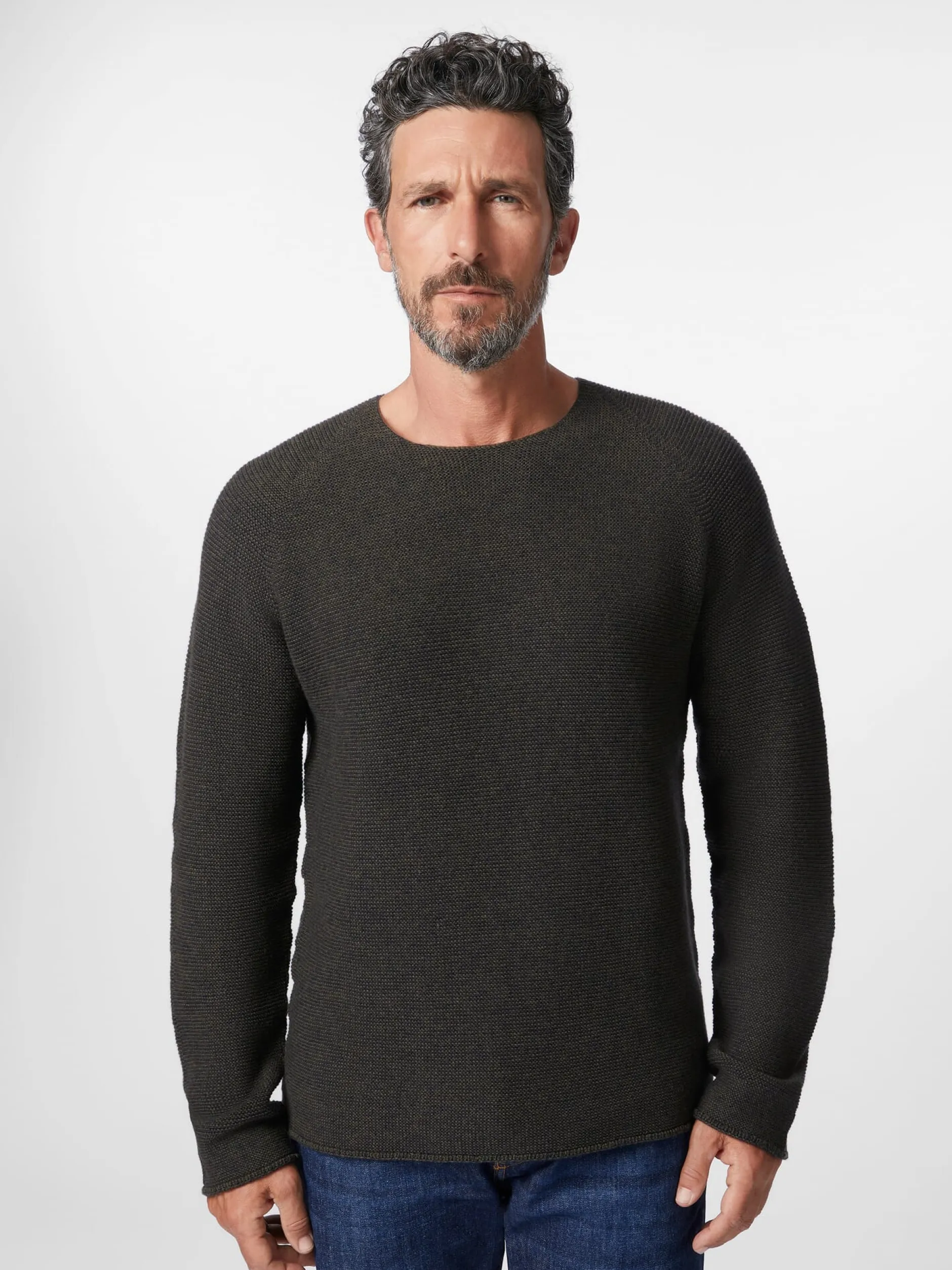 Für diesen Rundhalspullover in breiter Rippenoptik verwendet Seldom Garne aus einer kleinen Spinnerei in Norditalien, die in dieser Qualität exklusiv für den Westerwälder Strickspezialisten hergestellt werden. Zu ihrer Herstellung wird langstapelige kbT-Merinowolle im Streichgarnverfahren gesponnen. Das patentierte Spinnverfahren sorgt dafür, dass der Pullover kaum Pilling-Neigung besitzt. Durch das Links-links-gestrickte Verfahren mit zwei unterschiedlichen Farben entsteht der besondere Melangeton. Am hinteren Kragen ist ein Bündchen eingesetzt.