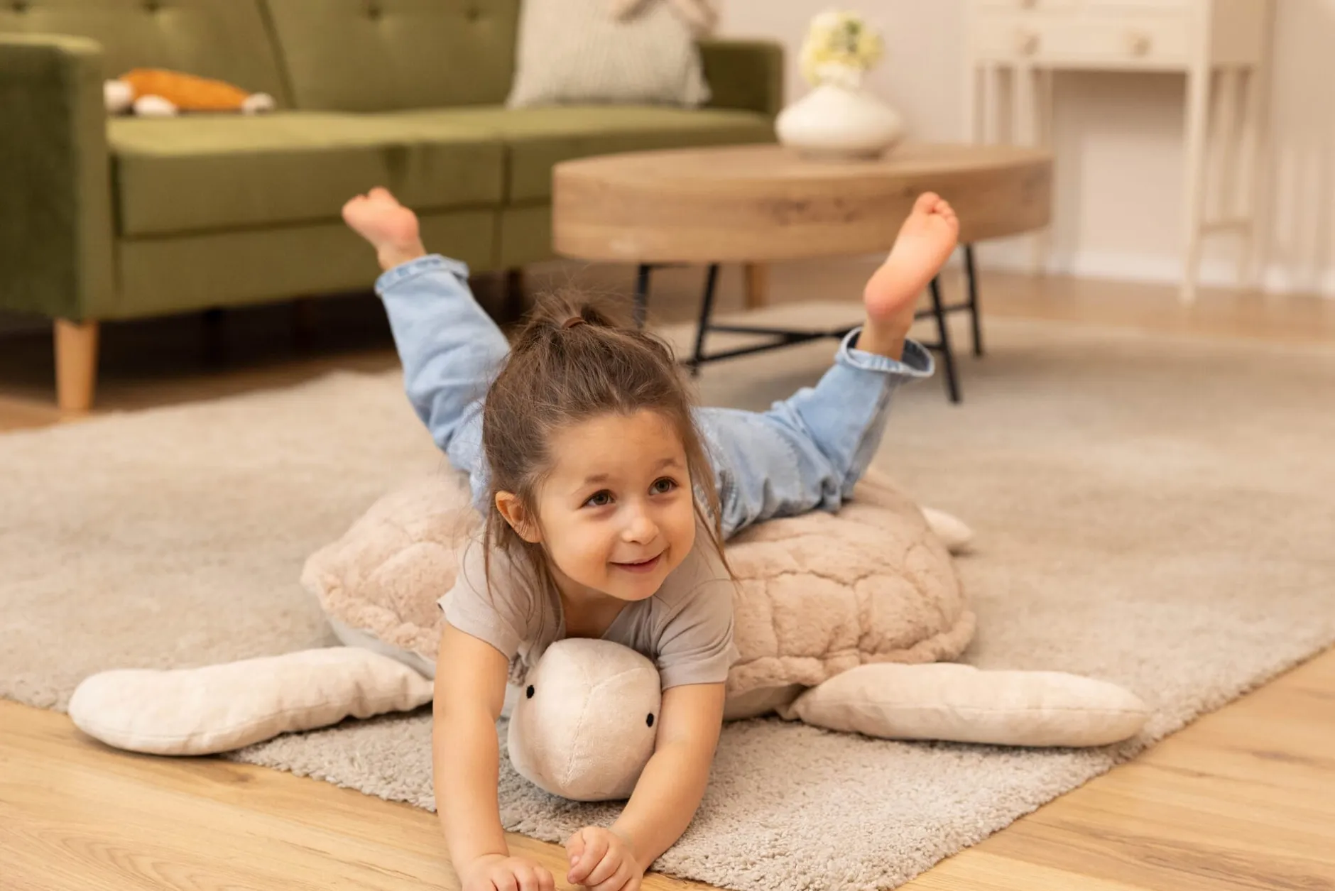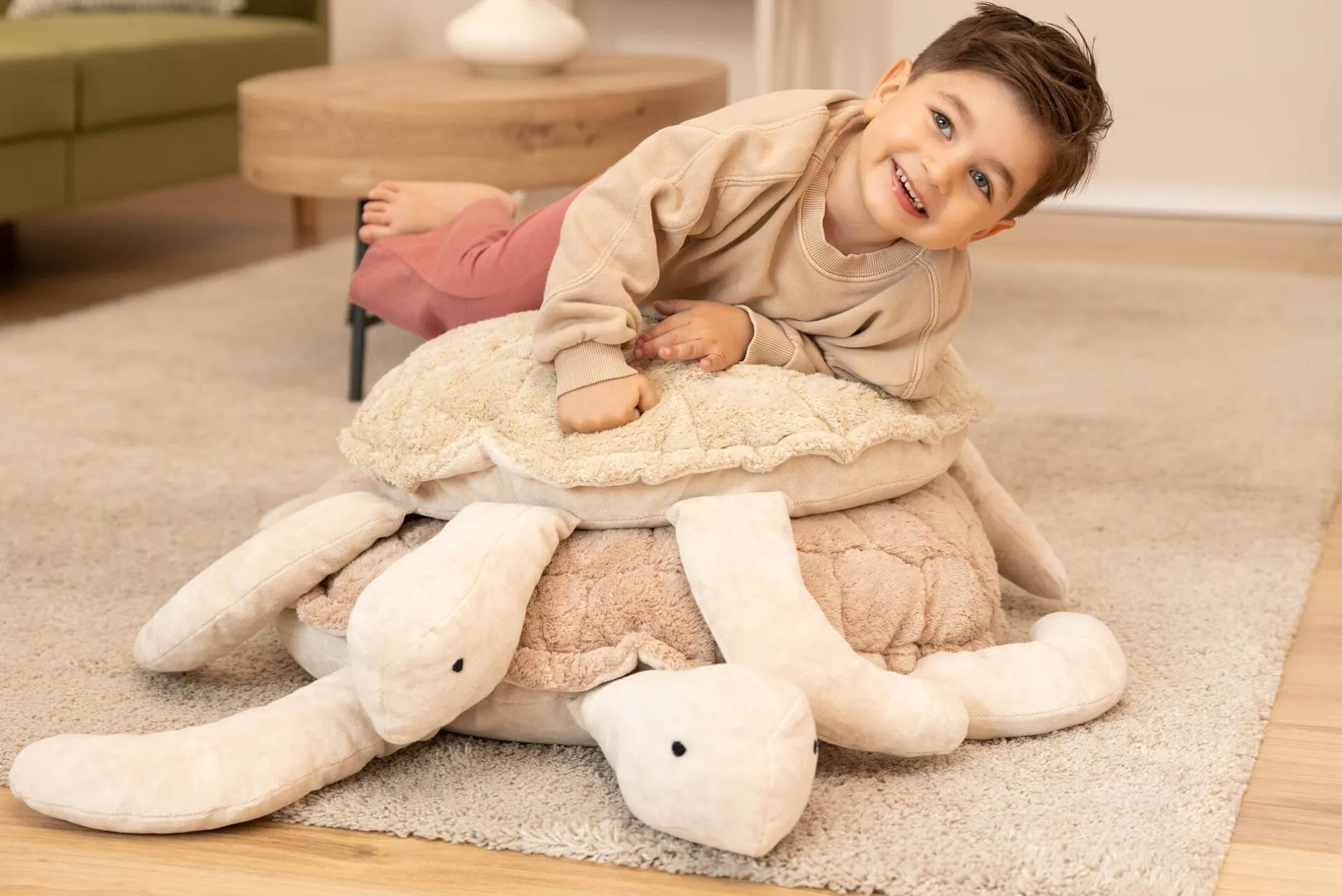 Typisch Schildkröte, benimmt sich dieses Kuscheltier überaus stoisch, bewahrt selbst unter ungestümen Zuneigungsbekundungen die Contenance und kommt den bodennahen – und nicht zwangsläufig bodenständigen – Ideen Ihres Kindes mit der ihr eigenen Schmiegsamkeit entgegen. Dabei ist die Schildkröte nicht nur Plüschtier, sondern beweist ebenso als großes, weiches Bodenkissen ihren empfänglichen Charakter. Denn möglicherweise rollt Ihr Kind gern vor Lachen auf dem Boden oder übt enthusiastisch seine neue Kür im Bodenturnen. Oder es empfindet urplötzlich das Bedürfnis, sich mitten im Raum für einen kleinen Powernap hinzuwerfen. Oder es sucht nach einer gemütlichen Möglichkeit, sich auf Augenhöhe mit seinem Spielzeug auszustrecken, das Bilderbuch zu studieren oder der Abenteuergeschichte zu lauschen. Oder es möchte sich einfach umfassend bei seinem Lieblingskuscheltier einschmeicheln.