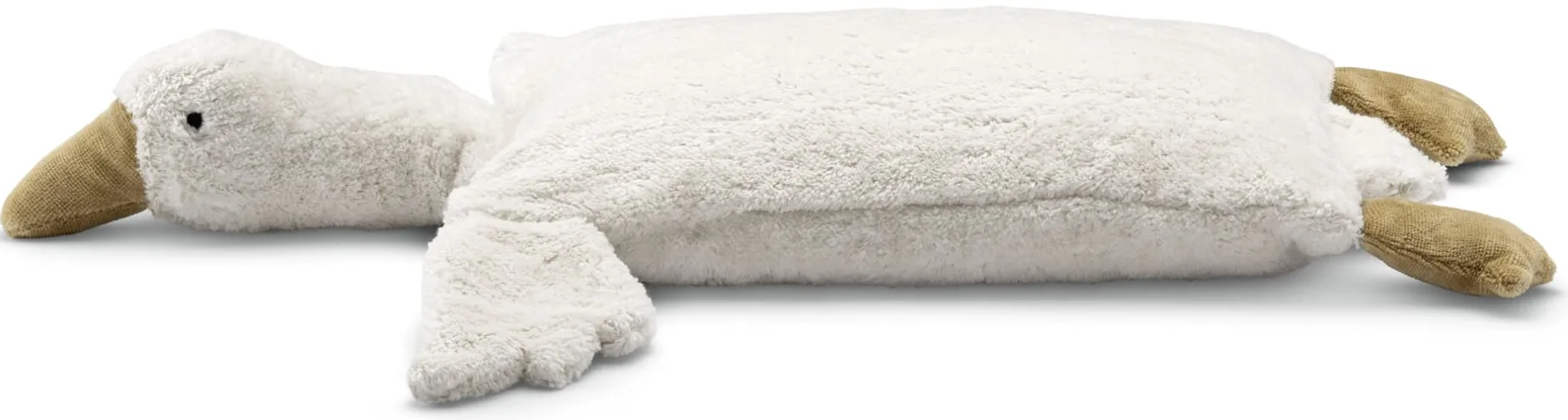 Alles, was zum Anschmiegen gemacht ist, muss sich weich anfühlen, darin sind sich Kinder und Erwachsene wohl einig. So überzeugt dieses Kissen bereits in Sachen Kuscheleigenschaften auf ganzer Linie: Sein Plüschbezug aus kbA-Baumwolle ist besonders flauschig, Kopf und Füße sind mit reiner Schurwolle gefüllt und ebenso angenehm im Griff. Völlig entspannt hingestreckt, erfüllt die Plüschgans damit alle Voraussetzungen, als Schmusekissen lieb gewonnen und vor allem beim Einschlafen ausgiebig bekuschelt zu werden. Zusätzlich befindet sich in der Gans ein herausnehmbares Baumwollkissen: Es ist mit feinen Zirbenflocken gefüllt. Denn Holz und Nadeln der Zirbe enthalten ätherische Öle und Harze, deren typischen herb-aromatischen Duft (nicht nur) viele Kinder als besonders wohltuend empfinden. Dezent begleitet der angenehme Zirbenduft des Kissens Ihr Kind, während es zur Ruhe kommt. Und beim Aufwachen begrüßt die Gans Ihr Kind ganz sicher wieder mit einem warmen Hallo und einem sanften Kuscheln.