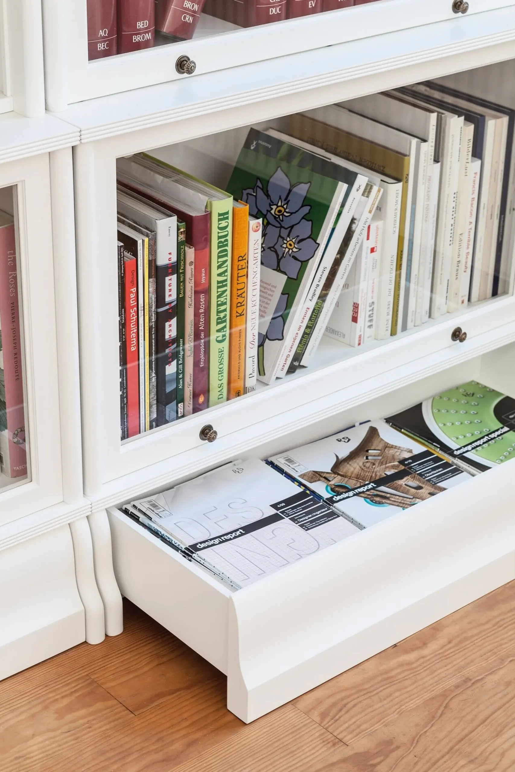 Der Schubkasten des klassischen, nach außen leicht konturierten Hochsockels bietet reichlich Stauraum (siehe Detailfoto). Die vielseitigen Schrankelemente sind der Kern des Systems. Sie eignen sich für alle typischen Buchformate, natürlich aber auch für Geschirr und vieles mehr. Der klassische Aufbau wird mit Schrankelementen unterschiedlicher Tiefe (die größeren mit jeweils einem Einlegeboden) realisiert.