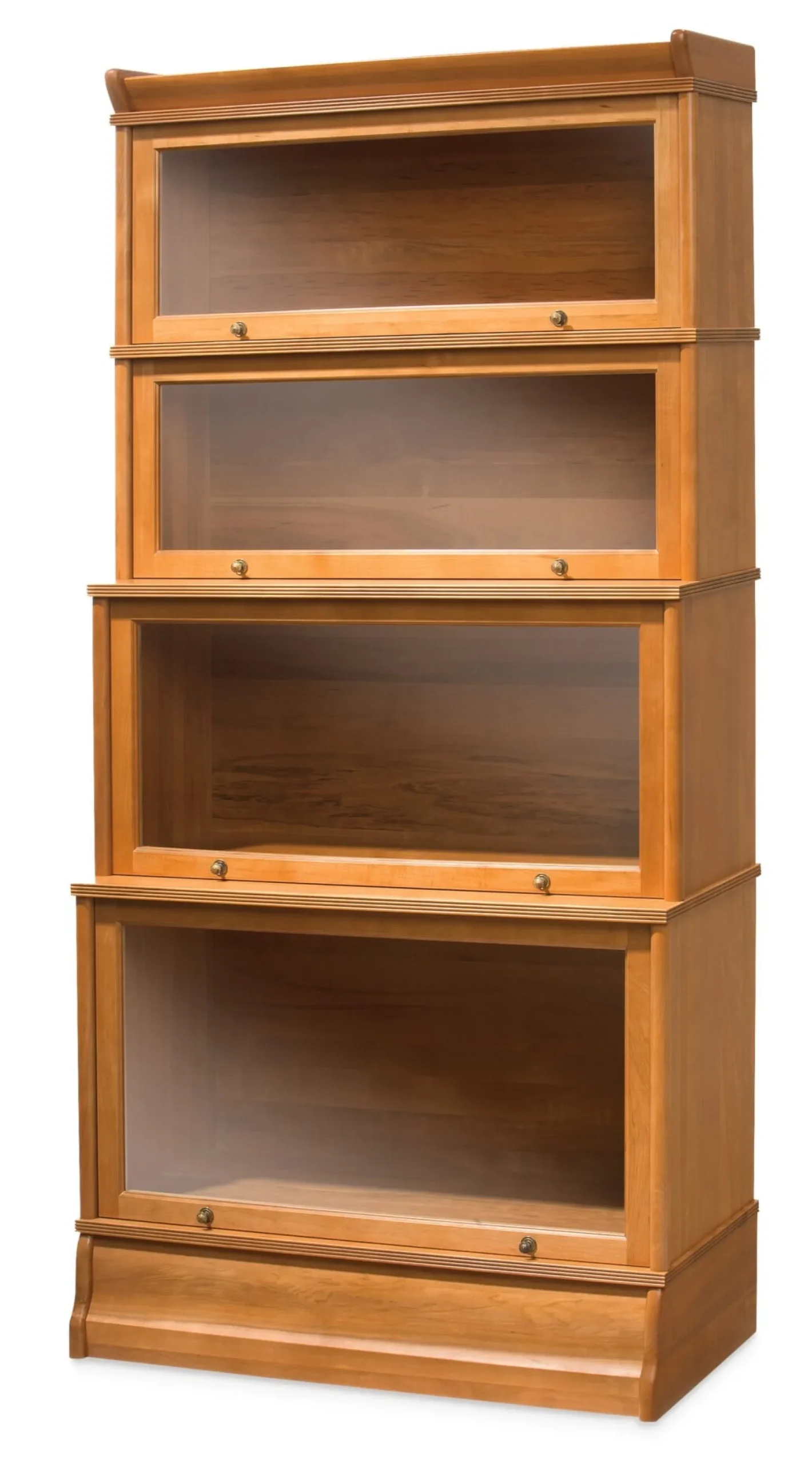 Ein Schrank im klassischen zurückspringenden Aufbau mit Hochsockel, 4 Schrankelementen mit Klarglasfront und abschließendem Kranz. B 880 x H 1837 x T 434 mm. Gewicht 63 kg. Lieferung ohne Dekoration.