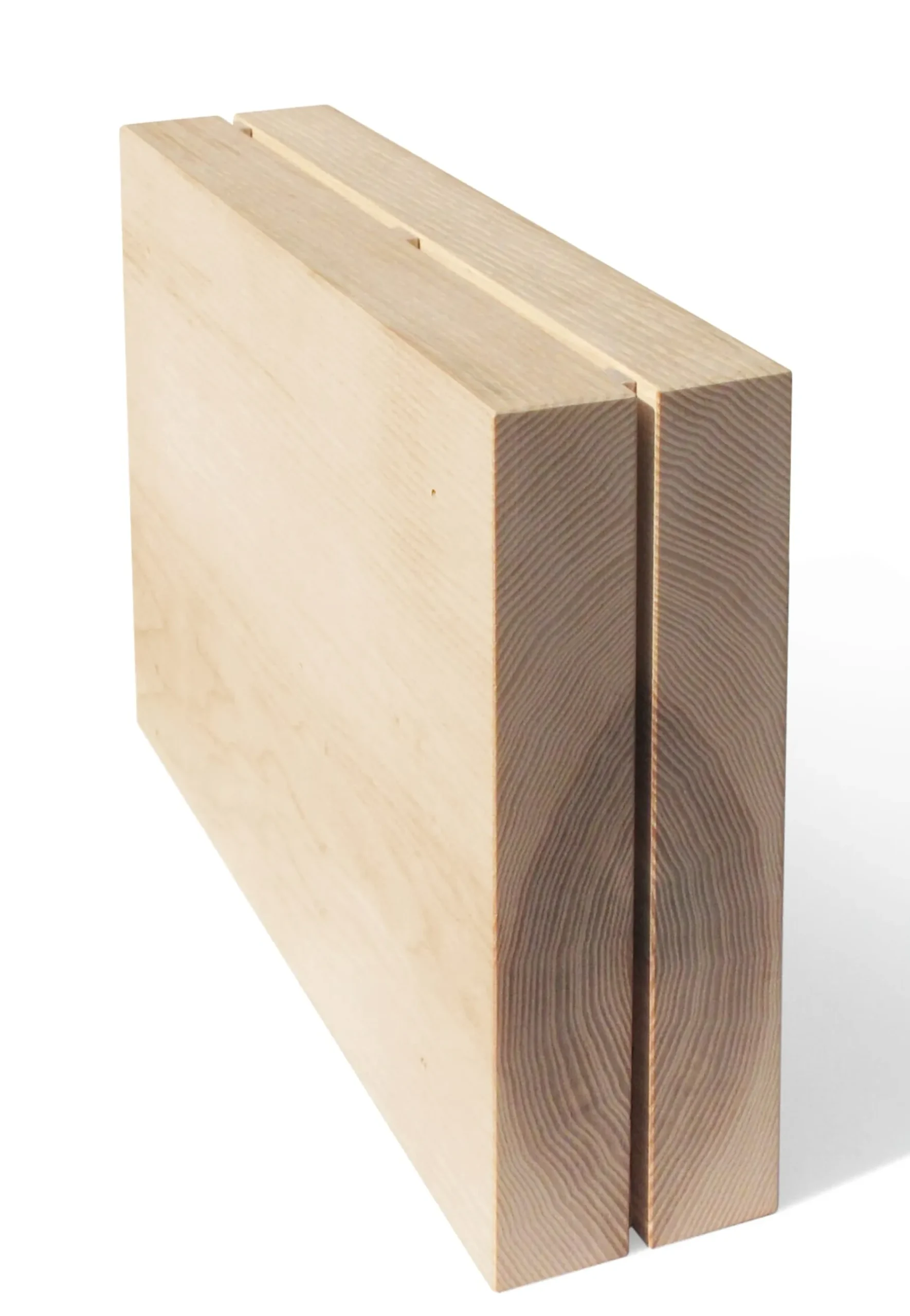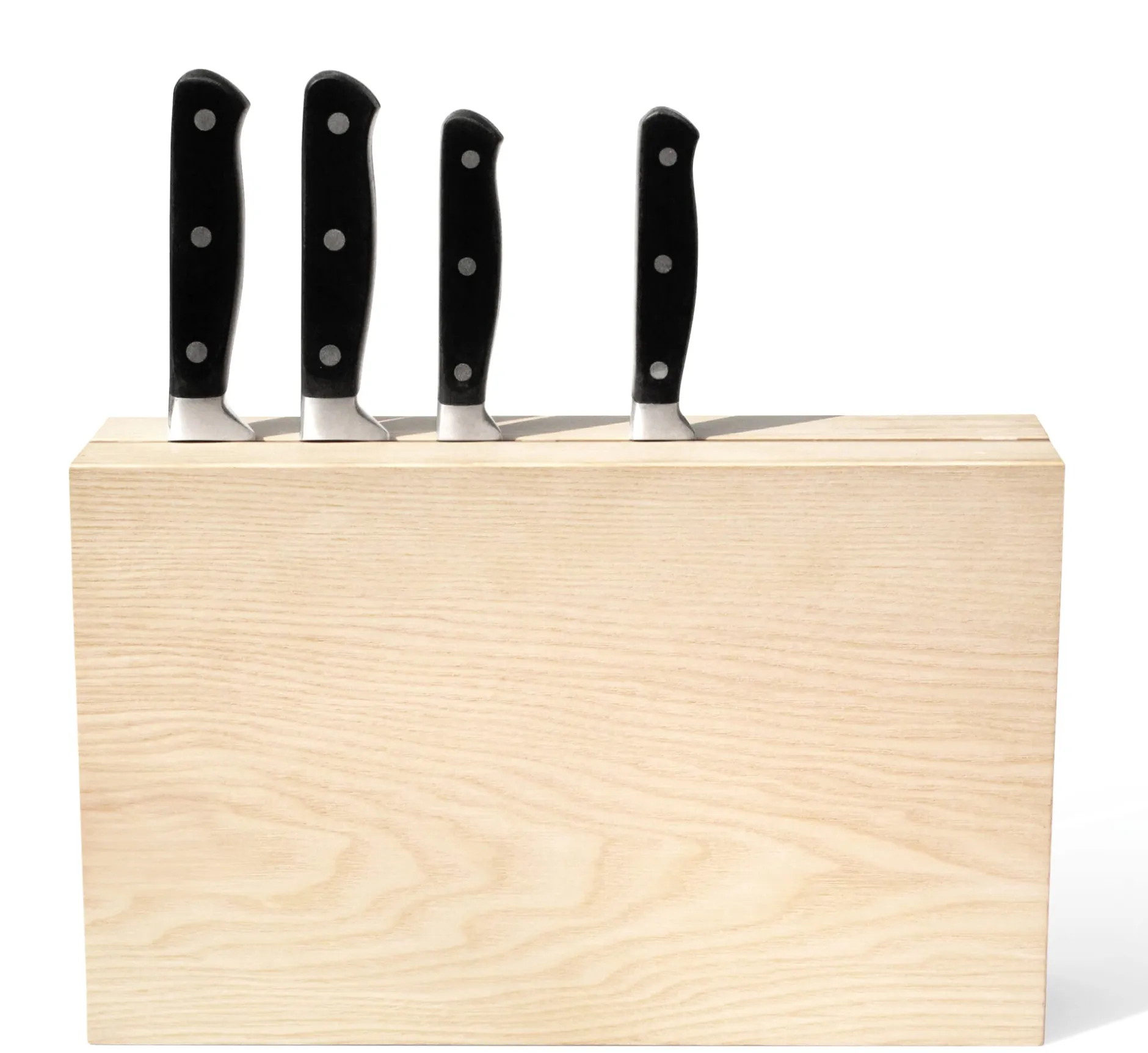 Zwei Blöcke aus Massivholz, auf Distanz gesetzt, bilden die Basis für einen standfesten Messerblock. Flach nebeneinander aufgereiht finden hier 6 bis 8 Messer ihren Platz. Sicher aufbewahrt, geschützt vor unbefugter Kinderhand und messerschonend im gleichen Maße. Nutzbar für Messer mit einer Klingenlänge von maximal 21,5 cm.