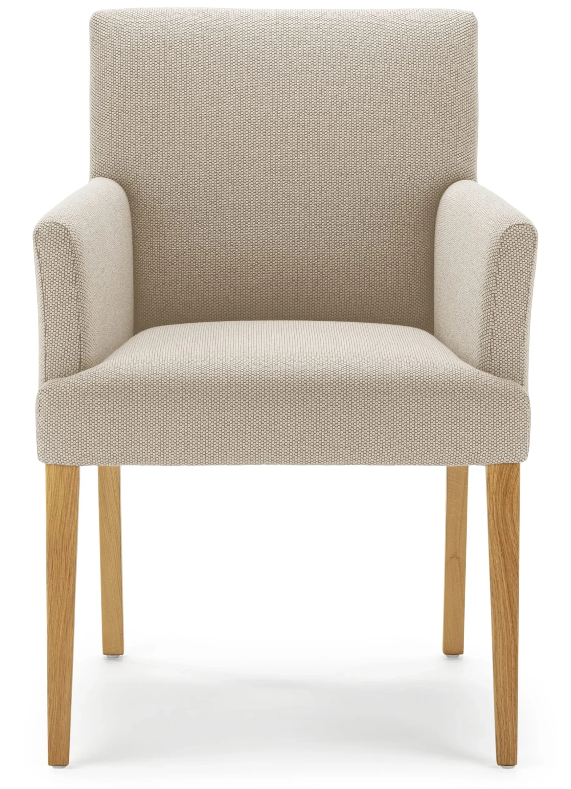 Gestell Buchenholz (Herkunft Deutschland), Füße aus Eichenholz geölt (Herkunft Deutschland). Kunststoffgleiter sind montiert; 4 Filzgleiter (z.B. für die Nutzung auf Parkettböden) liegen bei. Handwerkliche Federung mit Wellenfedern, Filzvlies und Kaltschäumen (mit unterschiedlichen Raumgewichten). Polsterung der Arm- und Rückenlehnen Kaltschäume und Polsterwatte. Bezug aus 96% Schurwolle und 4% Polyamid. Hergestellt in Deutschland. Aus handwerklicher Fertigung, bei den angegebenen Maßen handelt es sich daher um Circamaße.
