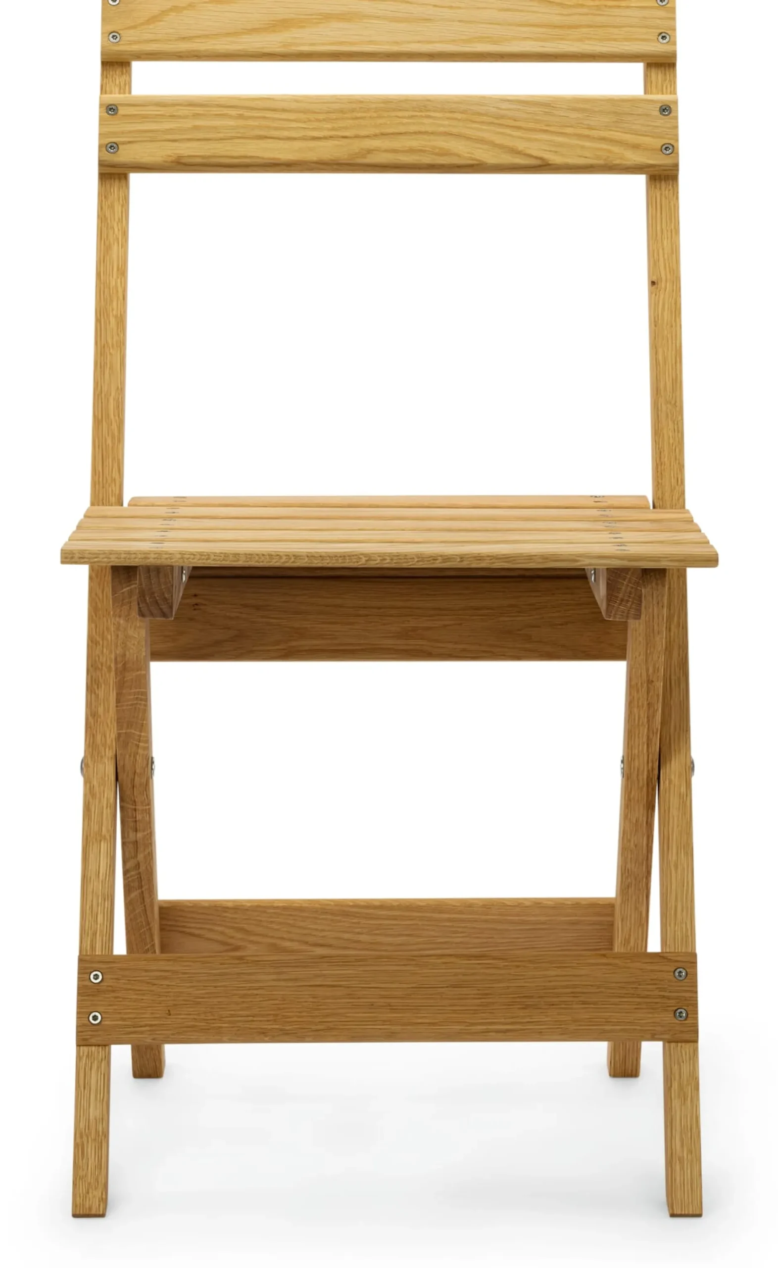Eichenholz geölt (Herkunft Polen). Höhe 75,5 cm, Breite 40 cm, Tiefe 40 cm. Sitzhöhe 44 cm, Sitztiefe 35,5 cm. Klappmaße: H 88,5 × B 40 × T 5,5 cm. Gewicht 3,5 kg. Belastungsgewicht max. 100 kg. Für den Innen- und Außenbereich geeignet.