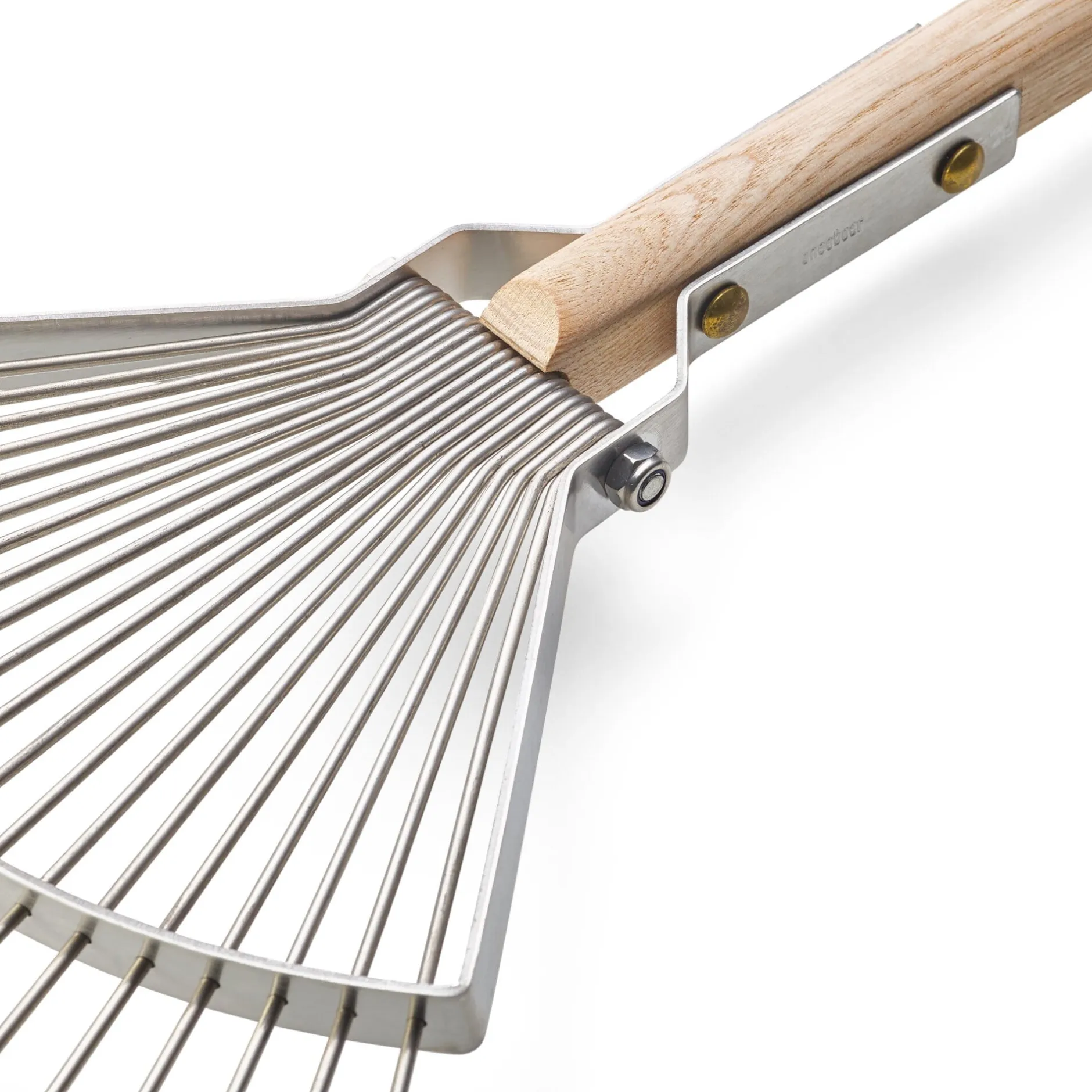 Dieser Rechen kommt aus Holland von der Werkzeugschmiede Sneeboer. Dort wird wenige Millimeter starker Edelstahldraht durch Kaltziehen zu sehr feinen, dünnen Zinken verarbeitet. Überaus biegsam und gleichzeitig maximal stabil, machen diese filigranen Zinken jede Bewegung des Werkzeugkopfes mit. Das ganze Werkzeug wiegt nicht mehr als 800 g, sodass die mühsame Arbeit des herbstlichen Laubfegens im Garten sich auch bei längerer Dauer in eine gern getane Leichtigkeit wandelt.
