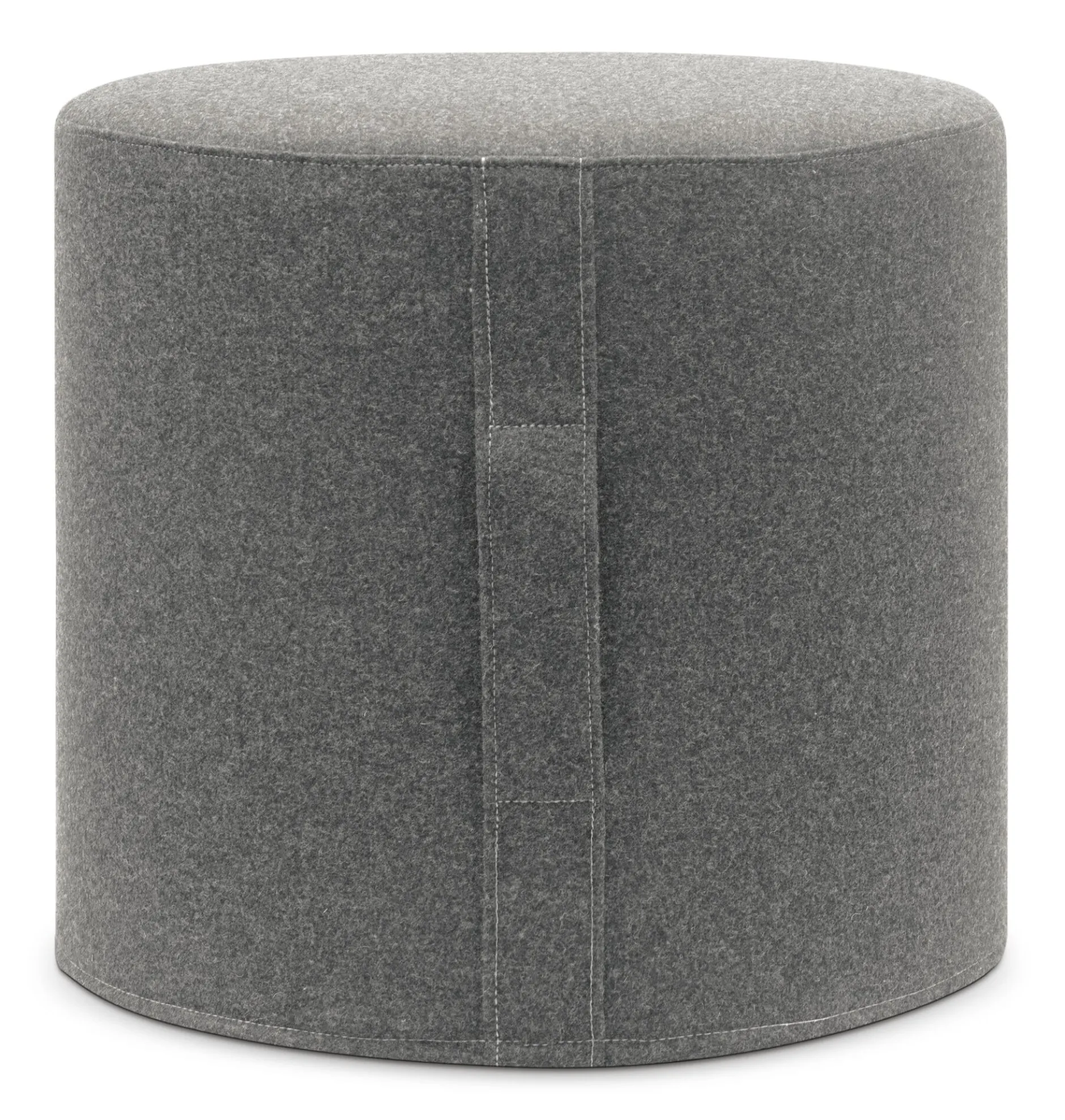 Vollständig mit Stoff bezogener Hocker mit Griffschlaufe. Wird mit einem separat lieferbaren Tablett zum Beistelltisch.
