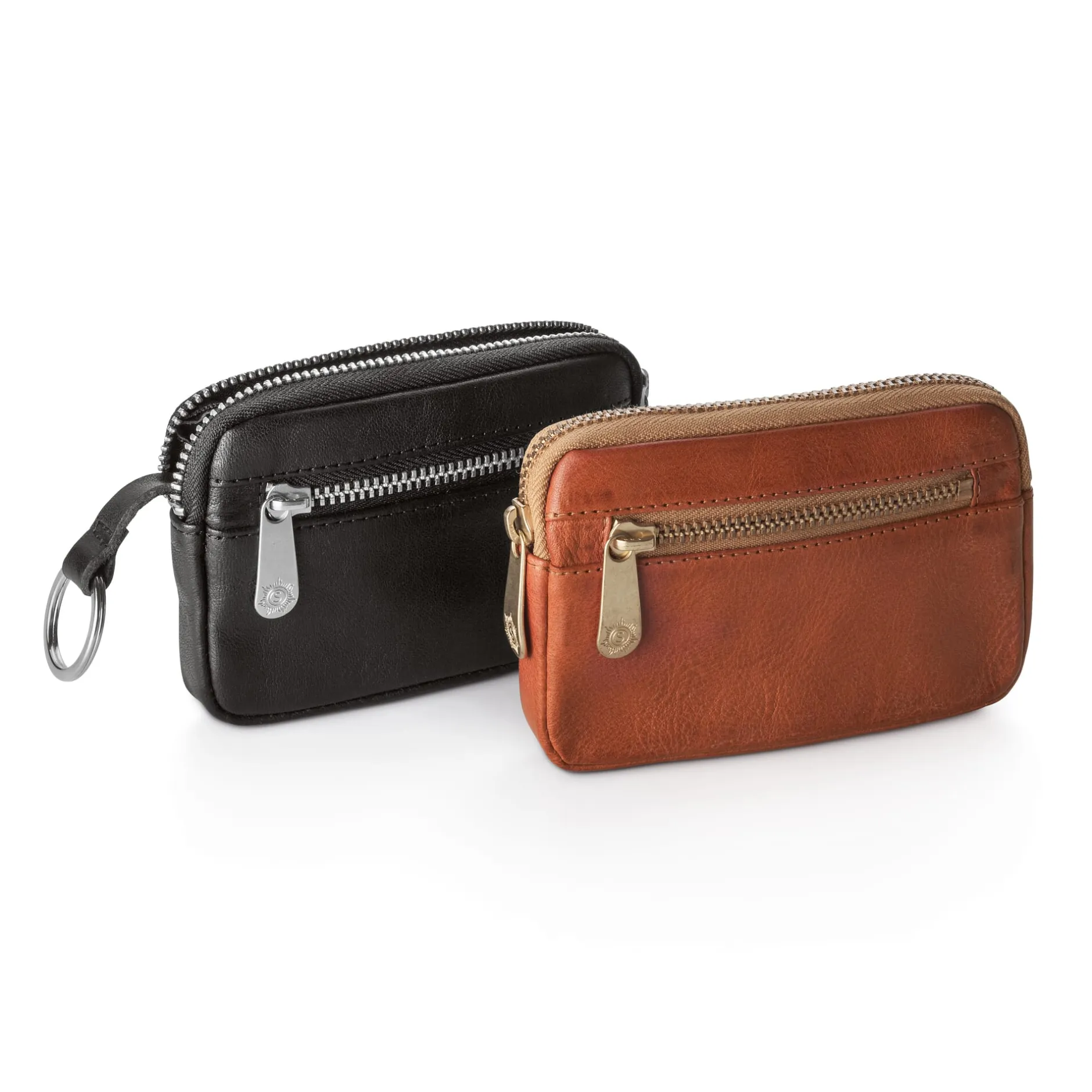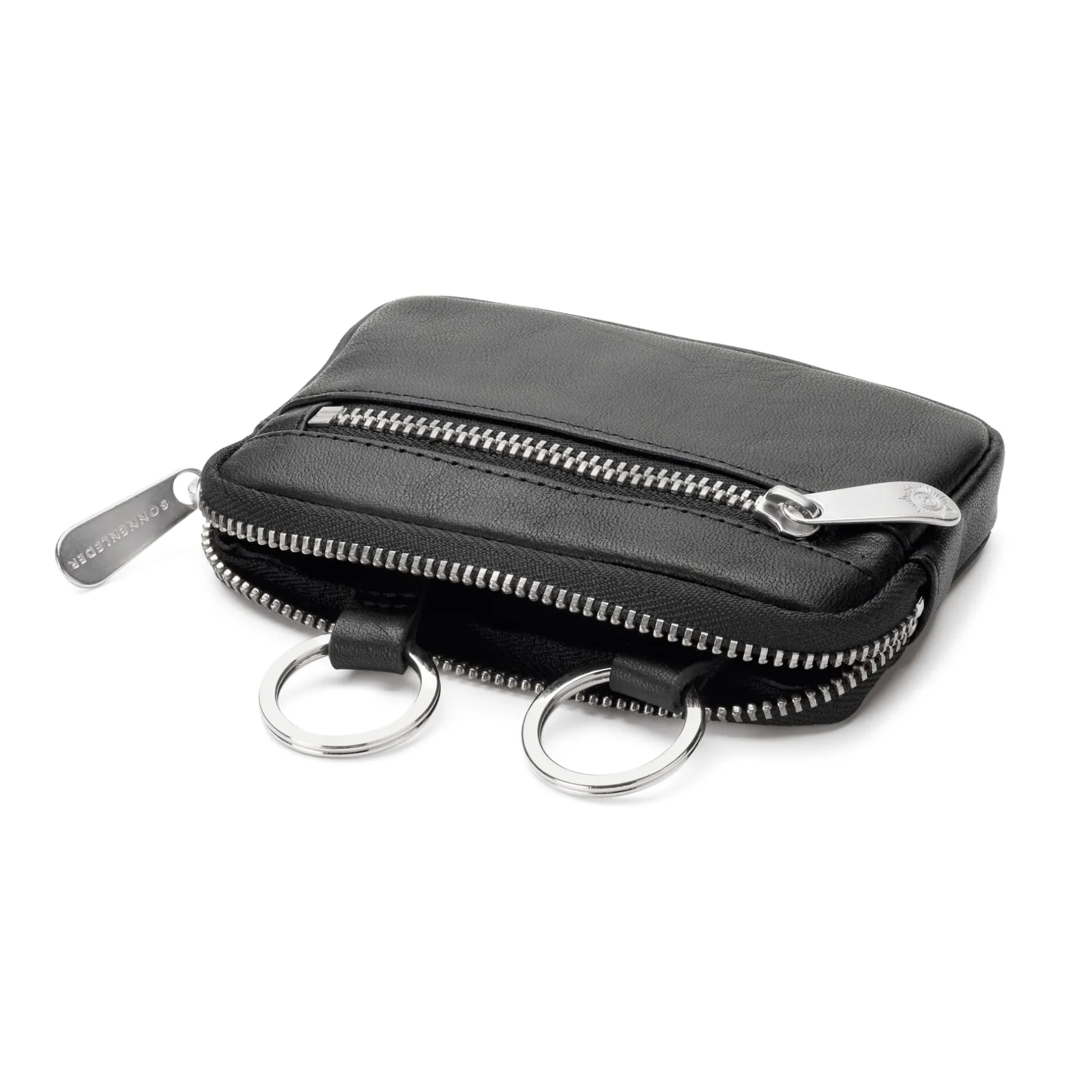 Bei diesem großen, praktischen Etui für Schlüssel ist der Reißverschluss beidseits ein Stück um die Ecken geführt und ermöglicht ein weites Öffnen. An der Vorderseite befindet sich ein Geldfach mit Reißverschluss. Beide Schlüsselringe (Ø 2,7 cm) sind jeweils an einem Lederbändchen befestigt. Ohne sichtbare Nähte an den Außenkanten.