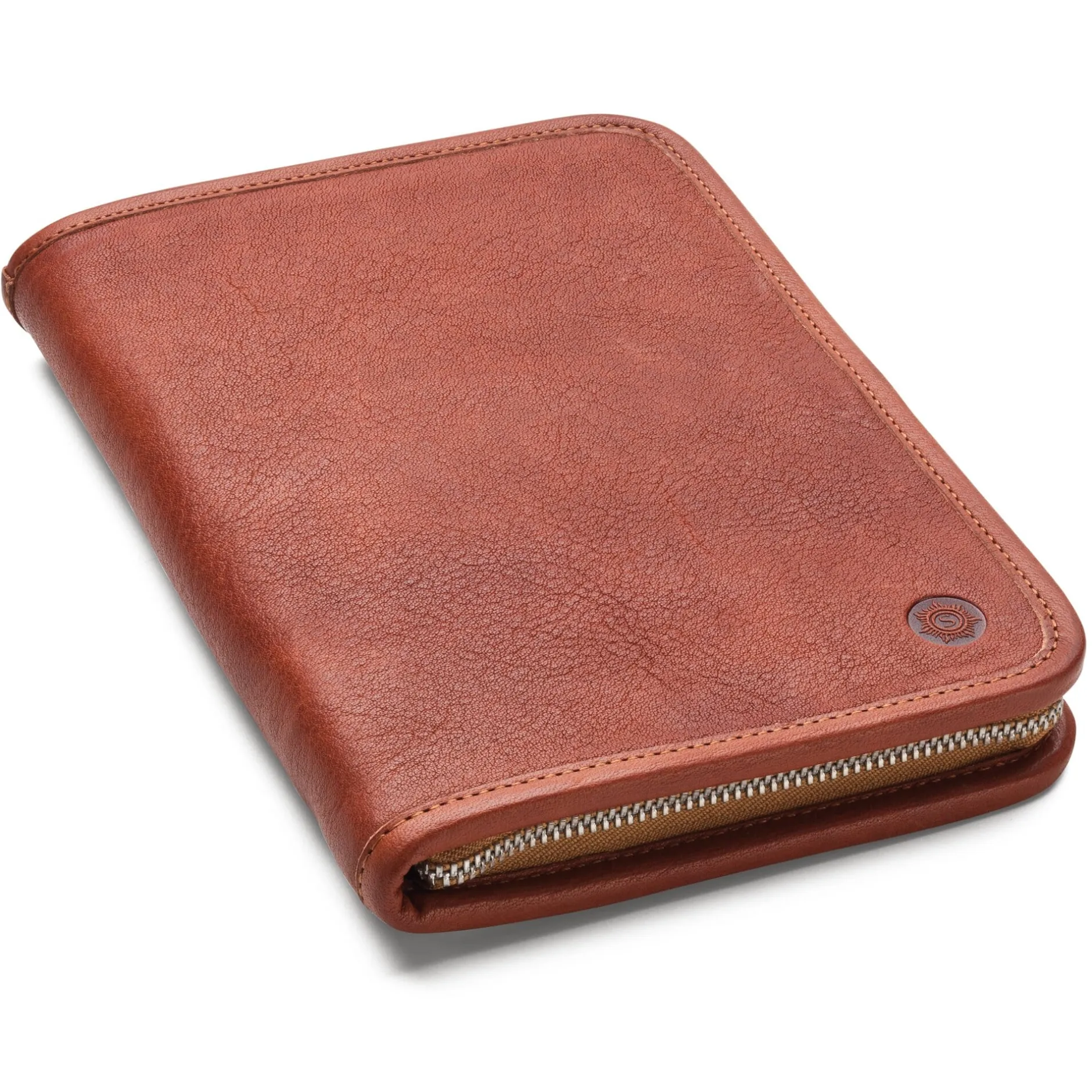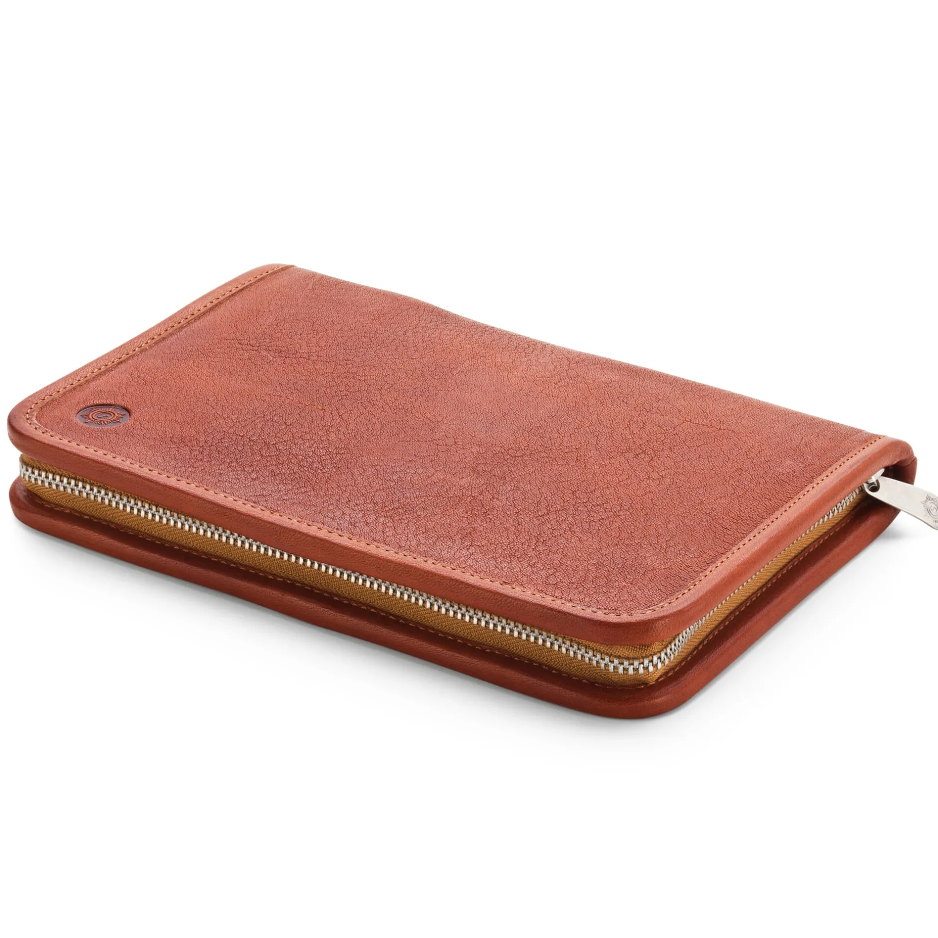 Rindleder, vegetabil grubengegerbt, Herkunft Deutschland. Ungefärbt bzw. im Fass schwarz durchgefärbt. Mit 13 Stiftschlaufen, 5 weitere Schlaufen für Füllfederhalter, Kugelschreiber usw. Reißverschluss und Griffplatte aus vernickeltem Messing. Hergestellt in Ungarn.