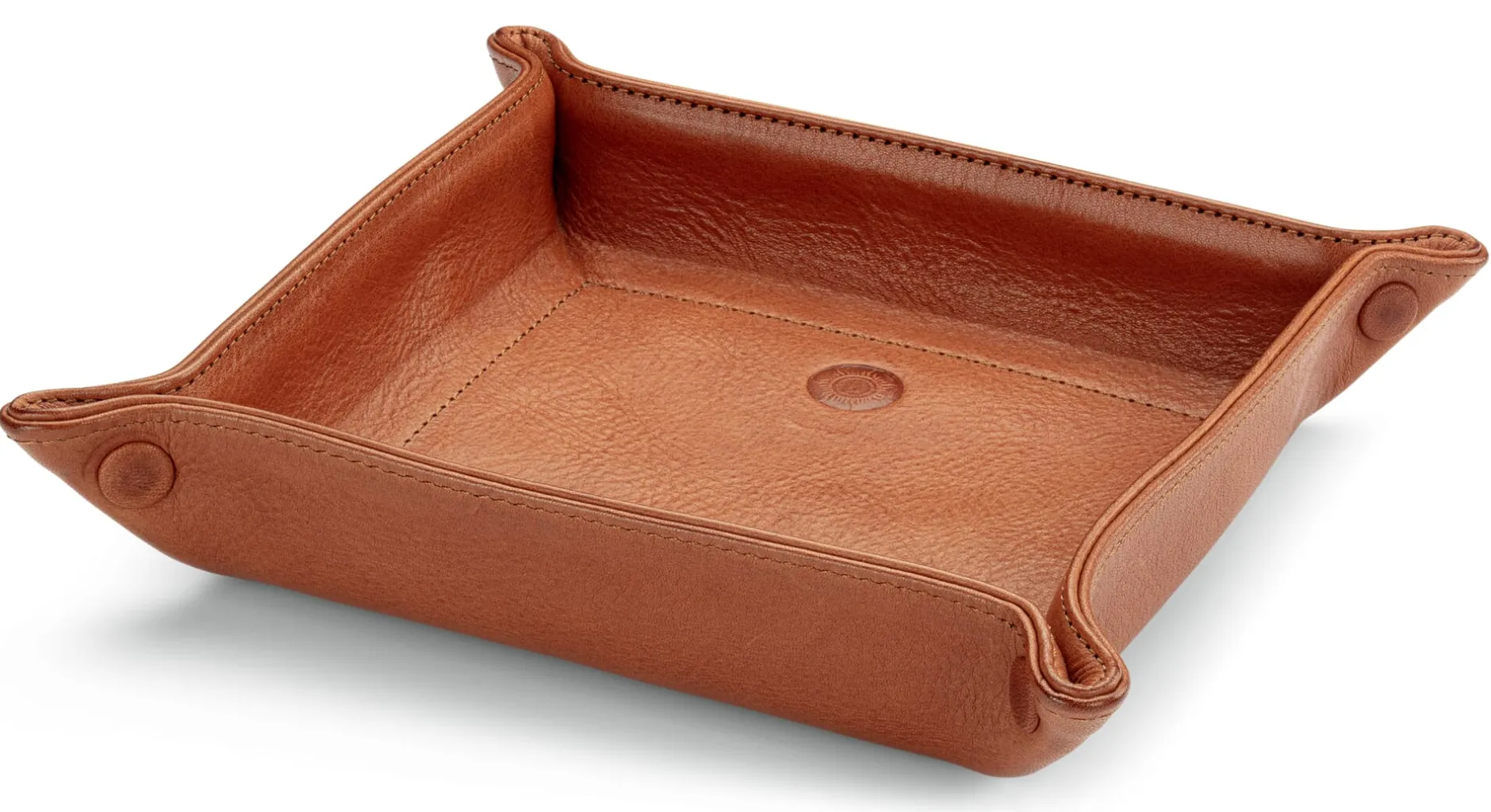 Schale aus zwei Schichten vegetabil grubengegerbtem Rindleder, Herkunft Deutschland. Ungefärbt bzw. im Fass schwarz durchgefärbt. Lederbezogene Niete (Messing vernickelt) an allen vier Ecken. Hergestellt in Ungarn.