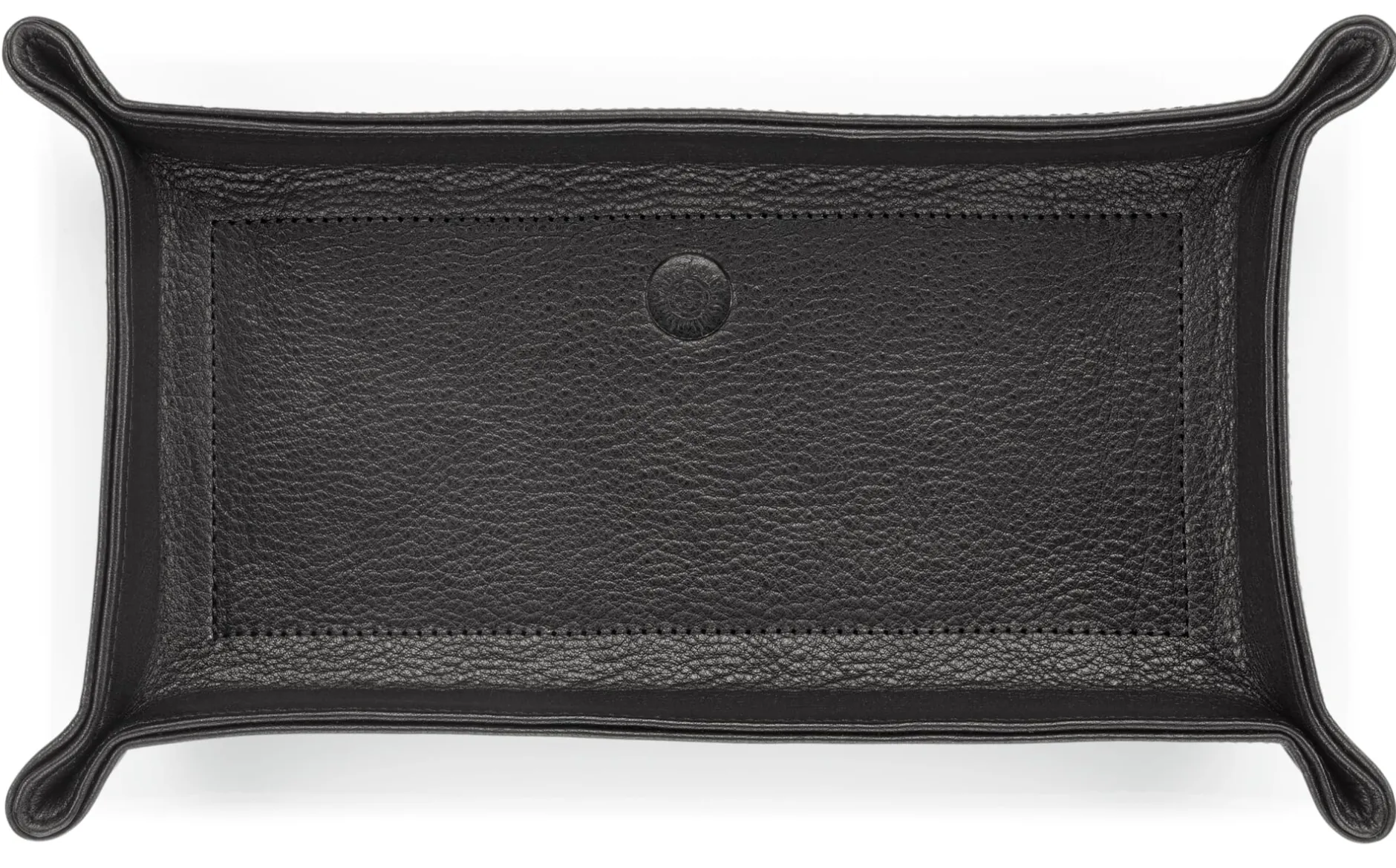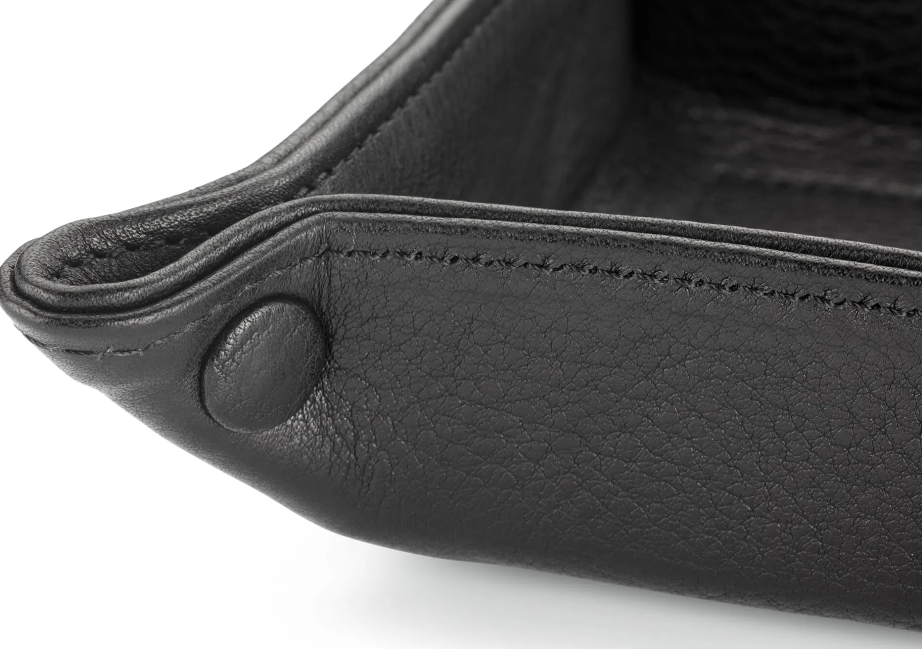 Schale aus zwei Schichten vegetabil grubengegerbtem Rindleder, Herkunft Deutschland. Ungefärbt bzw. im Fass schwarz durchgefärbt. Lederbezogene Niete (Messing vernickelt) an allen vier Ecken. Hergestellt in Ungarn.