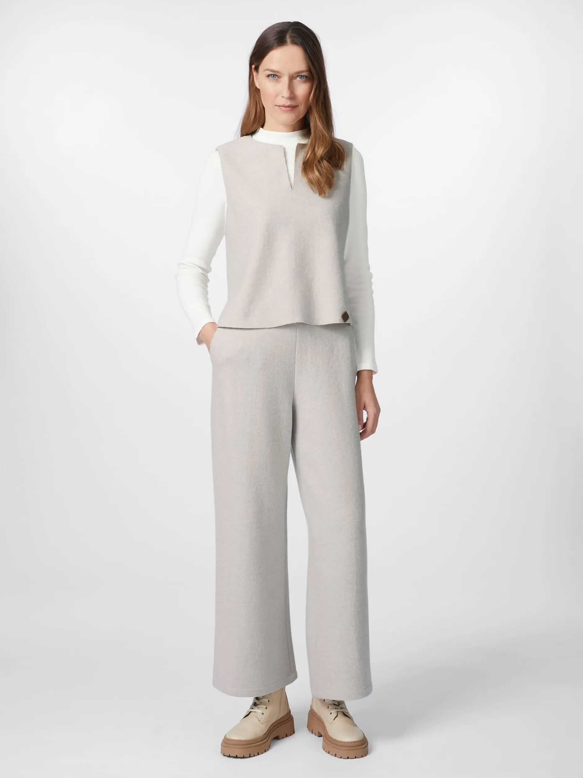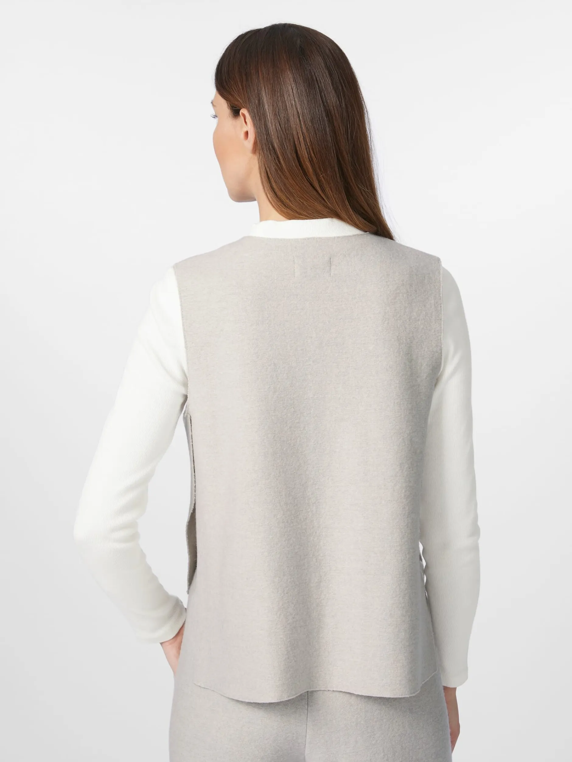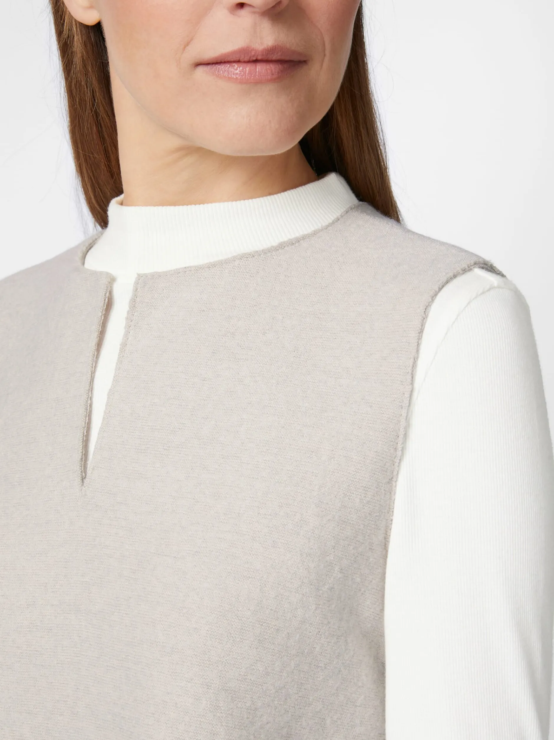 Strickpullunder in lockerer Passform – ein schönes und bequemes Basisstück für die Übergangszeit, das sich vielseitig kombinieren lässt, zu legeren wie zu eleganten Outfits. Das Gestrick besteht je zur Hälfte aus extrafeiner Merinowolle und kontrolliert biologisch angebauter Baumwolle. Das verleiht ihm besonders schmiegsame, wärmende und temperaturausgleichende Eigenschaften. Ausgestattet ist der Pullunder mit geschlitztem Rundhalsausschnitt. Da er nur am Ärmelausschnitt gefasst ist, ist er seitlich offen und der Saum ist hinten länger als vorn gearbeitet, was ihm eine raffinierte Optik verleiht.