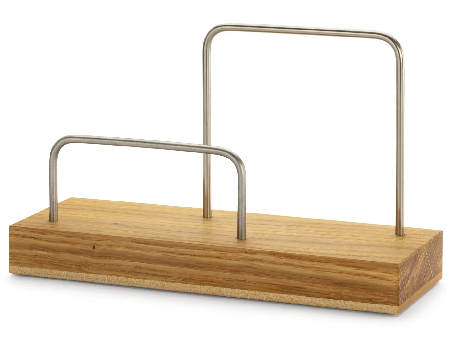 Basis aus geöltem Eichen- und Ahornholz (Herkunft Deutschland und Österreich), Bügel aus Edelstahl. Mit 4 Kunststofffüßchen. Hergestellt in Deutschland.