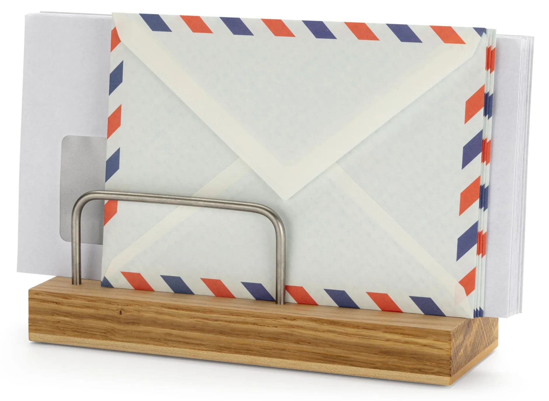 Dieser Briefsammler gehört zu einer Reihe Schreibtischutensilien aus geöltem Eichen- und Ahornholz, die im bayerischen Steinhöring hergestellt werden. In ihren Dimensionen sind sie so aufeinander abgestimmt, dass sich die Einzelelemente kombinieren lassen. Als einfache, geradezu minimalistisch gestaltete Objekte passen sie auf den „Clean Desk“ ebenso wie auf den kreativ-chaotischen Schreibtisch. Folgt der Briefsammler gestalterisch der Idee des „weniger ist mehr“, überzeugt er gleichzeitig mit der Kombination der sehr unterschiedlichen Materialien, nämlich Eiche, Ahorn und Edelstahl. Zum Schutz der Schreibtischoberfläche ist er unterseits mit vier Kunststofffüßchen versehen.