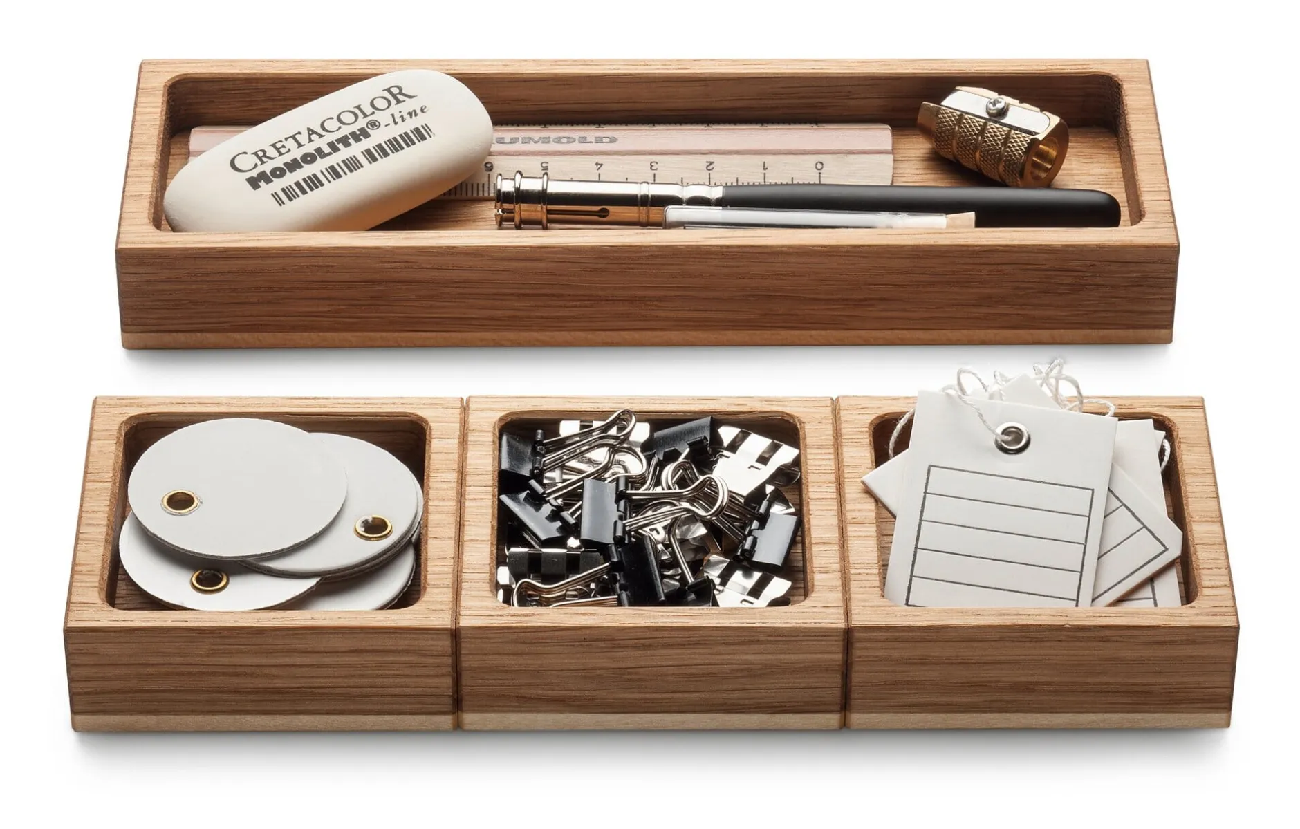 Diese Schreibtischutensilien nehmen auch als gestaltete Objekte Rücksicht darauf: Es sind einfache Ablagen aus geöltem Eichen- und Ahornholz. Sie stammen aus dem bayerischen Steinhöring und sind in ihren Dimensionen so aufeinander abgestimmt, dass sich die Einzelelemente kombinieren lassen. Die kleinere der beiden Stiftschalen mit Griffmulde – ursprünglich für die Präsentation von Schreibgeräten im Schreibwarenhandel entwickelt – wird in Steinhöring infolge nicht nachlassender Kundenanfragen nach unseren Maßgaben gefertigt. Sie bringt die Idee des „weniger ist mehr“ gänzlich auf den Punkt und nimmt ein einziges, mithin das am liebsten und häufigsten benutzte Schreibgerät auf. Alle Ablagen sind für den Schutz der Schreibtischoberfläche mit jeweils vier Kunststofffüßchen versehen.