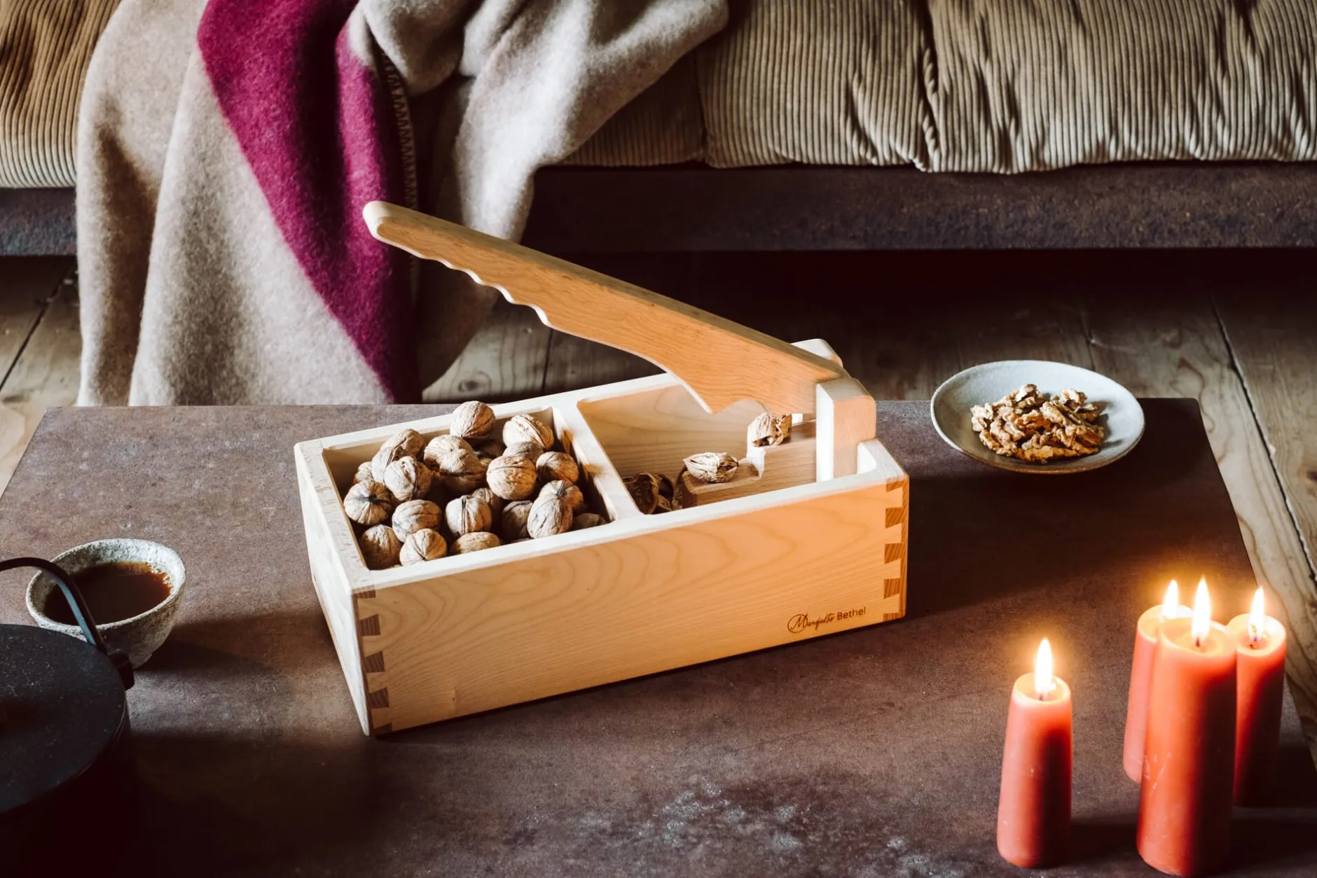 Aus gedämpftem und geöltem Buchenholz. Seitenwände Ahornholz geölt. Bodenplatte Birkensperrholz geölt. Drehgelenk aus Stahl. Höhe 15 cm, Länge 34 cm, Breite 17 cm. Gewicht 1,7 kg. Nicht für Mandeln oder Pecannüsse.