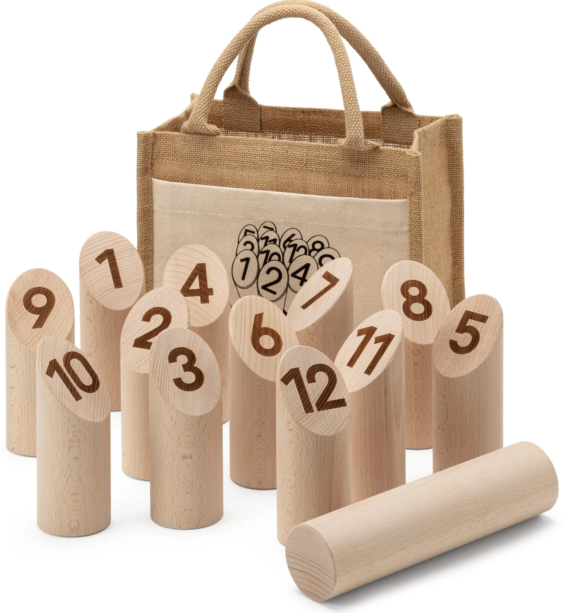 Massives Buchenholz unbehandelt. 12 nummerierte, abgeschrägte Kegel, jeweils Länge 14,5 cm, Ø 6 cm. 1 Wurfholz, Länge 22,5 cm, Ø 6 cm. Gesamtgewicht 3 kg. In einer Aufbewahrungs- und Transporttasche aus 100% Jute.