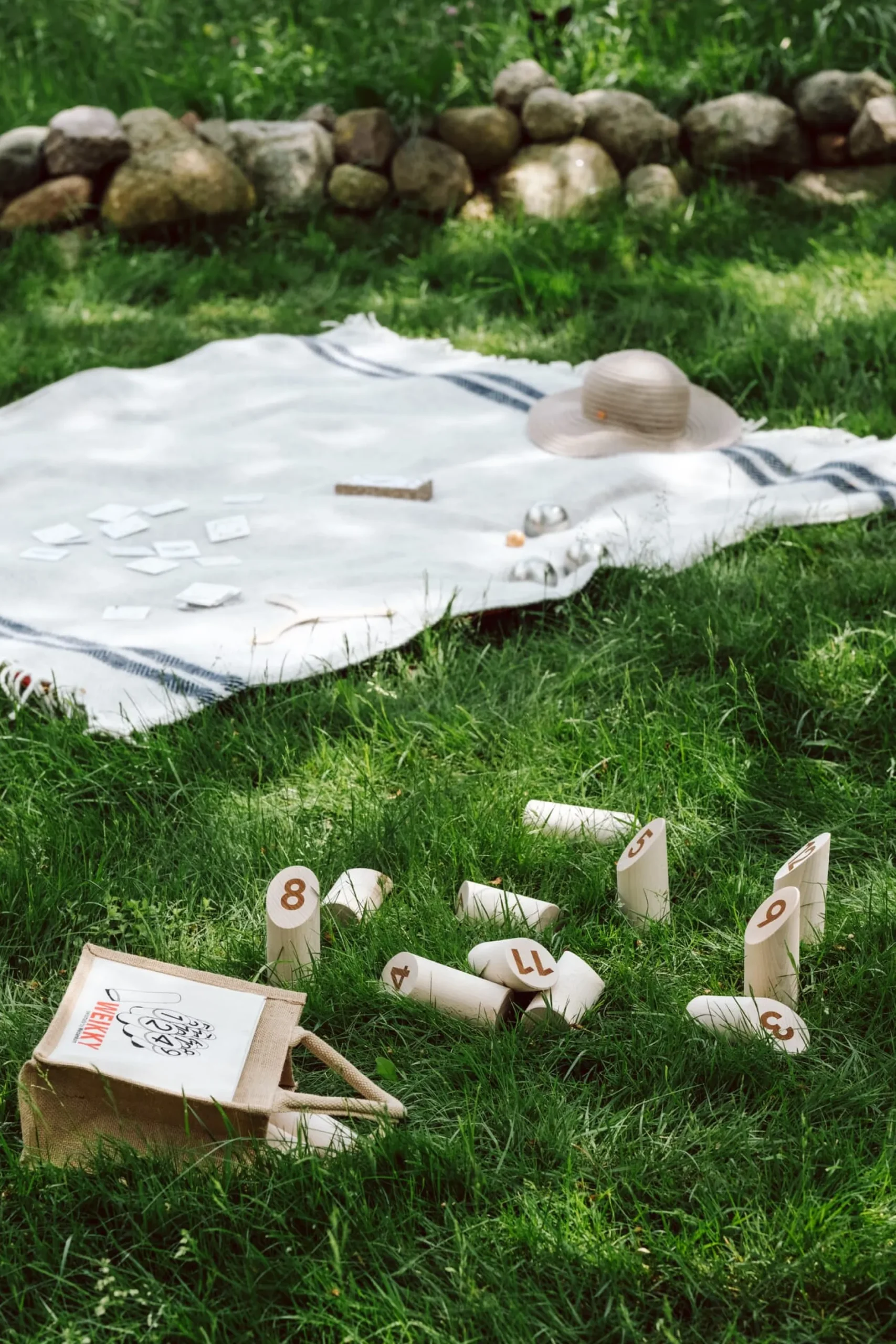 Werfen, Treffen, Punkte zählen – darum geht es beim Weikky. Am Anfang steht, wie so oft, die Ordnung. Zwölf nummerierte Holzkegel werden in festgelegter Gruppierung dicht an dicht aufgestellt. Mithilfe des Wurfholzes müssen die Holzkegel umgeworfen werden – vorgeschlagen sind drei bis vier Meter Entfernung, doch natürlich kann der Abstand gemäß Alter und Wurfkraft der Mitspielenden variiert werden. Um Punkte zu erzielen, genügt es nicht, die Kegel zu treffen, oh nein. Die getroffenen Kegel müssen auch möglichst schwungvoll umfallen – denn nach dem Punktezählen werden sie an just der Stelle wieder aufgestellt, auf die ihre Spitze zeigt, nachdem sie gefallen, möglicherweise auch geflogen sind. Der Abstand der Kegel zueinander und die Spielfläche vergrößern sich also mit jedem Wurf und Treffer – und damit auch der Schwierigkeitsgrad, einen Kegel zu treffen. Fällt nur ein Kegel, wird die Punktzahl gezählt, die in den Holzkegel groß eingraviert und damit dauerhaft lesbar ist. Bei allem Siegeswillen werden Sie sich also nicht mit kaum zu entziffernden Zahlen aus Ihrer Trefferquote herausargumentieren können. Fallen dagegen mehrere Kegel, wird deren Anzahl addiert. Vielleicht möchten Sie sogar Ihre eigene Ergebnisformel entwerfen, doch welche Variante Sie auch wählen: Exakt 50 Punkte, nicht mehr, nicht weniger, muss in Summe erzielen, wer siegreich aus dem Spiel hervorgehen will. Sollten Sie mit Ihrem (vorerst) letzten Treffer über diesen Punktestand hinausschießen, werden Sie auf 25 Punkte zurückgesetzt und dürfen sich erneut an die 50er-Marke heranpirschen … ach nein, heranwerfen. Ein gutes Auge, ein koordiniert kraftvoller Wurfarm und eine geschickte (Zahlen-)Strategie sind also erforderlich, um als Sieger*in Einlass in die Ruhmeshalle des Weikky zu finden. Möge das Wurfspiel beginnen!