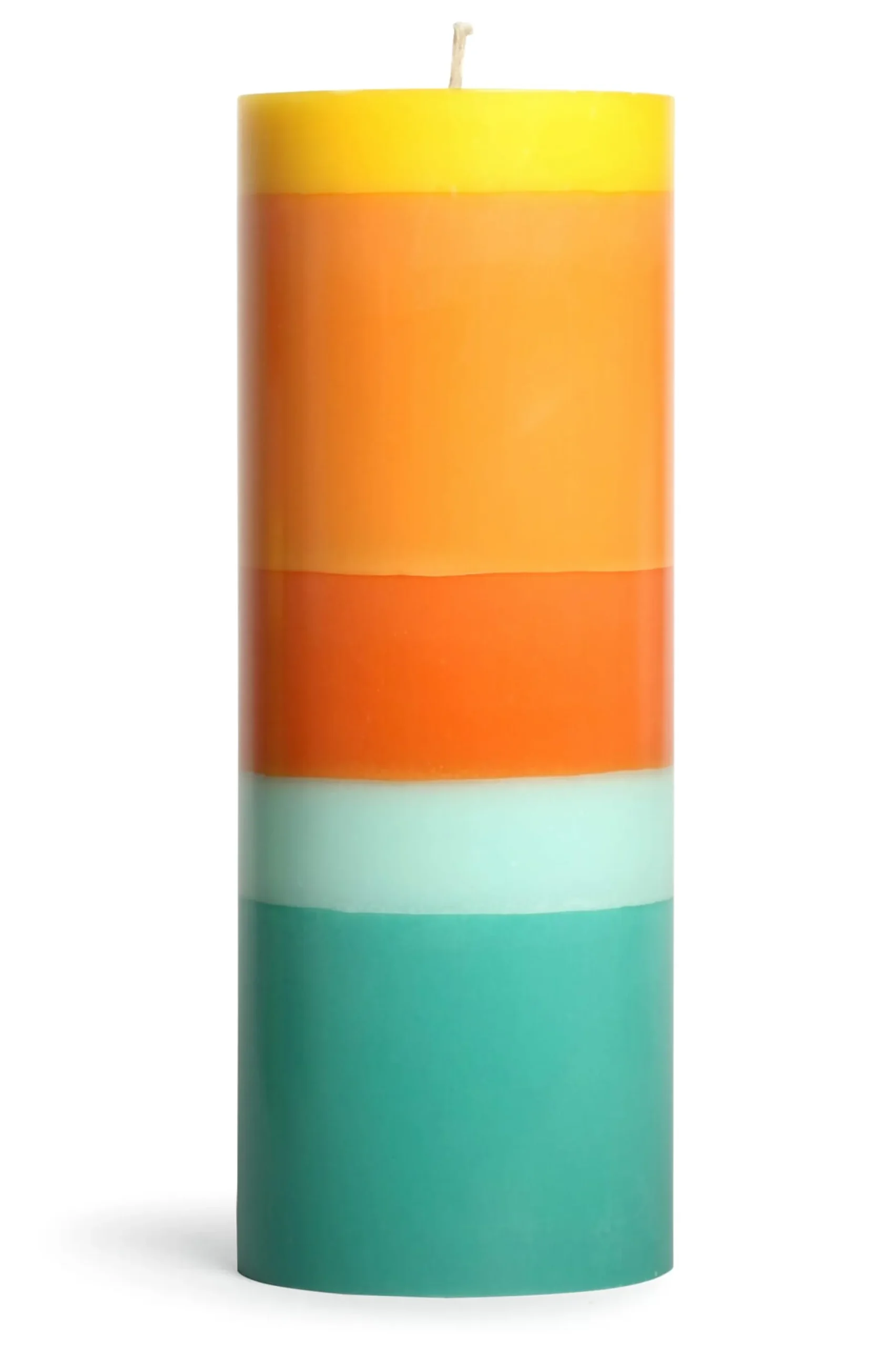 Als Geschenk, Glückwunsch oder kleines Mitbringsel zum Kaffee bei Freund*innen: Bei dieser zylindrischen Stumpenkerze aus durchgefärbtem, nicht tropfendem Wachs wird Farbschicht für Farbschicht per Hand gegossen. Aus fairem Handel, paraffinfrei, 73 Stunden Brenndauer.