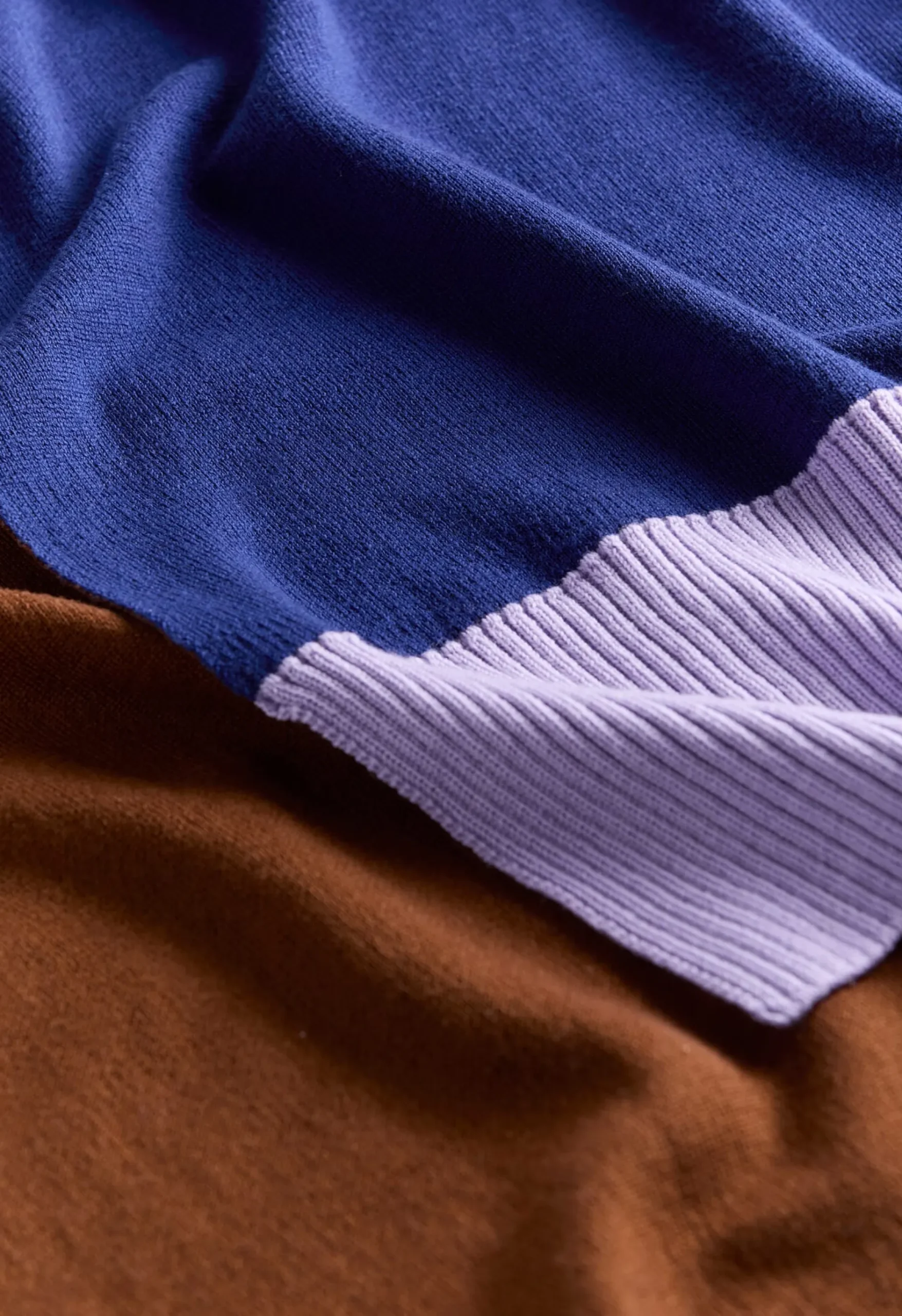 Doppelseitig gestrickte Decke aus 100% Merinowolle in kräftigen Blockfarben – auffällig mit ihren unterschiedlichen Farben auf beiden Seiten, die gekonnt aufeinander abgestimmt sind. Schönes Detail: Das breite Rippbündchen in kontrastierender Farbe ist beiden Seiten gemein. Ideal für einen entspannten Abend zu Hause oder als farbstarkes Detail am Fußende des Bettes.