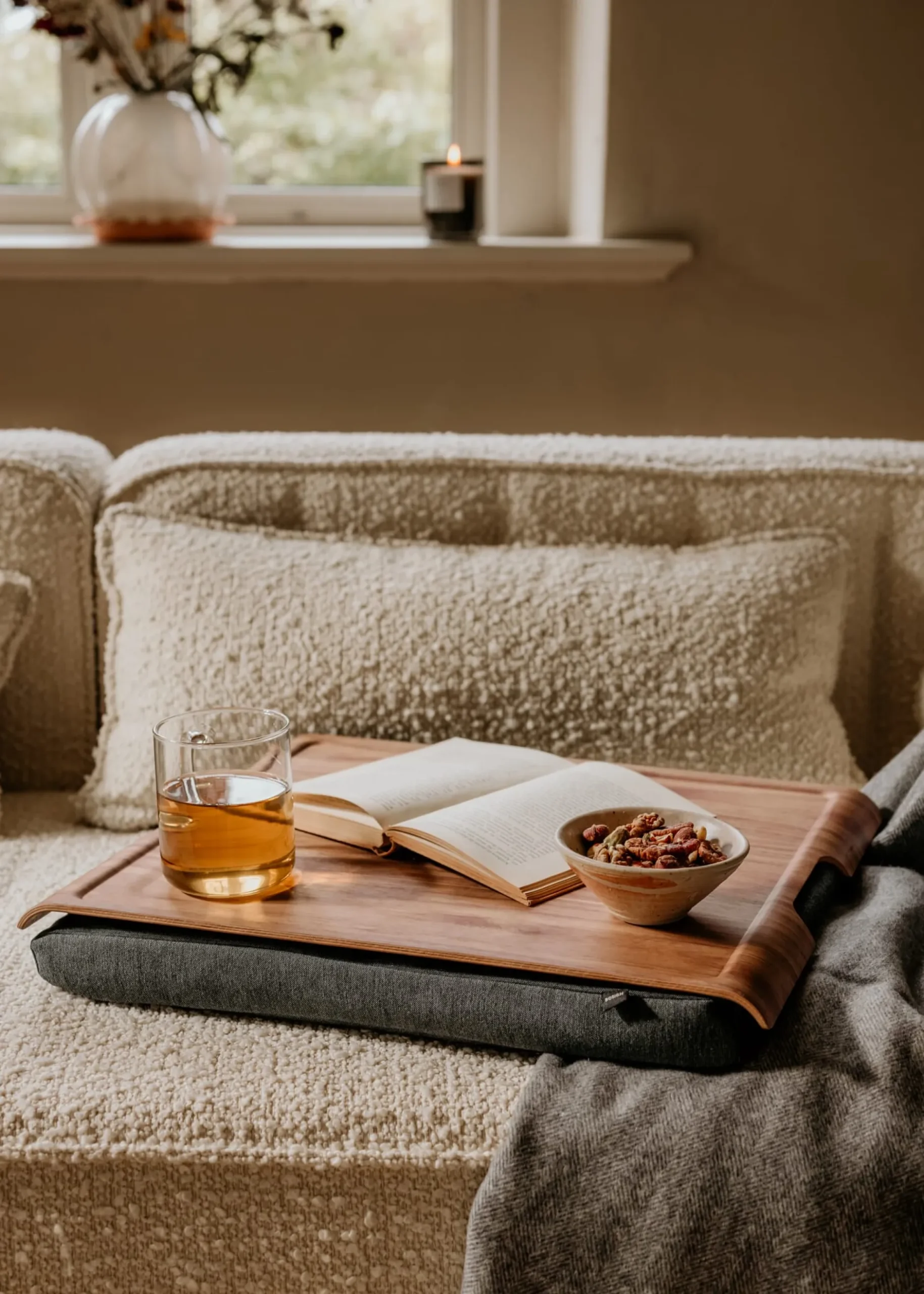 Material: Kissen: Hülle: 100 % Baumwolle, Füllung: Polystyrol; Tablett: Walnuss (Herkunft: China), klar lackiert