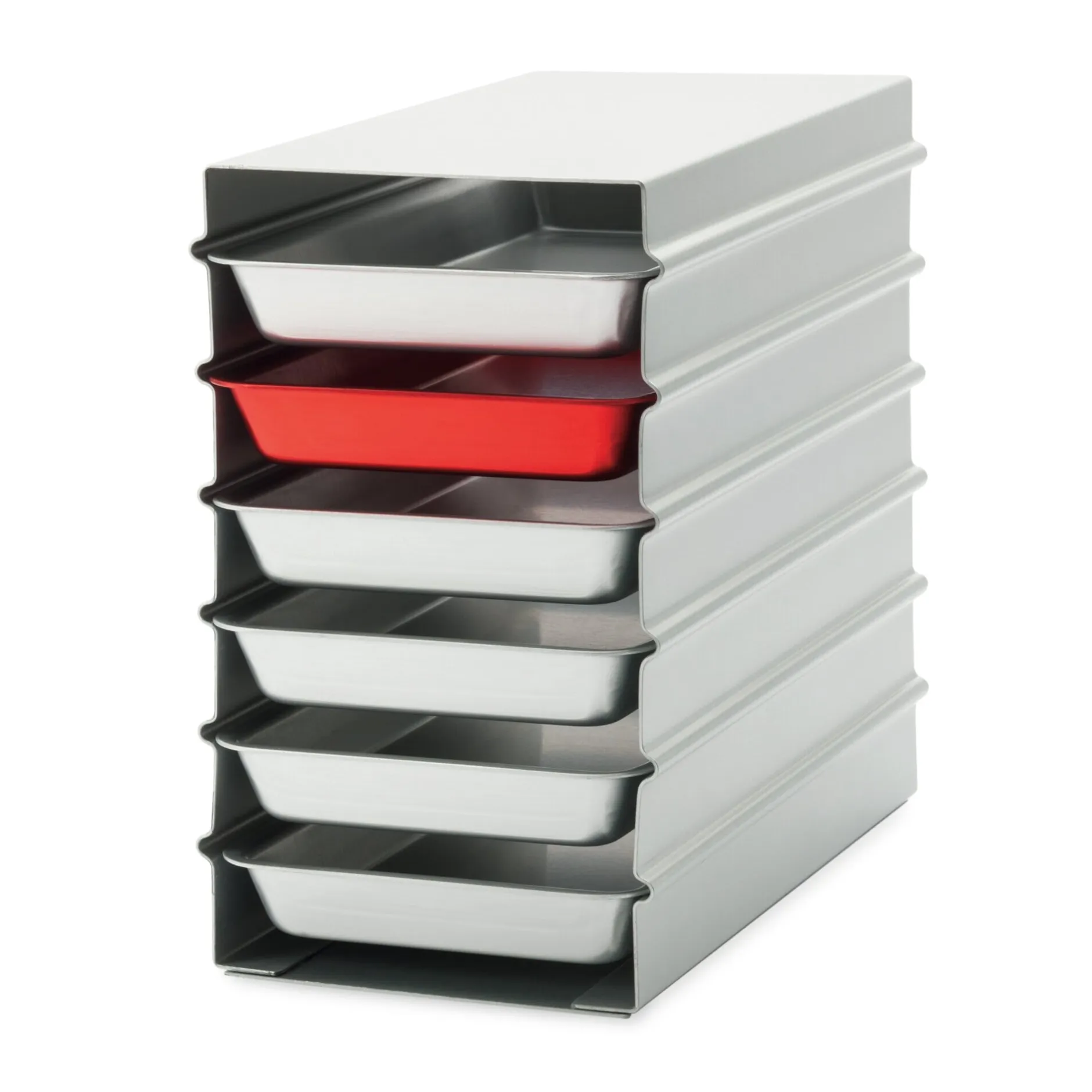 Sie werden aus eloxiertem Aluminium in zwei verschiedenen Größen und zweckmäßigen Formaten gefertigt. Wir liefern die Box jeweils ausgestattet mit sechs Tabletts. Das rot eloxierte Teil lässt dabei die ganz wichtigen Utensilien vermuten. Die Tabletts laufen leichtgängig in den ausgeformten Führungen der Boxen. Die angebotenen Formate unterscheiden sich nur in der Breite und lassen sich in Höhe und Tiefe formschlüssig miteinander kombinieren.