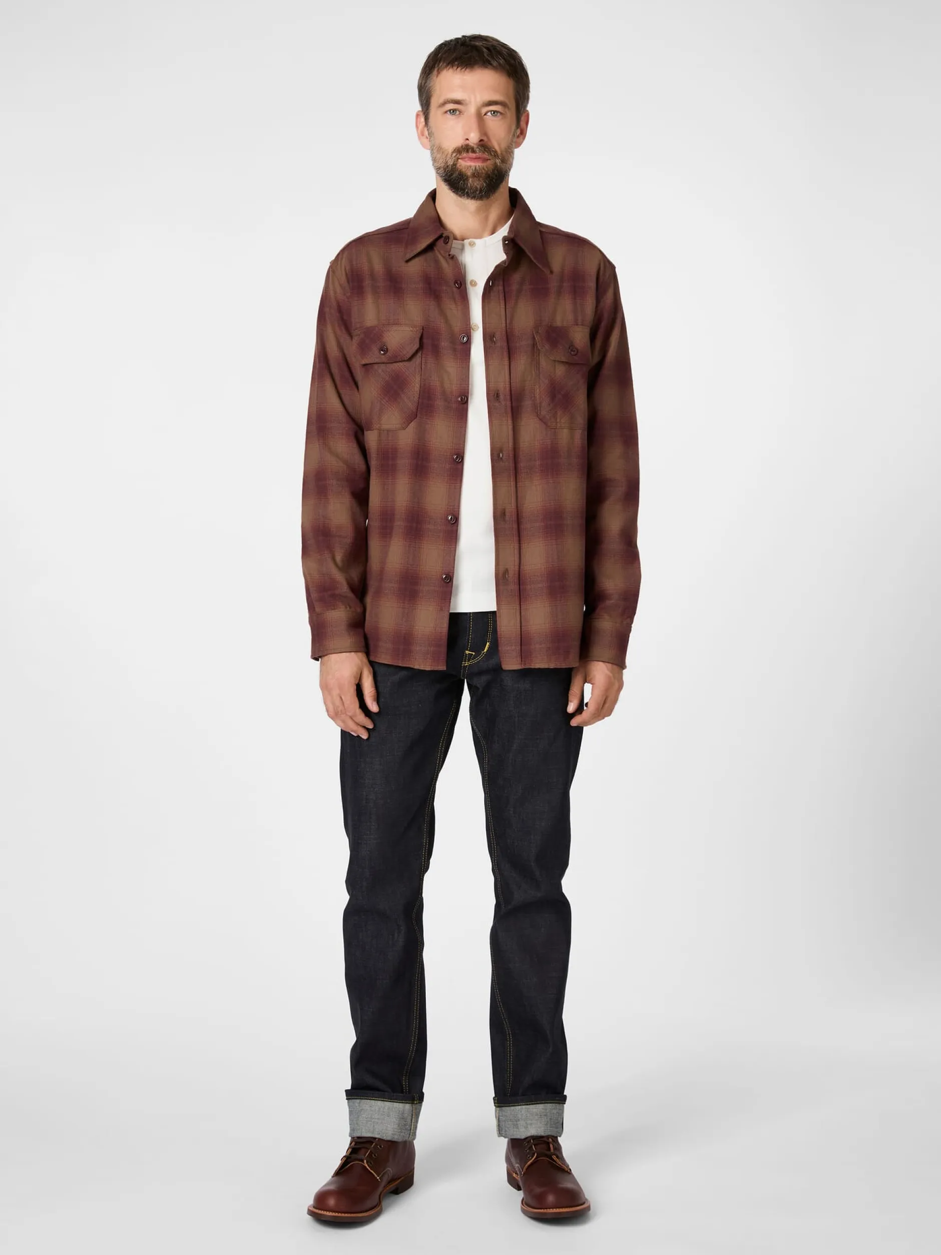 In großflächigem Karo gemustertes Hemd aus weichem, wärmendem Baumwollflanell. Sein Schnitt bietet Bewegungsfreiheit, die geräumigen Brusttaschen mit geknöpften Patten nehmen unverzichtbare Kleinteile des täglichen Bedarfs auf. Das Hemd ist mit Kentkragen gearbeitet, an den Taschen liegt das Karomuster diagonal.