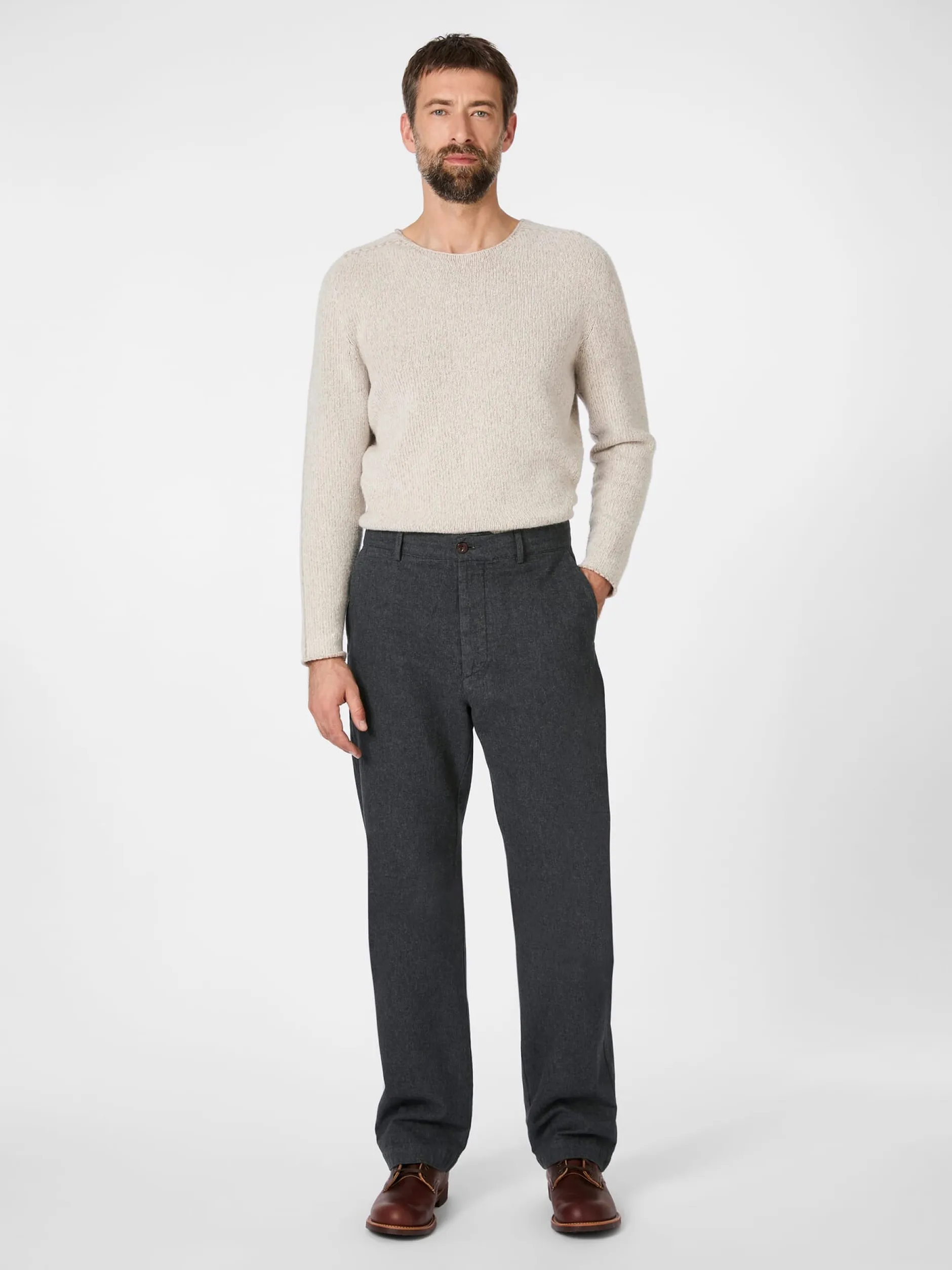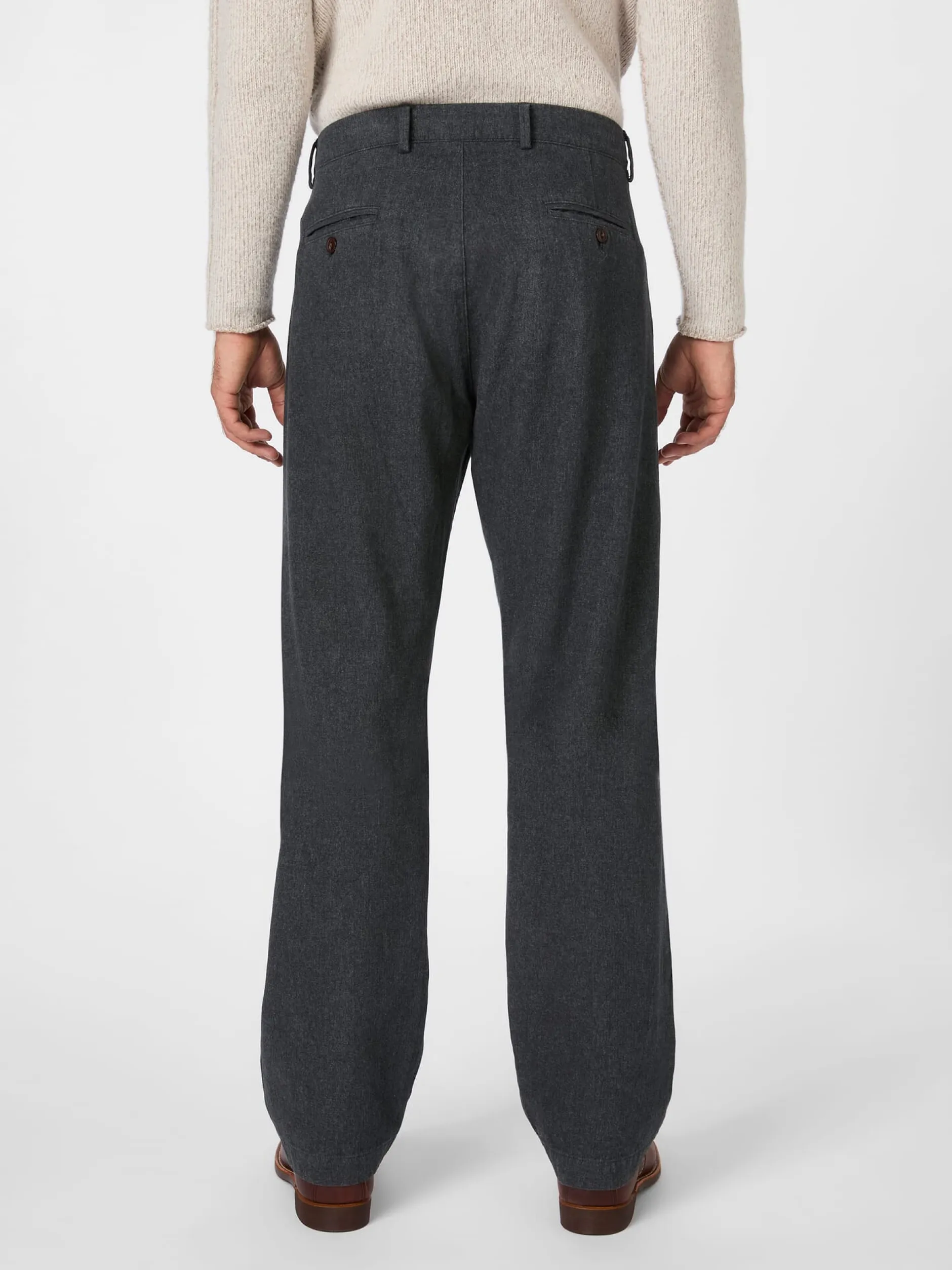 Aus einem eher leichten Moleskin italienischer Provenienz konfektioniert Tellason diese Hose mit geradem Bein. Das dichte Gewebe mit feinem Fischgratwebbild ist geschmirgelt und angeraut, wodurch es weich, griffig und auch bei kühler Witterung angenehm zu tragen ist. Die Hose wird mittels Knopfleiste und Knopf geschlossen. Sie ist mit Seitentaschen, einer kleinen Münztasche und zwei eingesetzten, geknöpften Gesäßtaschen ausgestattet.