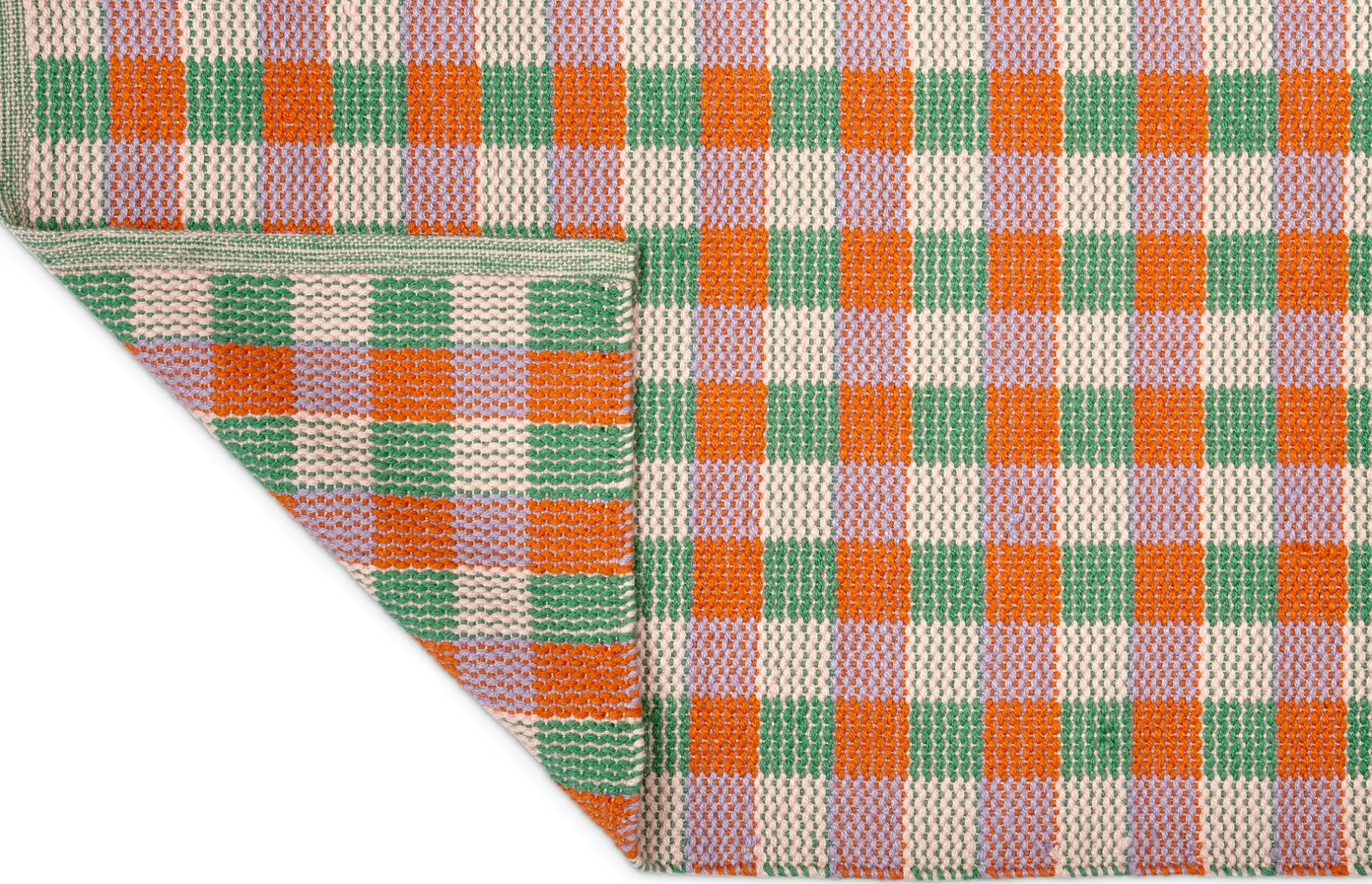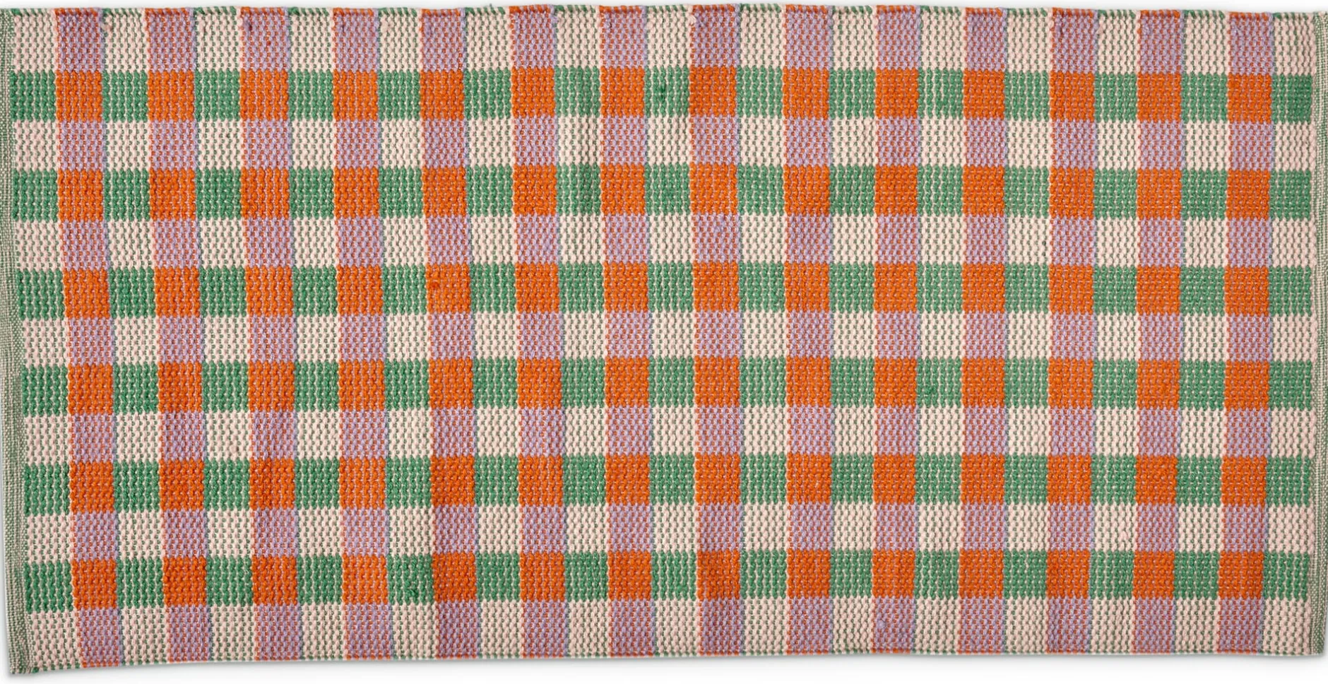 Kleiner, pflegeleichter Teppich für drinnen und draußen in auffälliger Farbkombination: Lila, Orange und Grün. Mit seinen Abmaßen von 70 x 140 cm eignet sich diese Variante ideal für Flure, Badezimmer, Küchen, Balkone oder kleine Terrassen. Dank des weichen Gewebes ist Barfußlaufen nicht nur möglich sondern auch angenehm.