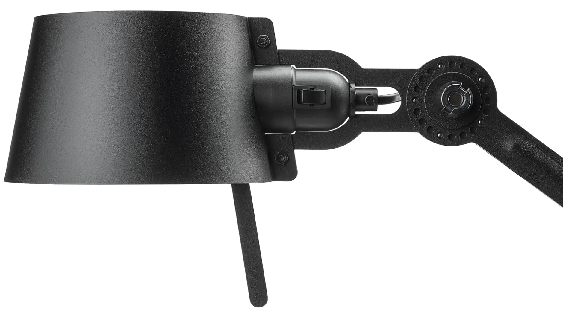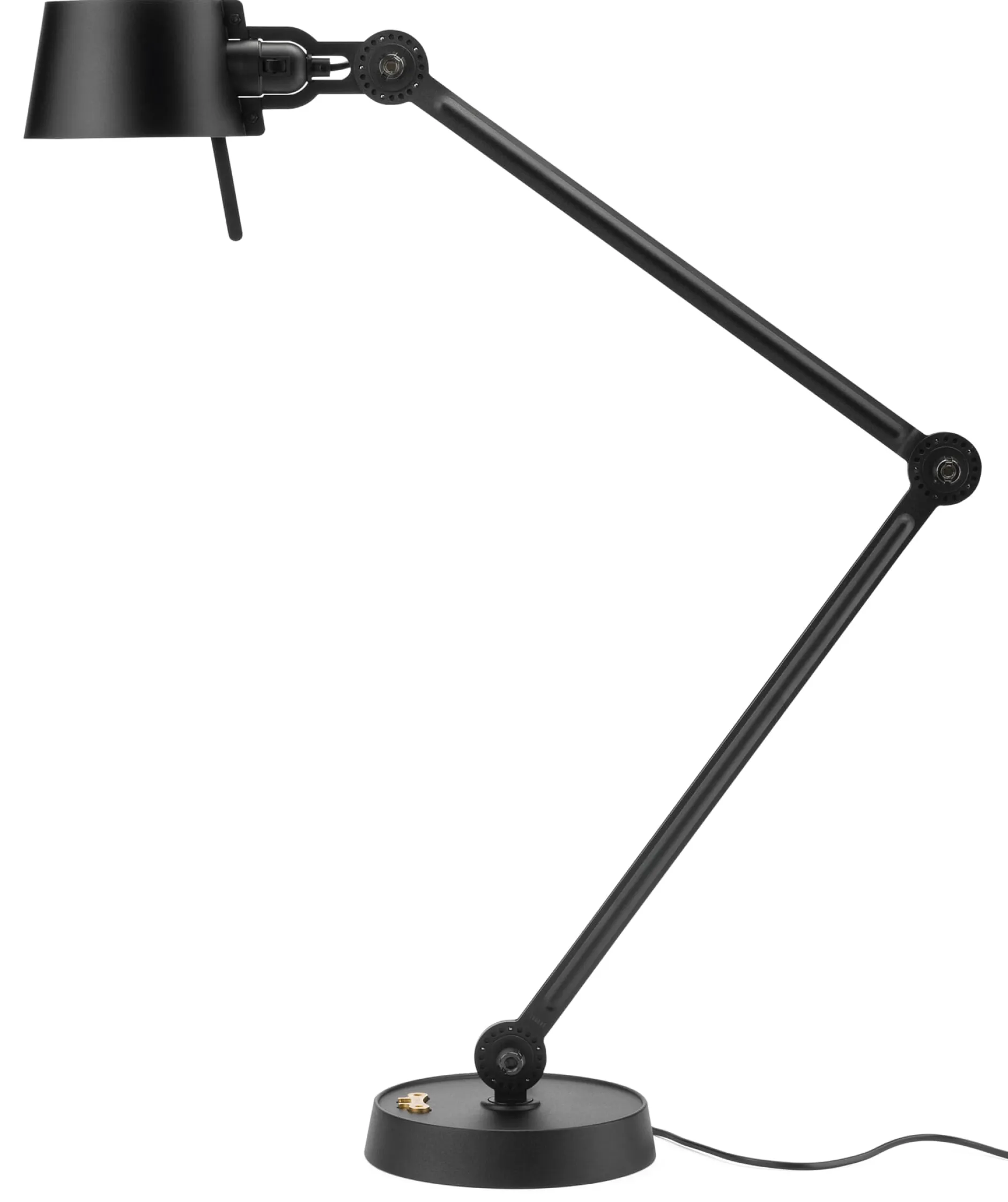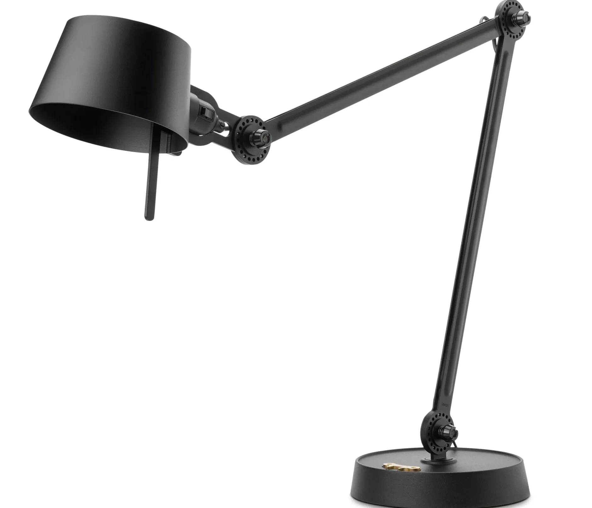 Puristisch, klar und funktional sind die Leuchten der Serie Bolt. Alle Modelle bestehen aus immer wiederkehrenden, identischen Teilen. Das beginnt beim schweren, in Belgien gefertigten Standfuß aus Gusseisen und reicht bis zu den Armsegmenten aus Stahl, die wie der Leuchtenschirm aus Aluminium mit einer gut reflektierenden Pulverbeschichtung überzogen sind. Jedes Gelenk ist dank fünf Stahlkugeln zwischen zwei Lochscheiben mit 23 Löchern vielfach verstellbar – jedoch nur in Winkeln, die weder die Finger quetschen noch die Leuchte zum Kippen bringen können. Der mitgelieferte Stellschlüssel ist eine Reminiszenz an alte Industrieleuchten. Die Leuchtenschirme sind oben und unten offen, so dass sie nach unten gerichtetes Licht auf die zu beleuchtende Fläche werfen und nach oben zur indirekten Raumbeleuchtung beitragen. Die Serie Bolt wird über einen Druckschalter geschaltet, der sich unmittelbar außerhalb des Schirms an der Fassung befindet.
