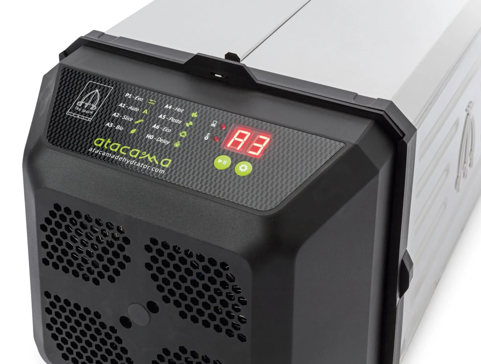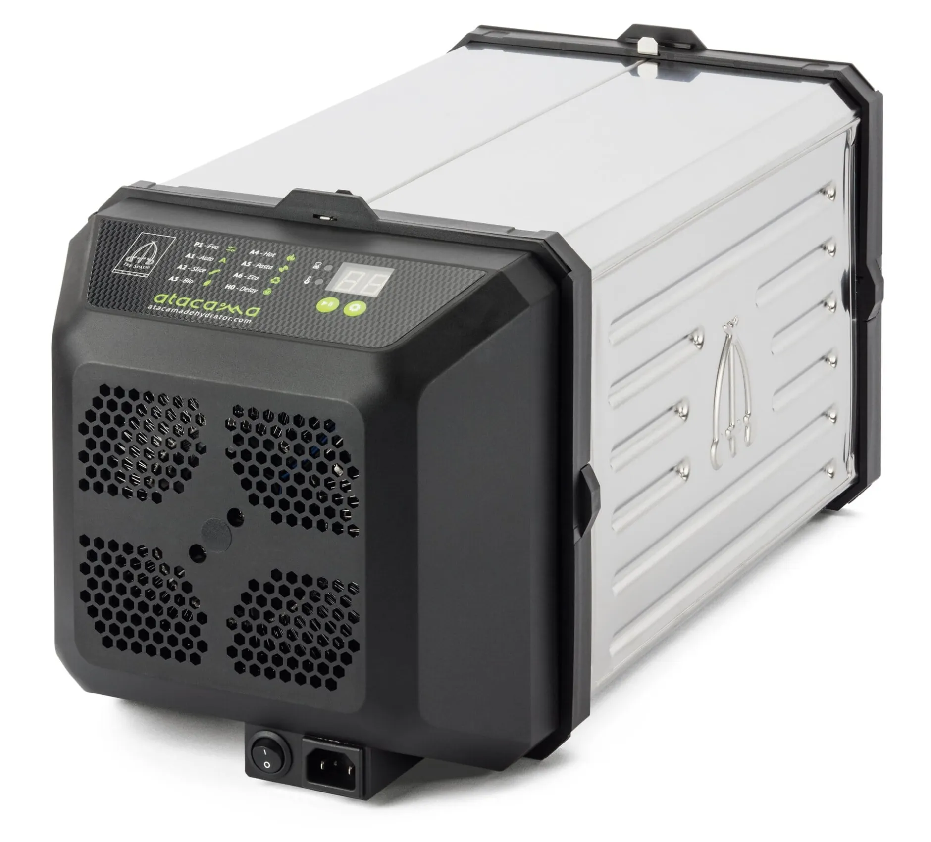 Dieses ist das Nachfolgemodell unseres italienischen Dörrgerätes von Tre Spade in Mailand. Im Vergleich zum Vorgänger hat eine Sache sich geändert: Der Motorblock ist jetzt nach außen gelegt und lässt das Gerät ein wenig raumgreifender erscheinen. Seine Vielseitigkeit ist ihm aber geblieben: Im Rohkostmodus kann bei 40 °C wirklich schonend getrocknet werden. Obst, Gemüse, Kräuter, Samen und Pilze lassen sich so in hoher Qualität konservieren (auch für die hauseigenen Instantbrühen), Fruchtleder und Getreideprodukte herstellen oder hausgemachte Pasta, Baiser und Backwerk trocknen.