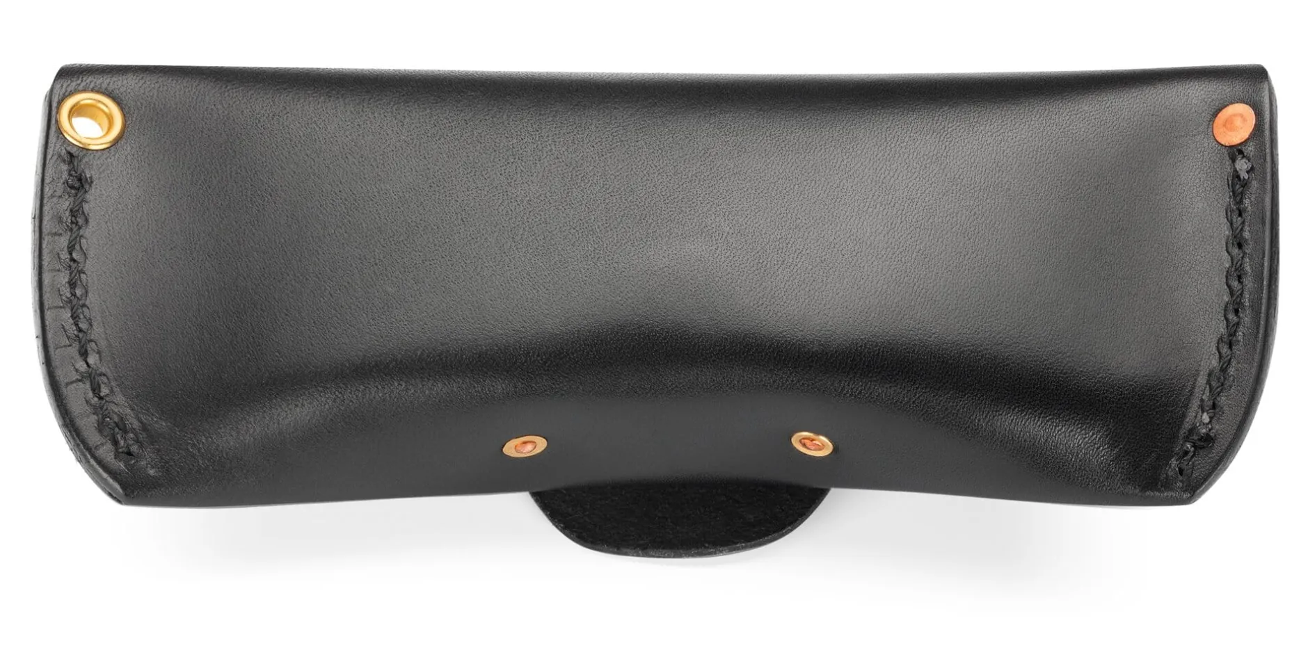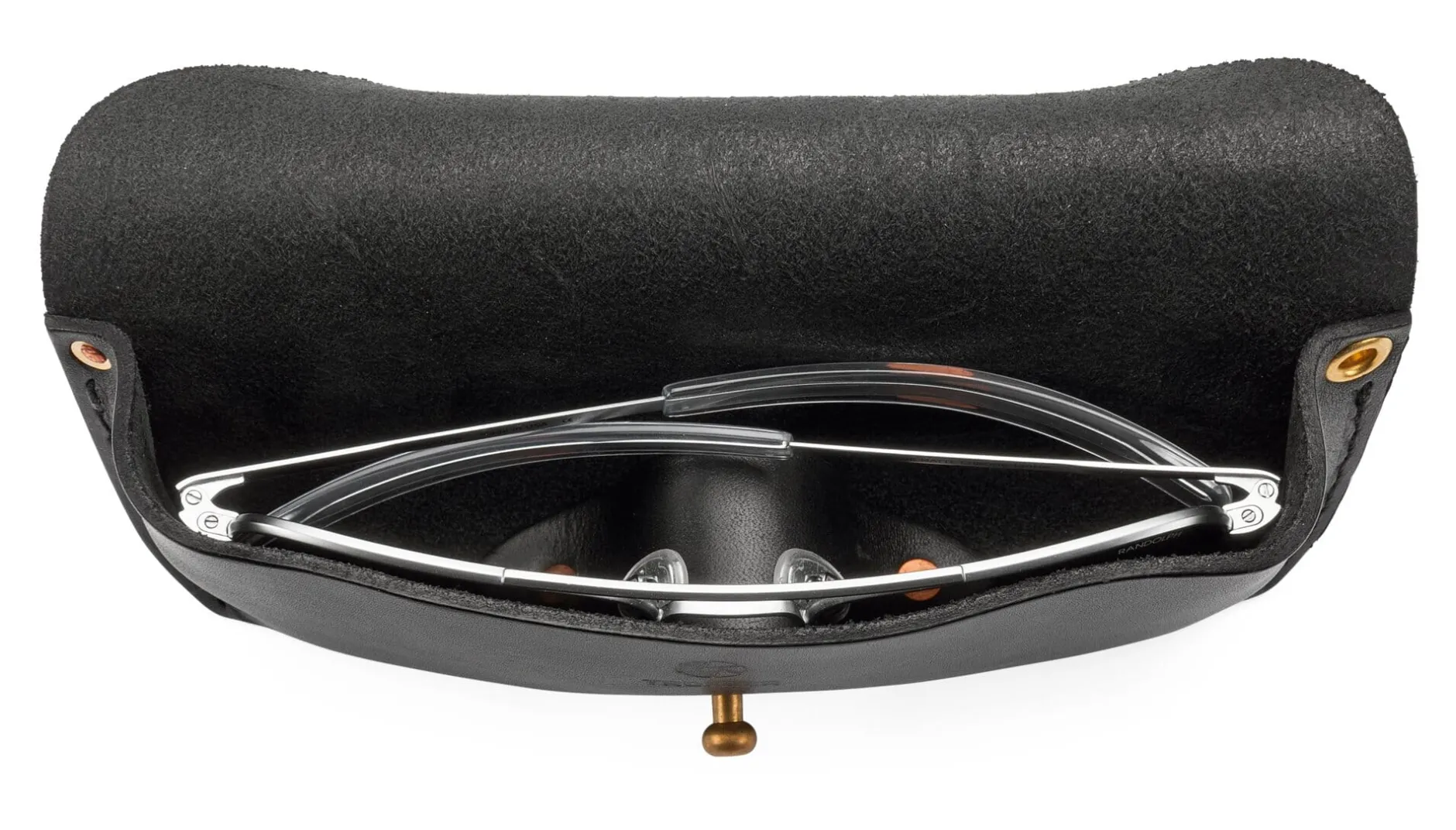 Ein kleines Kunststück ist es, in einer ledernen Hülle fragilen Inhalt vor Stößen und stärkerem Druck gut zu schützen, selbst für solch ein stabiles Brillenetui, das aus ca. 2,5 mm starkem, robustem Rindleder gefertigt ist. Ausnahmsweise nicht auf der Hand, sondern auf der Nase liegt die Lösung für diese Herausforderung – einfach, aber effektiv: Im Innern des Etuis ist im Boden eine „Nase“ vernietet. Dieser feste, wie ein Nasenrücken gewölbte Ledersteg gibt der Brille nicht nur Halt, sondern fungiert vor allem als Abstandhalter und stabilisiert das Etui, wenn es mit Patronentaschenknopf verschlossen wird. Solide vernäht, bewahrt es auch bei stärkerer Beanspruchung Form und Inhalt. Und zugleich ist es geräumig genug, um auch ausladendere Modelle von (Sonnen-)Brillen aufzunehmen. Die Stahlöse am Übergang vom Etuikörper zur Verschlusslasche erlaubt es, ein (Trage-)Band zu befestigen.