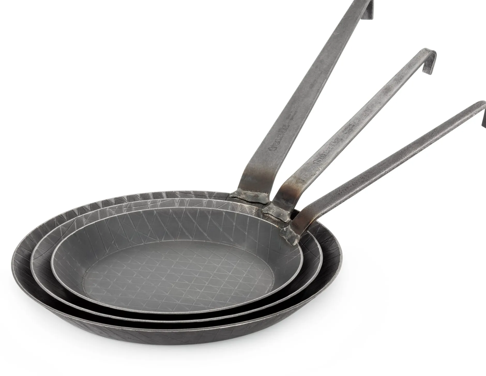 Schwere, unverwüstliche schmiedeeiserne Pfannen mit geschmiedetem, angeschweißtem Hakenstiel. Materialstärke 2,6 mm.