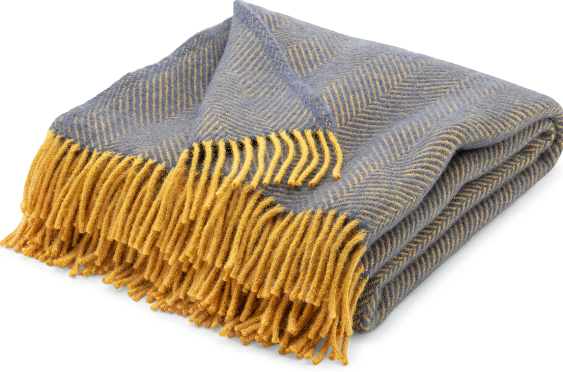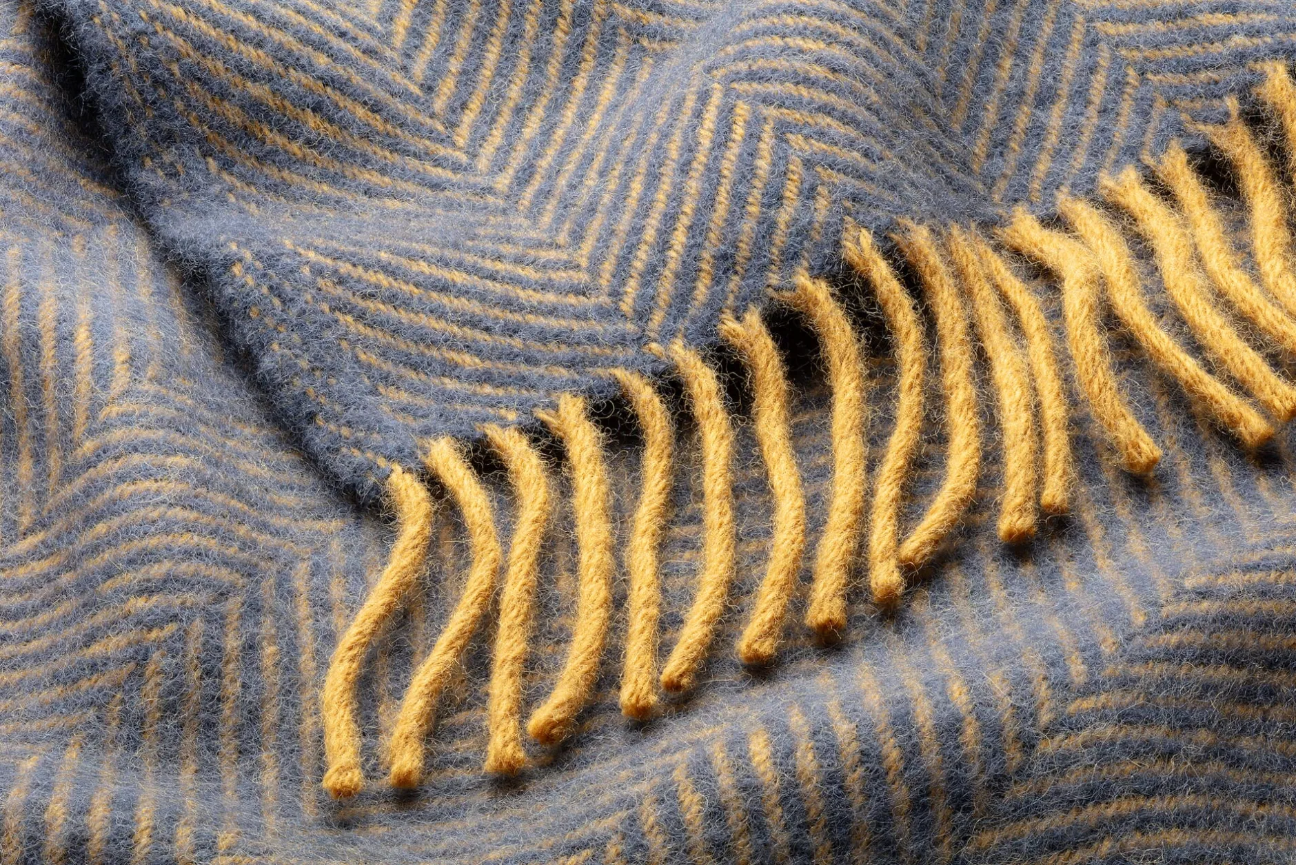Das im Grunde dezente Fischgratmuster wird hier auffällig in Szene gesetzt, denn Tweedmill kombiniert die zurückhaltenden, dunkleren Farbtöne im Schuss mit einem kräftig-goldgelben Garn in der Kette, weshalb auch die Fransen Goldgelb sind. (Der Hersteller nennt den Farbton Mustard, wir meinen, Goldgelb trifft es besser.) In der Oberfläche changieren die Farben leicht und zeigen einen matten, edlen Schimmer. Besonders bei der Kombination mit dem an British Racing Green erinnernden Grünton hatten wir weniger Rennwagen vor Augen als vielmehr englische Landhäuser und royale Salons (und manche auch das bekannte Schoko-Minz-Plättchen, das man empfohlenermaßen nach acht Uhr degustiert). Wenn Sie also Ihrem Wohnzimmer ein wenig britisches Flair verleihen wollen, sind Sie mit dieser Decke sicher gut beraten. Die Schurwolldecke mit dem edlen Fischgratmuster ist daher eher für Sessel und Sofa prädestiniert, wärmt aber natürlich auch an kühleren Abenden auf dem Balkon oder der Terrasse. Tweedmill webt sie aus robuster, neuseeländischer Schurwolle, die tierfreundlich gewonnen wurde, da Mulesing in Neuseeland nicht angewandt wird.