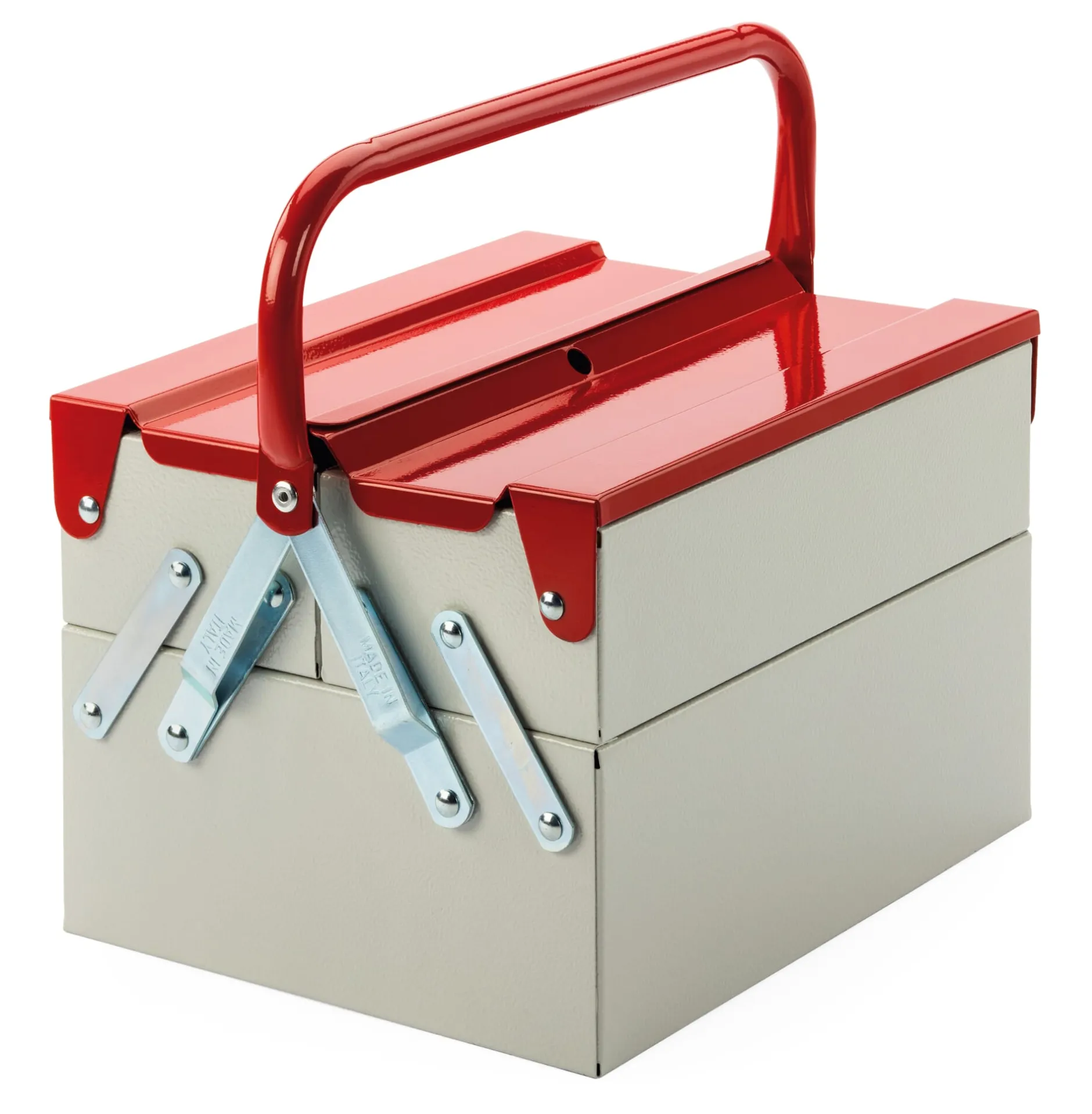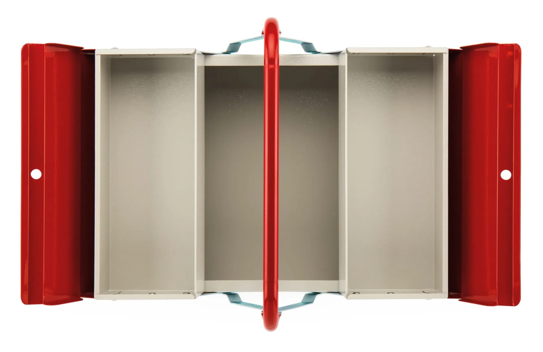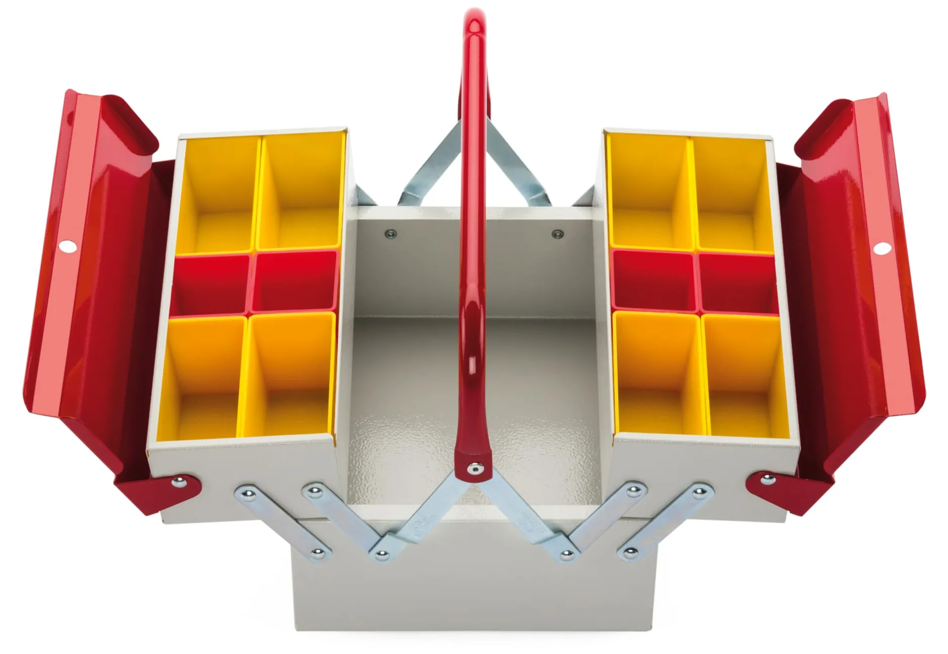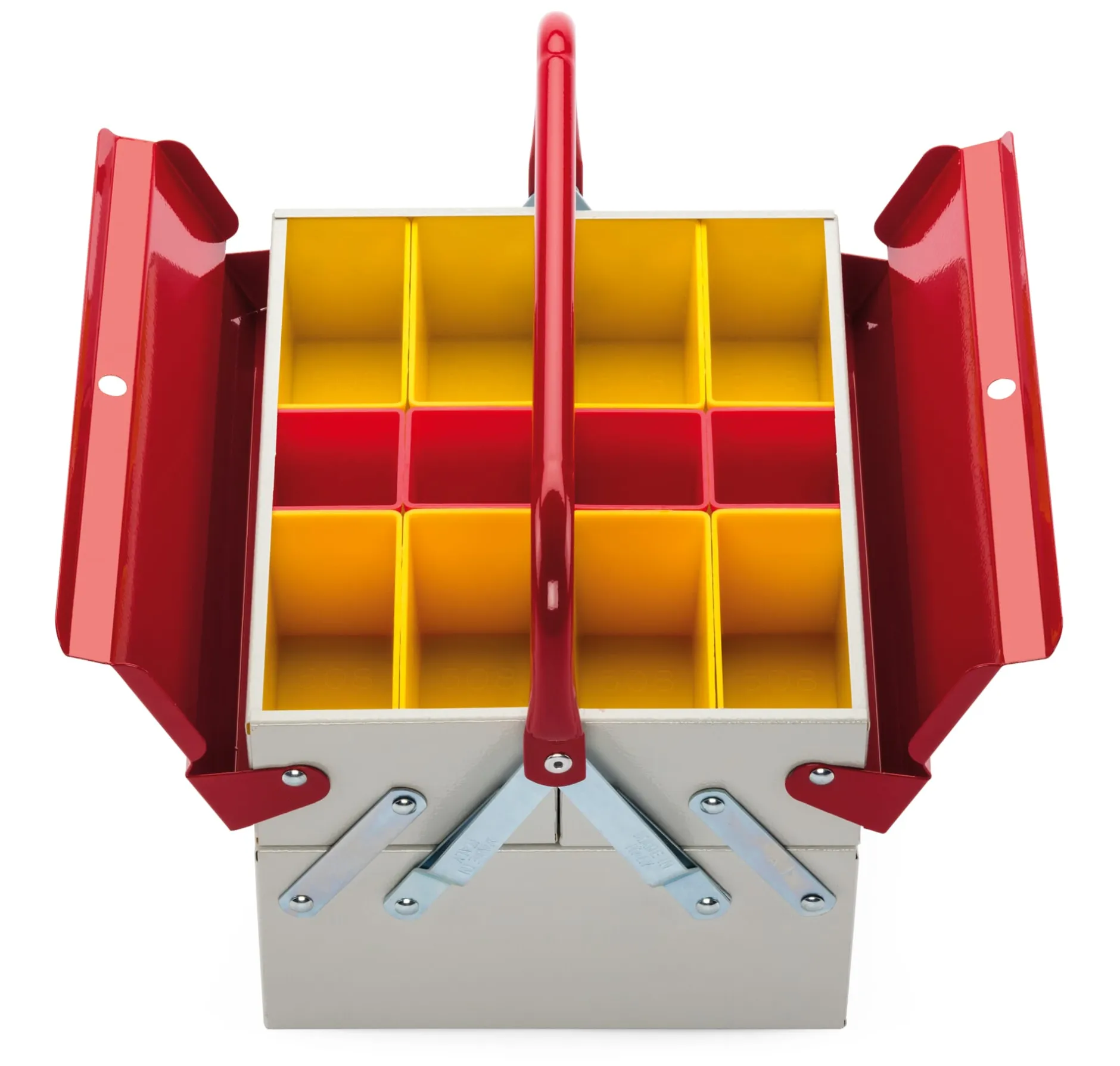 Die amtliche Werkzeugkiste: mit bewährtem Auffaltprinzip, in 1A-Industriequalität und schönen Farbkombinationen. Ungewöhnlich im kleineren Format, auch für Utensilien im Büro, selbst auf dem Schreibtisch und natürlich für Werkzeug in Haushalt und Werkstatt. Mit leicht herausnehmbaren Kunststoffeinsätzen. Belastbar bis 10 Kilogramm.