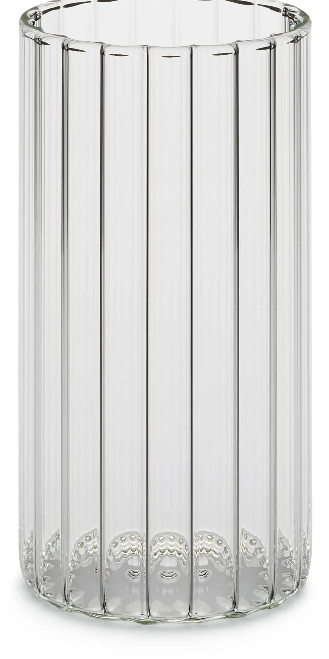 Schön technisch und mit interessantem optischem Effekt: Vasen aus gewelltem, industriell vorgefertigtem Borosilikatglas. Die gläsernen Strangprofile werden in einem handwerklichen Prozess eingekürzt und durch Verschmelzen des Materials verschlossen. Durch die im Innern des Behälters verlaufende Rillung, lassen sich Blumen und Sträuße gut und stabil in Form bringen. Spülmaschinengeeignet.