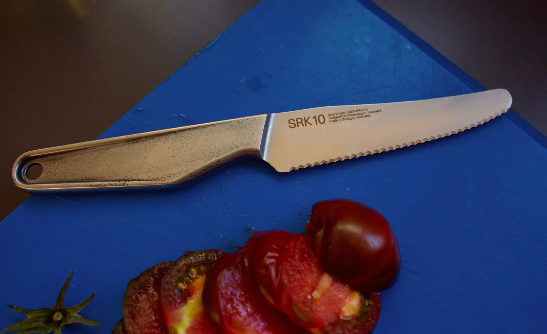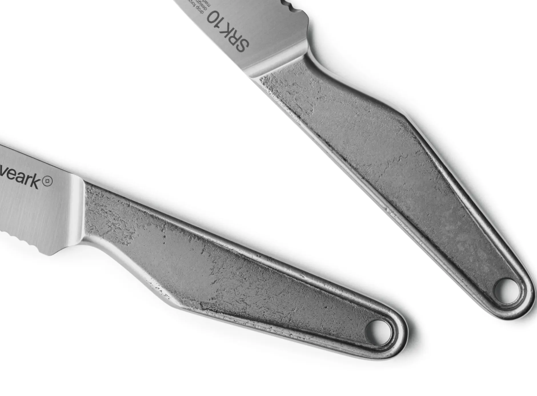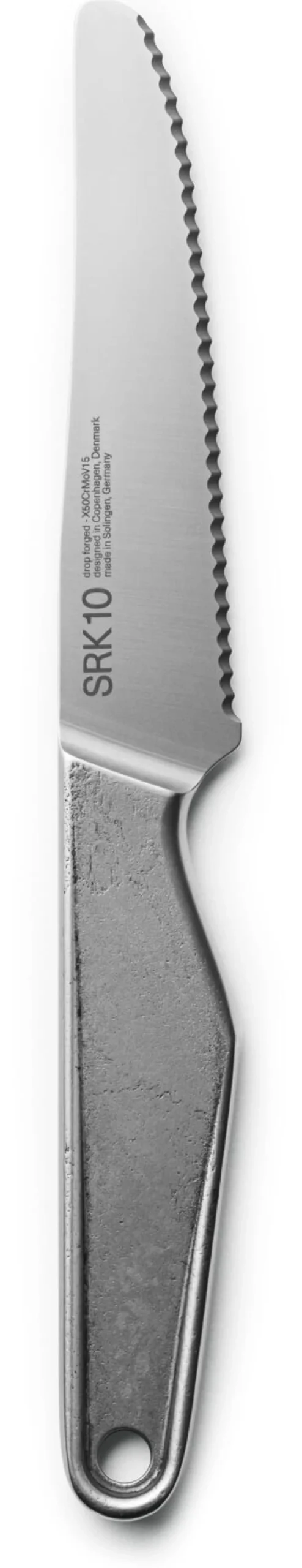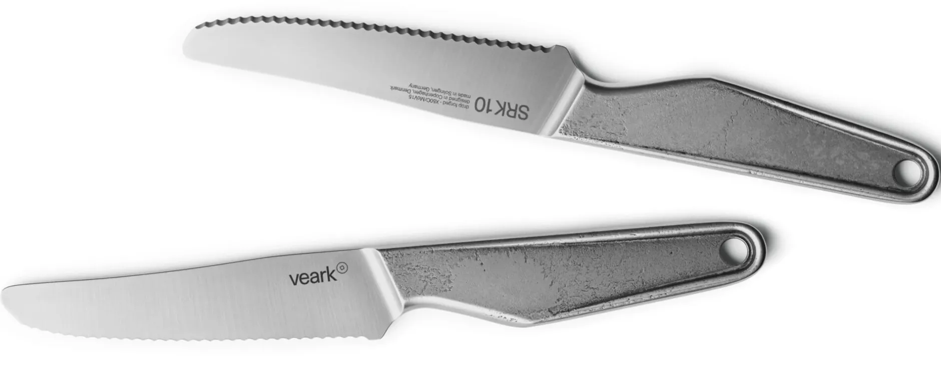 Bildschöne Werkzeuge – beste Arbeitsgeräte. In der Tradition geschmiedeter Metallwerkzeuge. Die Messer von VEARK besitzen eine überzeugende Ästhetik und stehen in ihrer Qualität ihrer Optik nicht nach. Die in Dänemark entworfenen und als Monoblock konstruierten Messer werden in Solingen aus bestem Klingenstahl gesenkgeschmiedet. Dieser Stahl besteht aus den Legierungsbestandteilen Kohlenstoff, Chrom, Molybdän und Vanadium. Das macht die Messer im hohen Maße beständig gegen Korrosion und vor allem lassen sie sich besser und schärfer schleifen, denn sie besitzen eine für Messerstahl überdurchschnittliche Härte von 58 Rockwell. Das bedeutet: Ein härteres Messer kann schärfer geschliffen werden und die geschliffene Klinge hält länger. Damit bleibt die sogenannte Schnitthaltigkeit länger erhalten. Die Messer von VEARK liegen ausgewogen in der Hand, dank ihrer Symmetrie Rechts- und Linkshändern gleichermaßen. Die rohlinghaften, markanten Griffteile haben nicht nur eine einzigartige, industrielle Ästhetik, sondern lassen sich auch gut greifen und handhaben. Schönes Detail: Das Schmiedeverfahren hinterlässt ein individuelles Muster auf dem Griff und macht jedes Messer zum Unikat.
