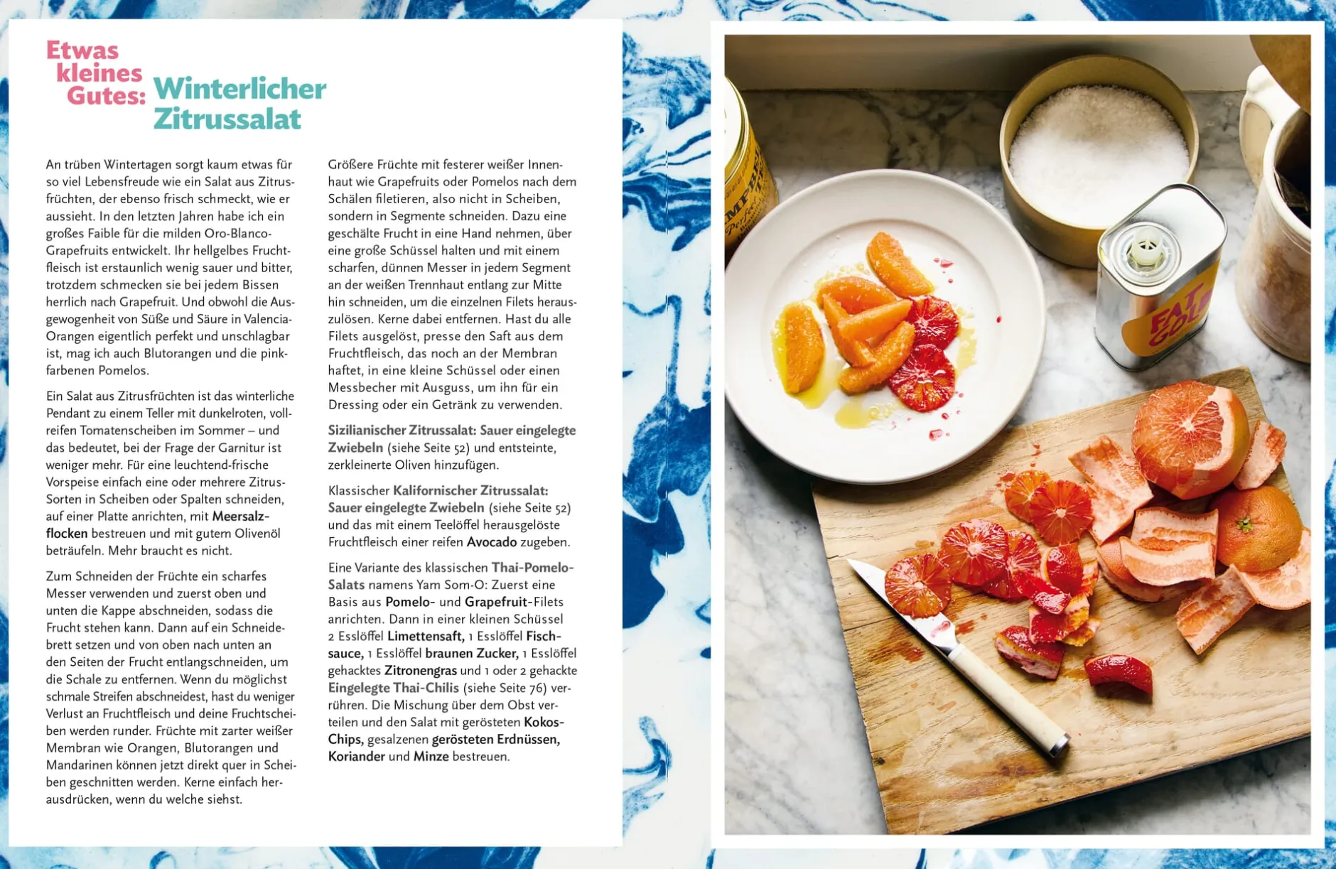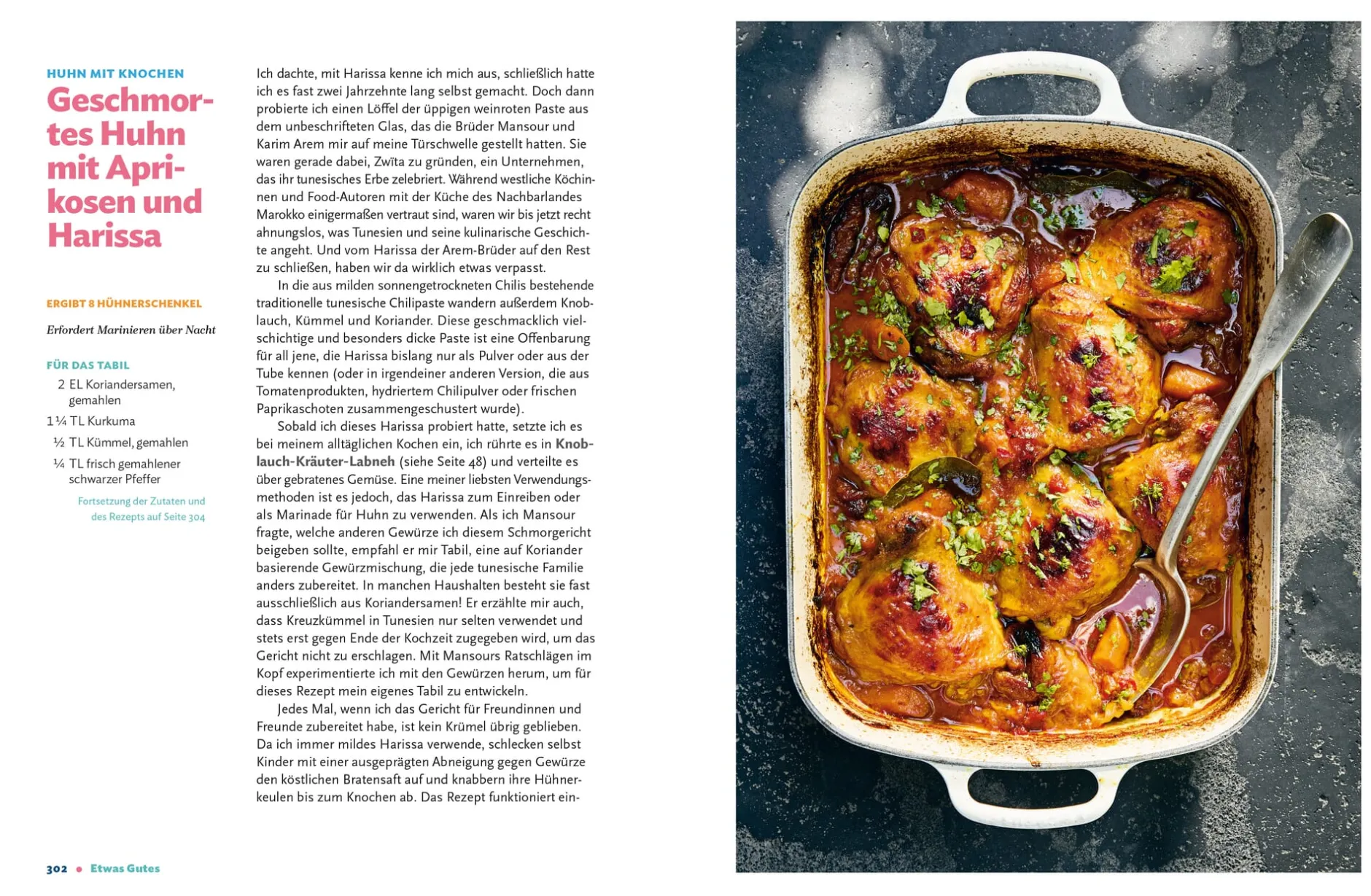 Zudem enthält Etwas Gutes wertvolle Tipps – welche Zutaten man wirklich immer zu Hause haben muss (Zitrusfrüchte! Parmesan! Miso!), wie man Olivenöl einkauft (auf das Erntedatum achten!), wofür man tiefer in die Tasche greifen sollte (nur beste Zutaten fürs Salatdressing!) – und Tricks, die jedes Essen um Klassen besser aussehen lassen.