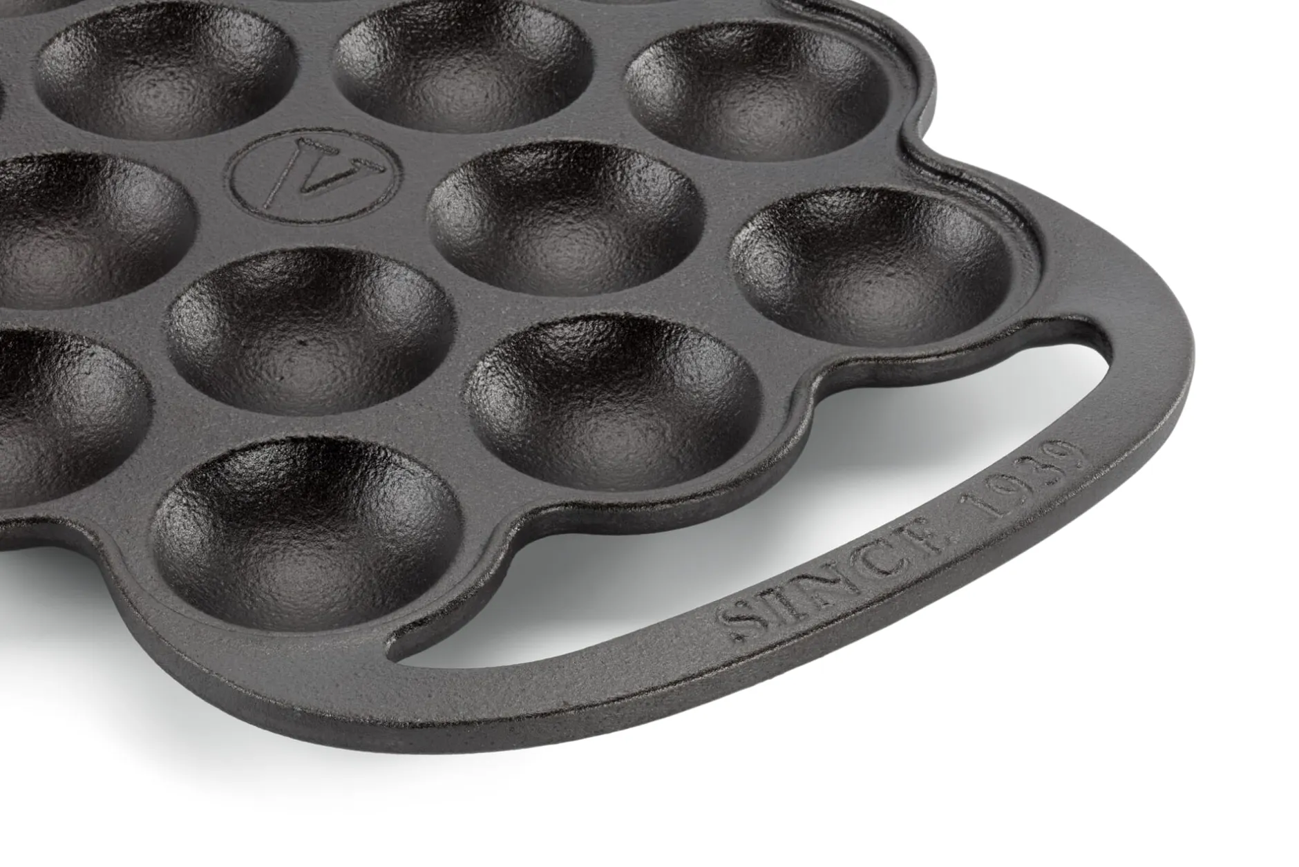 Gusseisen, mit Leinöl eingebrannt (Materialstärke 3,5 mm). Pfanne mit 15 Mulden à 4 cm Ø und 1 cm Tiefe. Randhöhe 1,8 cm. Länge 27 cm, Breite 20 cm. Gewicht 2 kg.