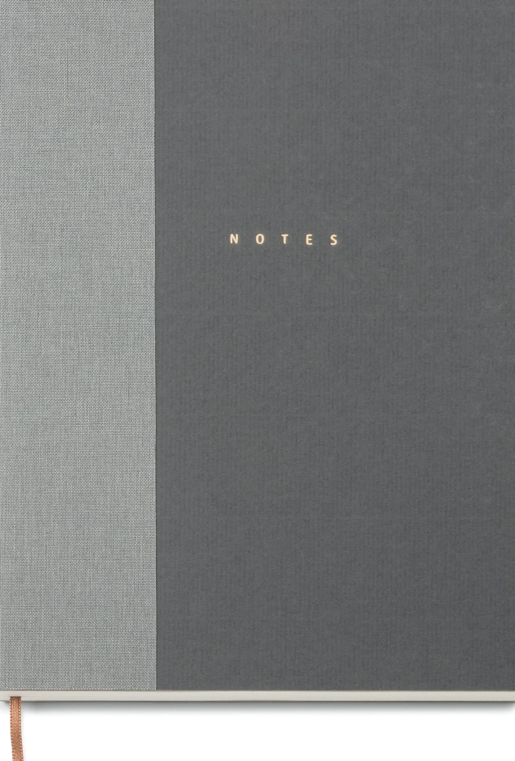 Fadengeheftetes Notizbuch mit Halbleineneinband. Deckel aus durchgefärbtem Karton mit Heißfolienprägung. 15,2 × 20,5 cm. 160 Seiten. Zartweißes, tintenfestes Papier (100 g/qm), Punktraster. Mit Zeichenband. Hergestellt in Polen.