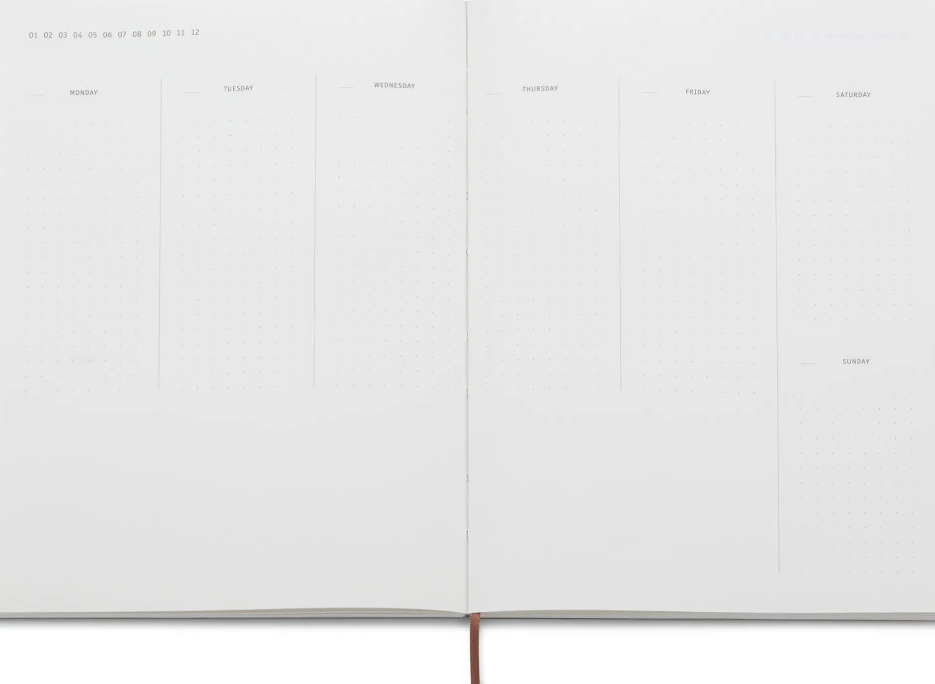 Unprätentiös, ästhetisch ansprechend und buchbinderisch solide gefertigt: Der Wochenplaner mit haptisch angenehmem (und mittlerweile seltenem) Halbleineneinband besteht aus mehreren fadengebundenen Heften, sodass sich die 160 Seiten jeweils gut aufschlagen lassen. Das zartweiße Papier (100 g/qm) mit dezenter Lineatur ist tintenfest, kann also auch mit einem Tintenroller oder Füllfederhalter beschrieben werden.